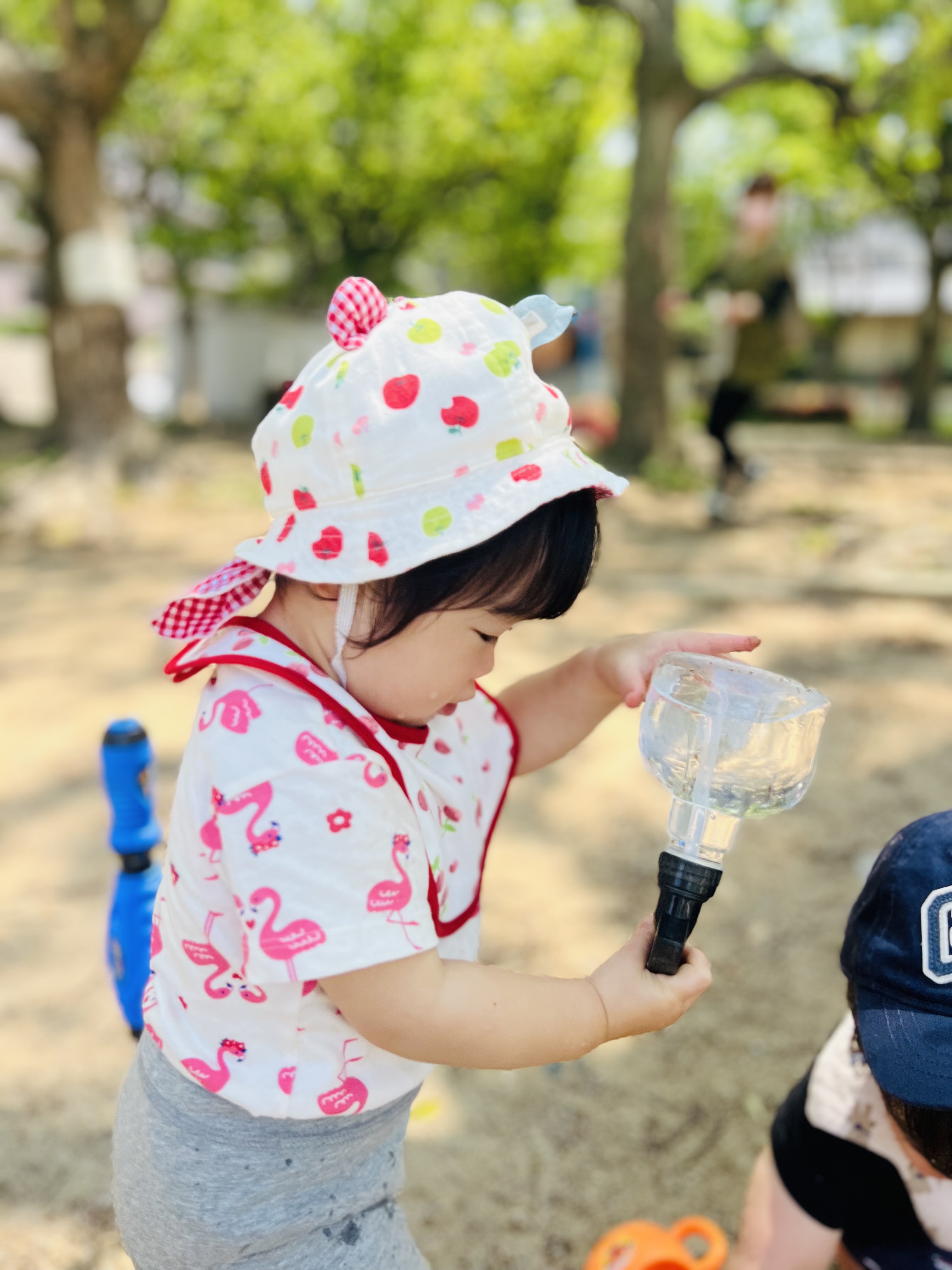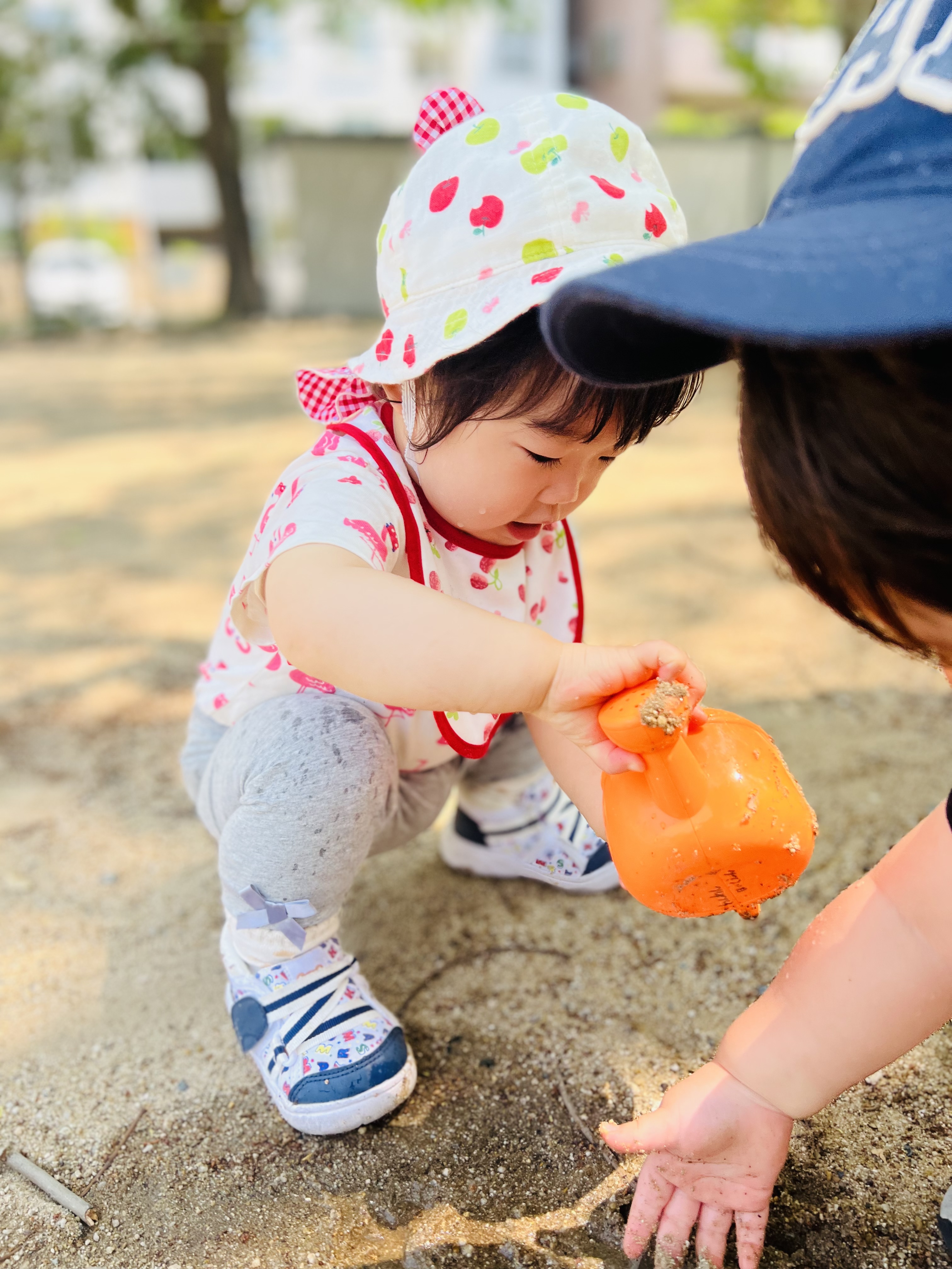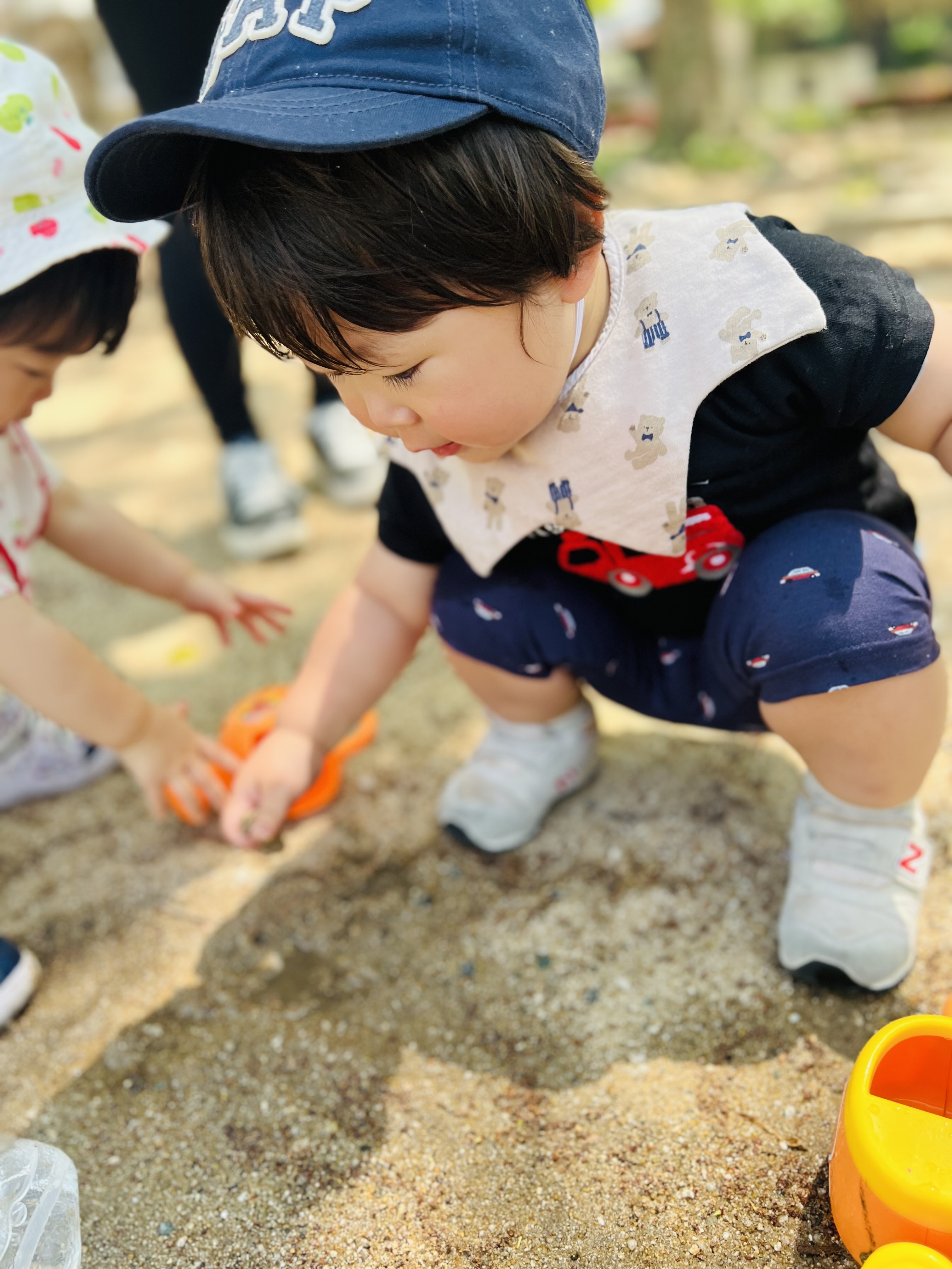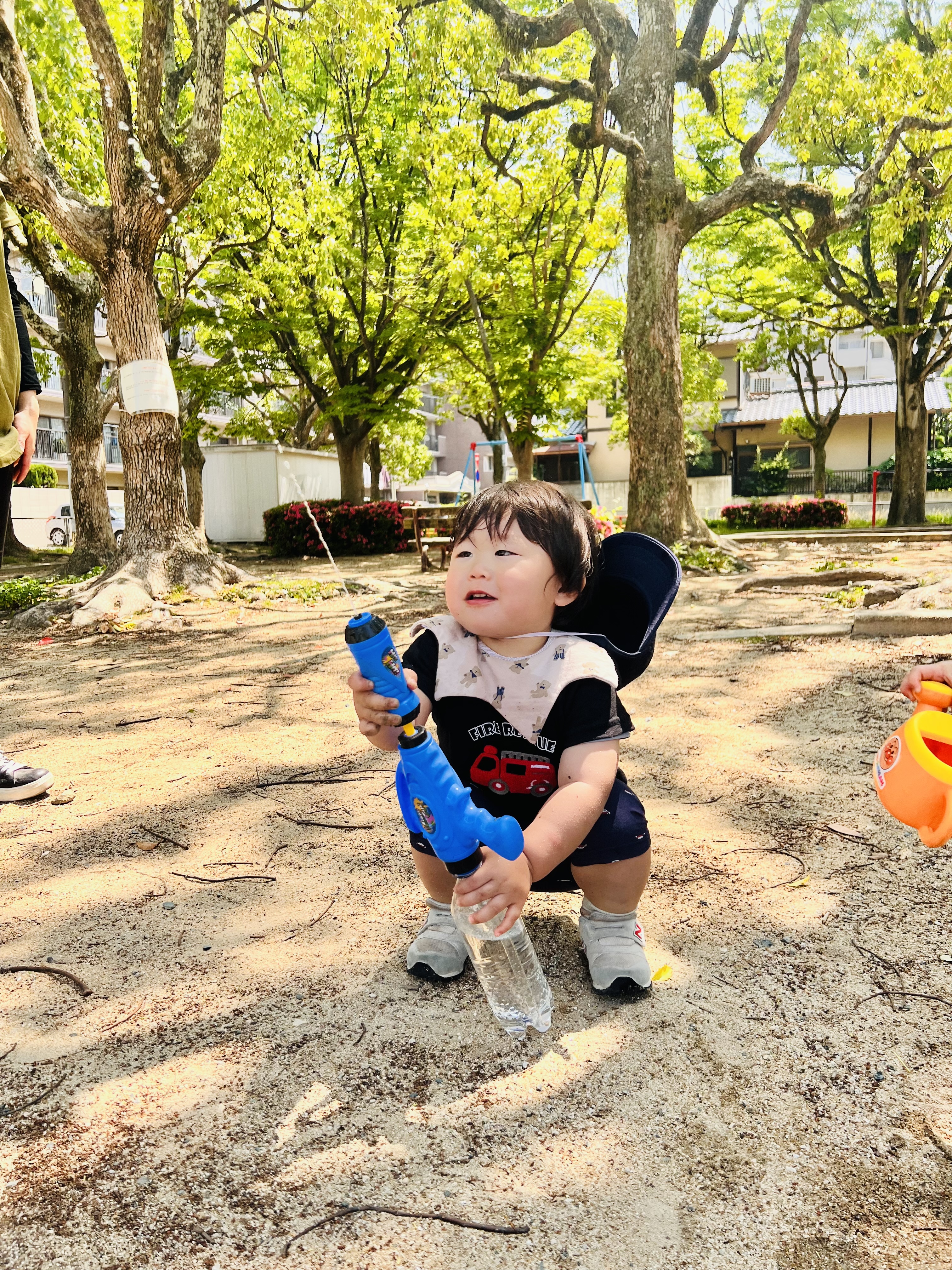 お水をかけながら、お砂も触って泥んこに興味津々です♫