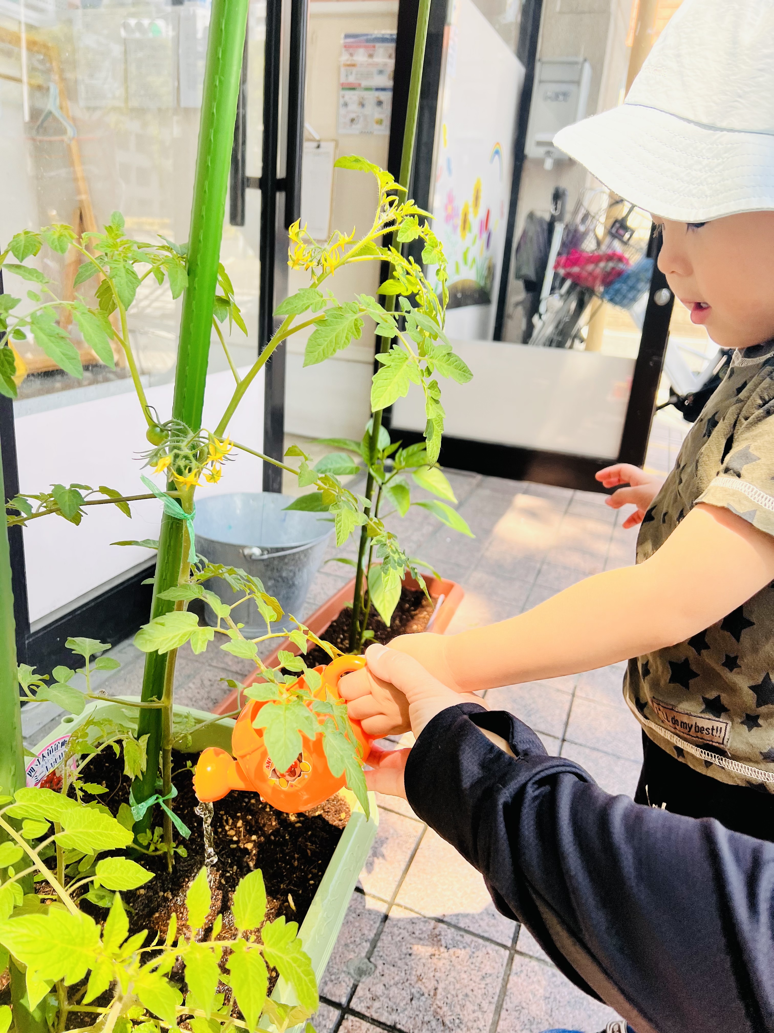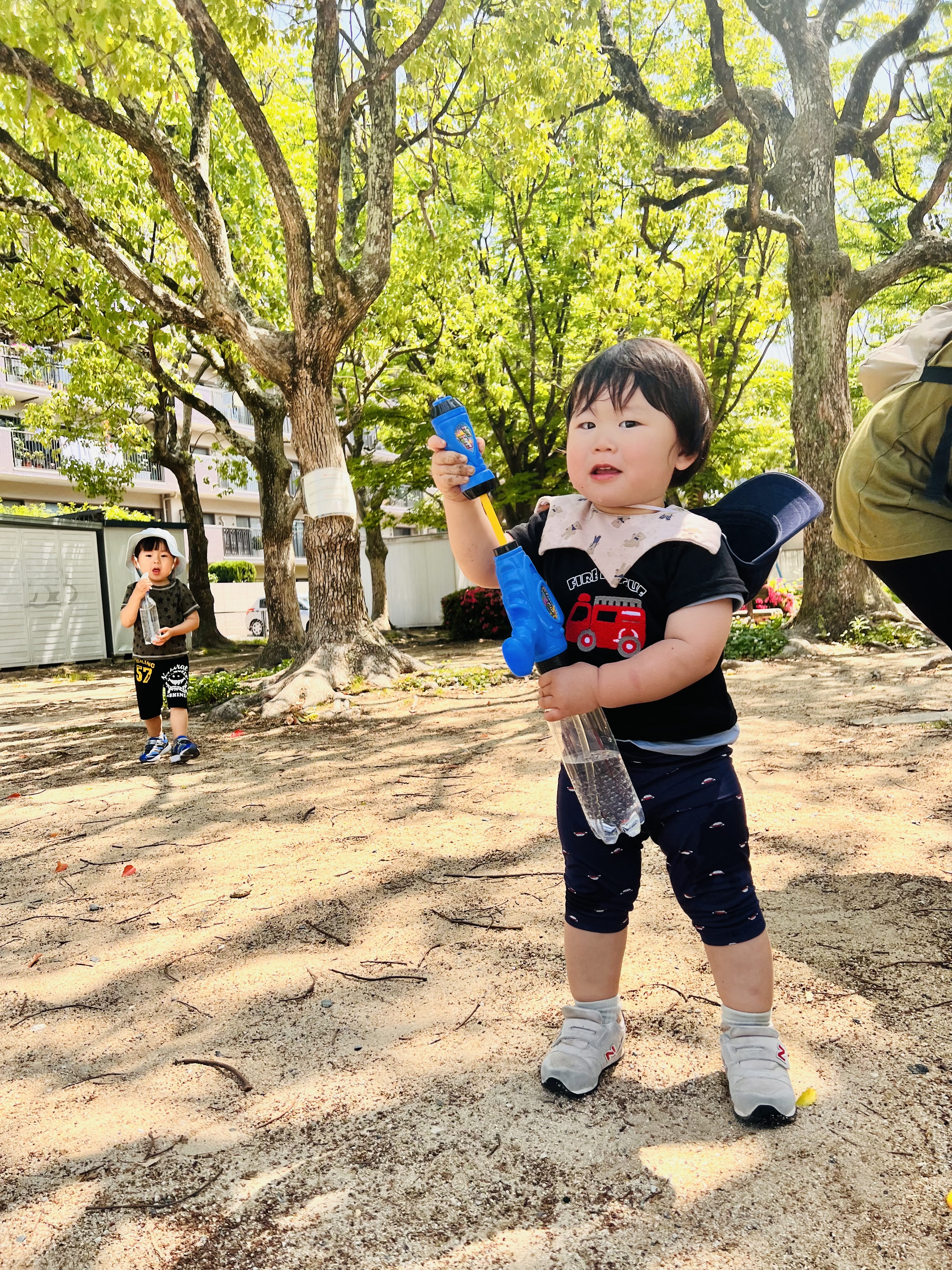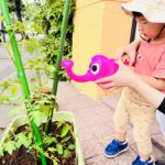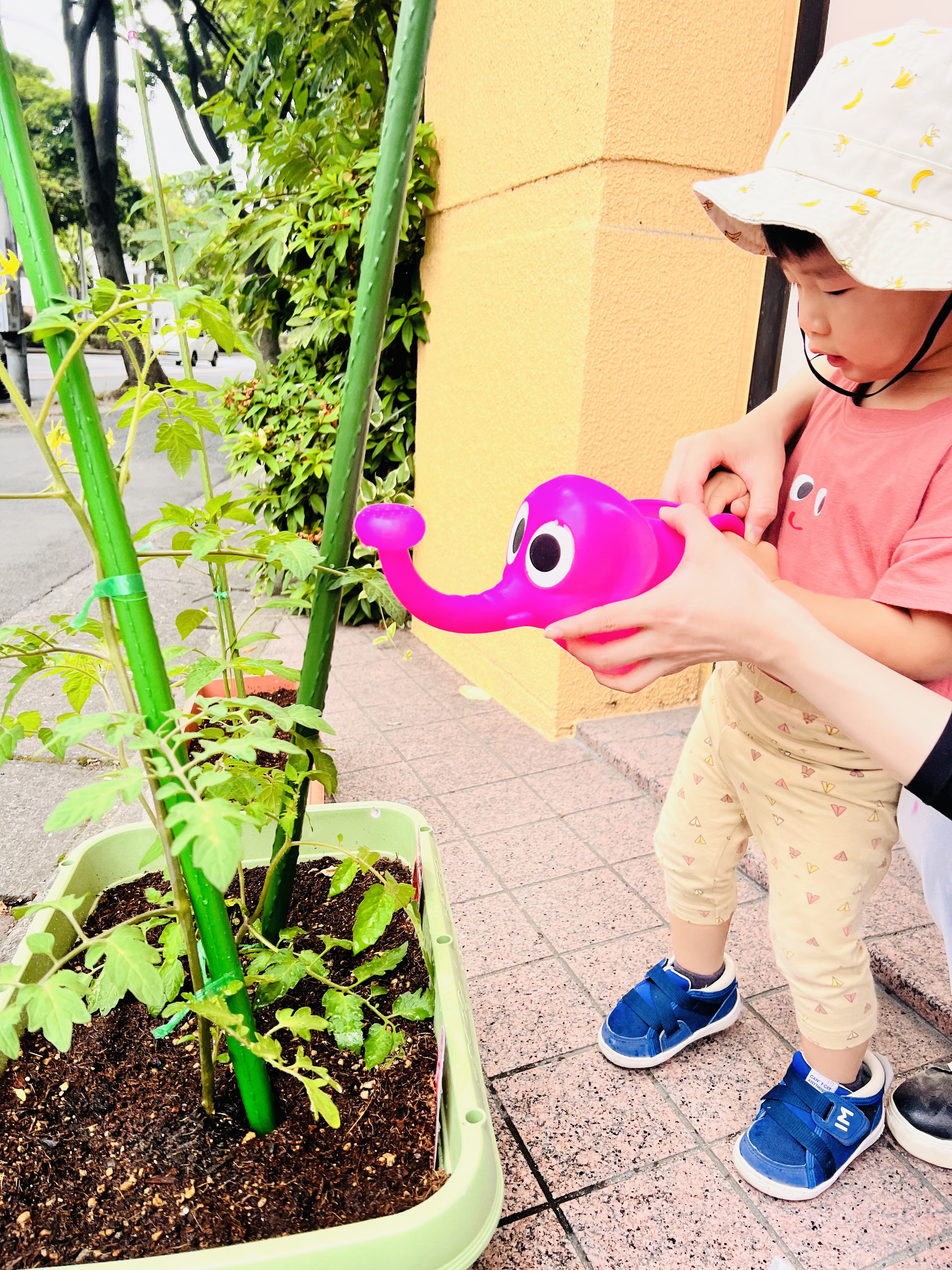 2歳児のお兄ちゃんが水やりする姿をしっかり見つめる1歳児のお友達😊