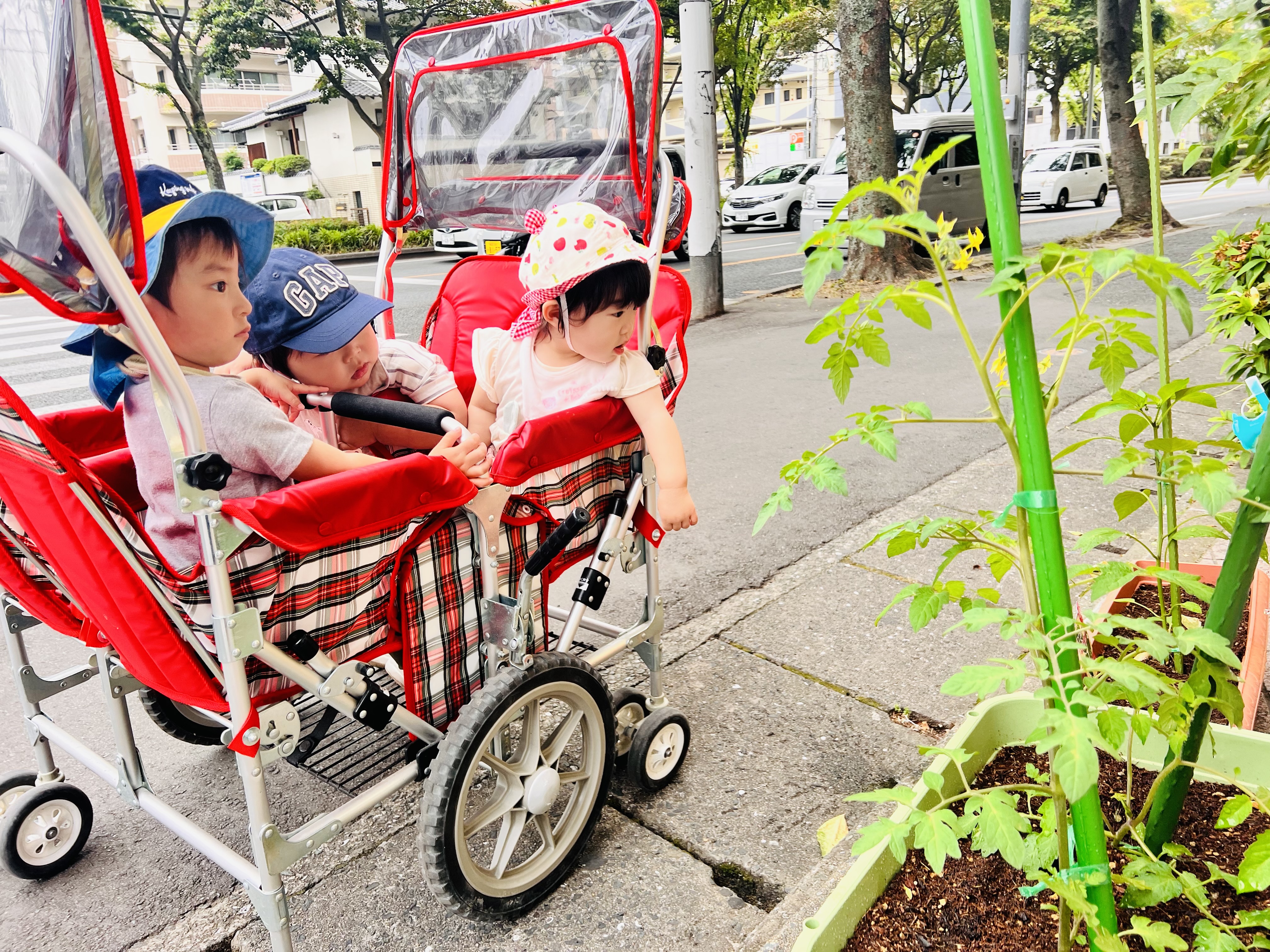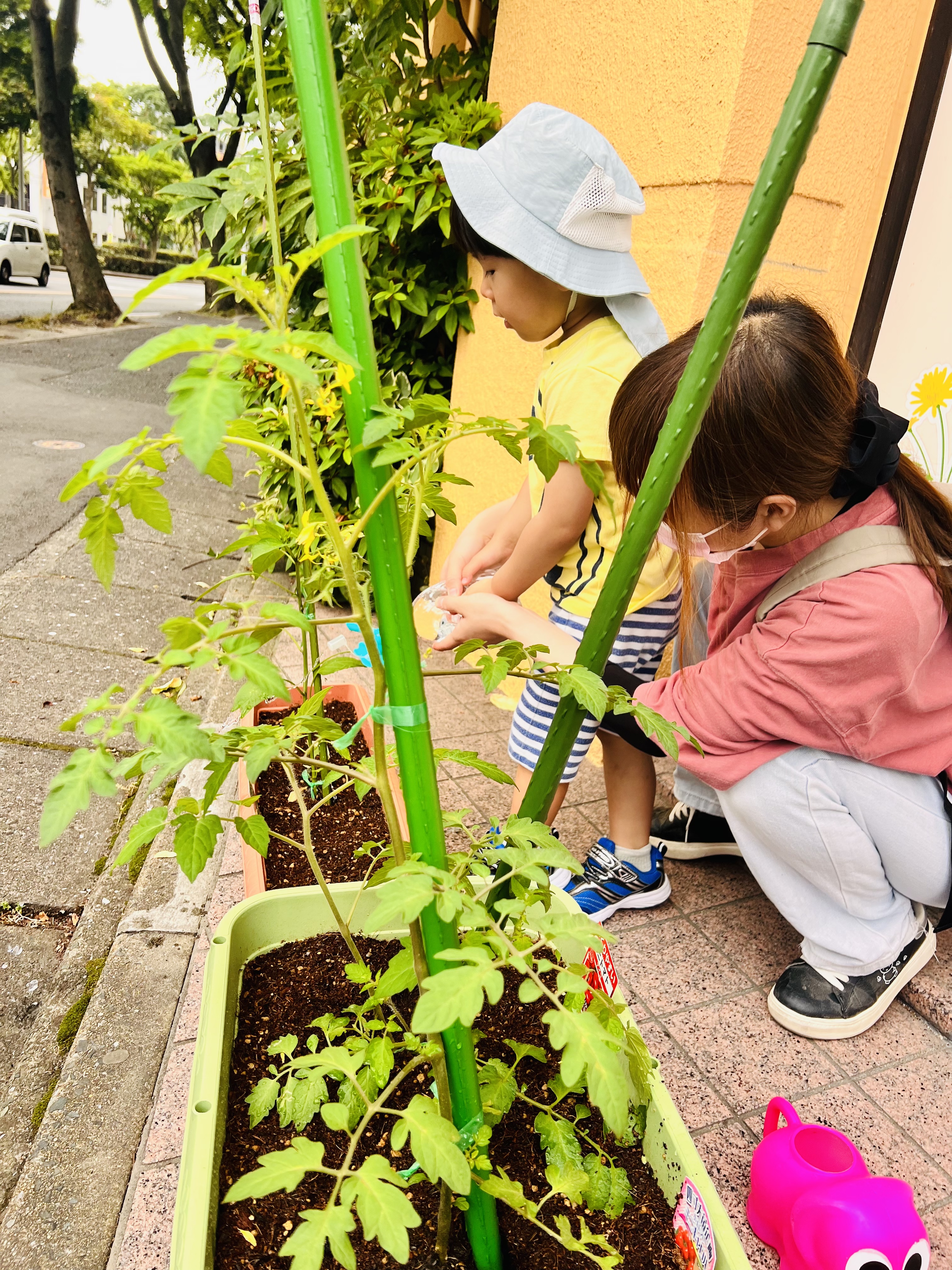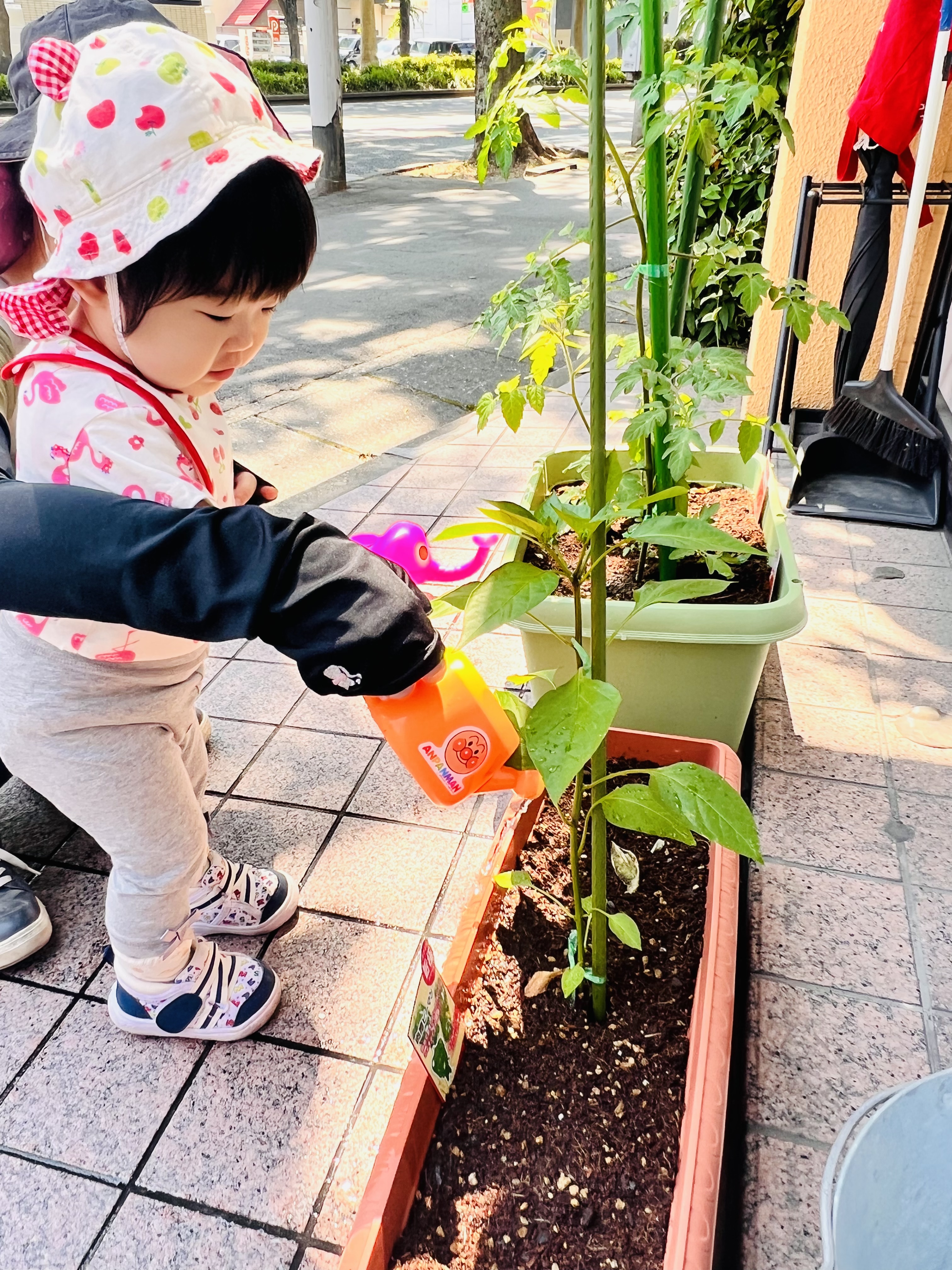 2歳児のお兄ちゃんが水やりする姿をしっかり見つめる1歳児のお友達😊