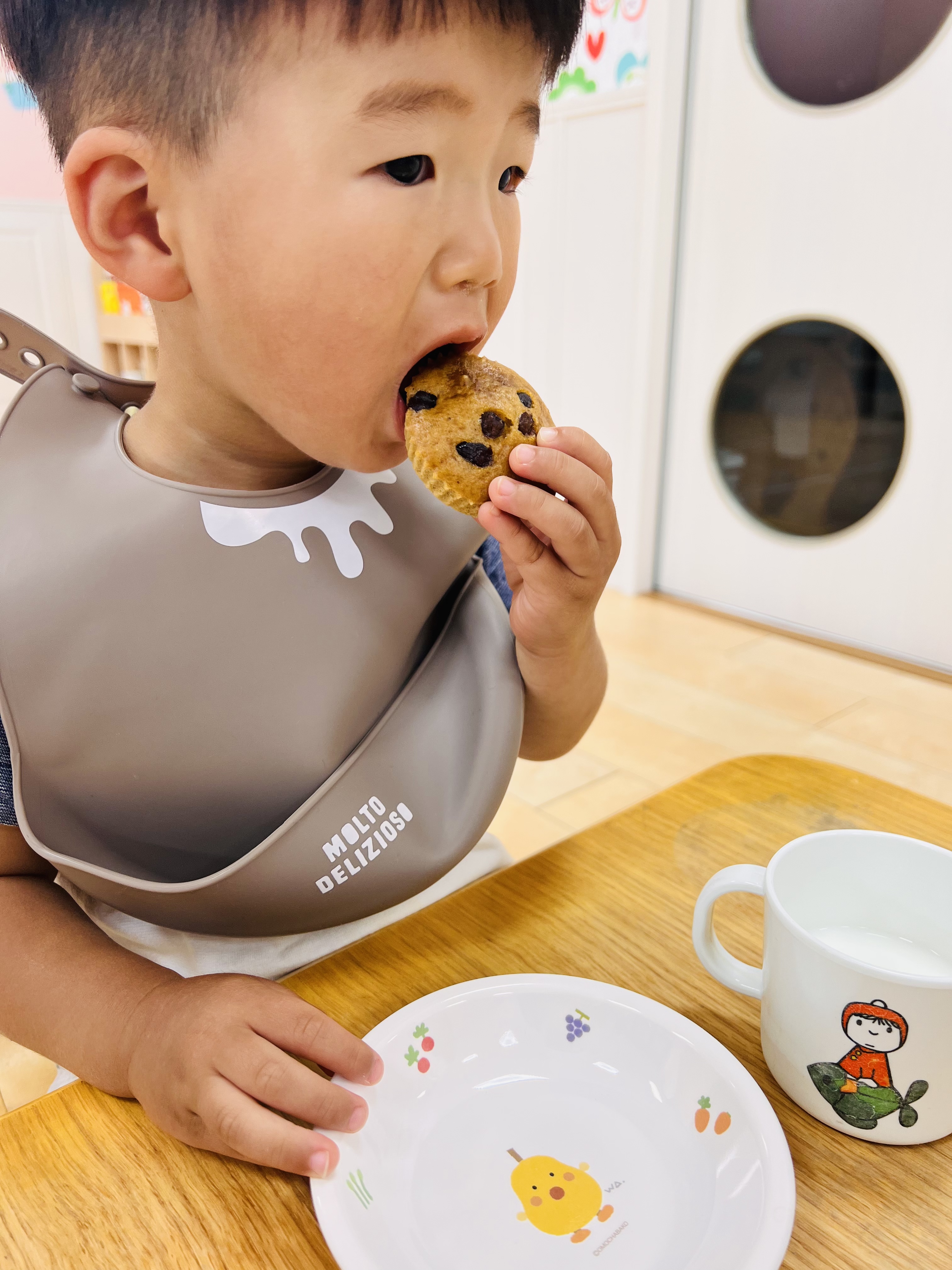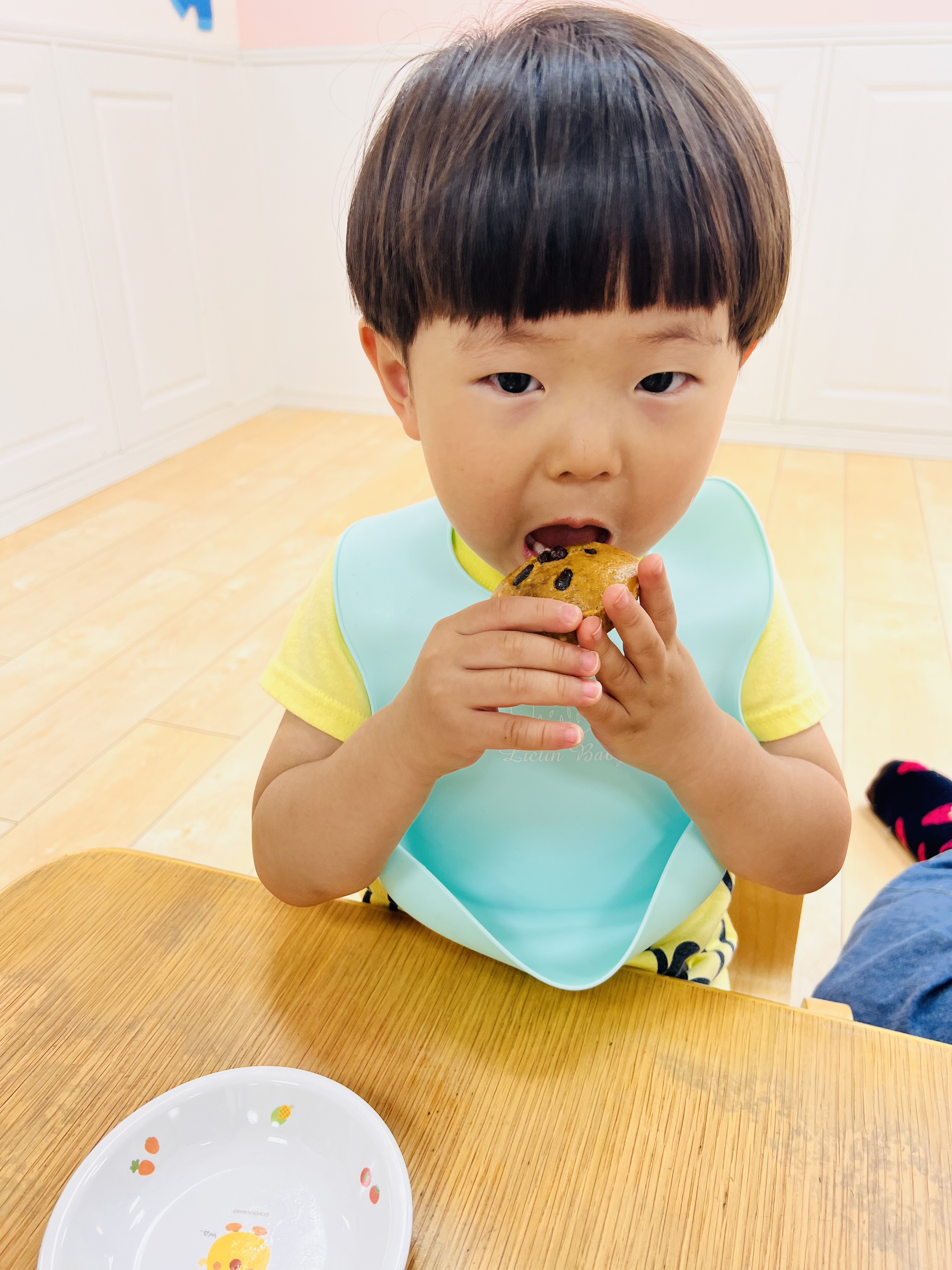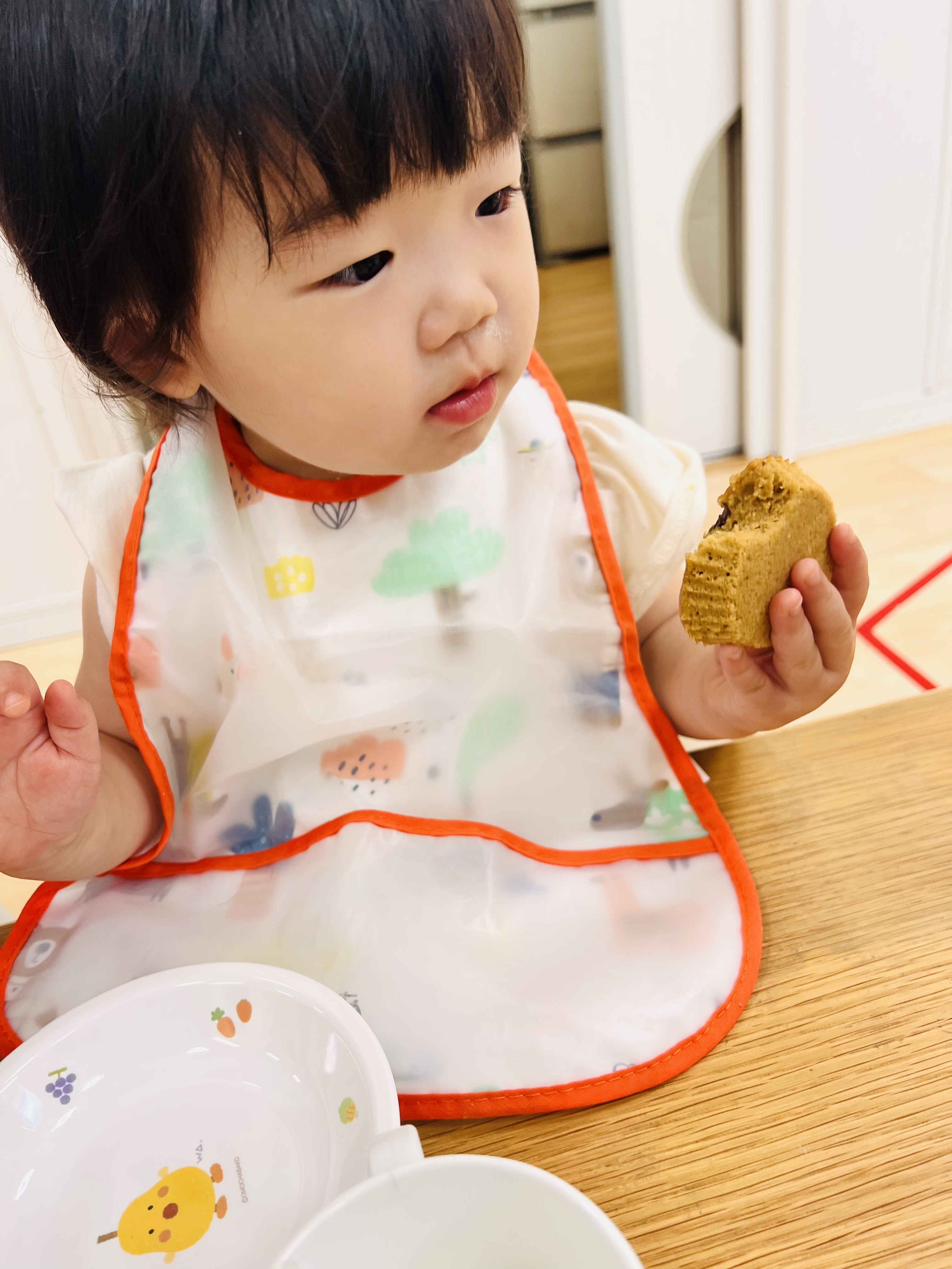 小豆を見つけて、そこからガブっと大きなお口♫小さなお口だなぁーと見ていると、食べた断面から小豆が出てきてました😊