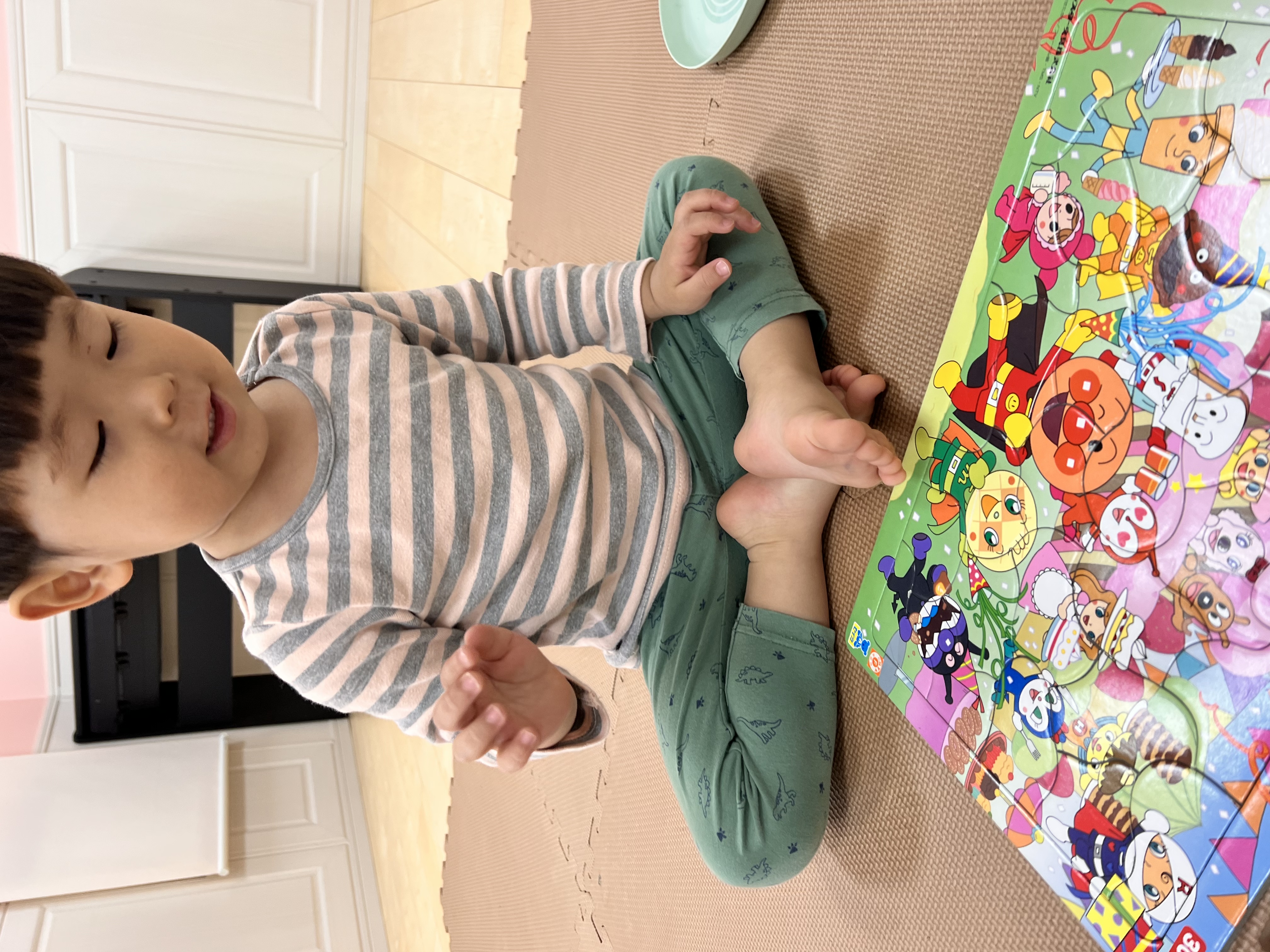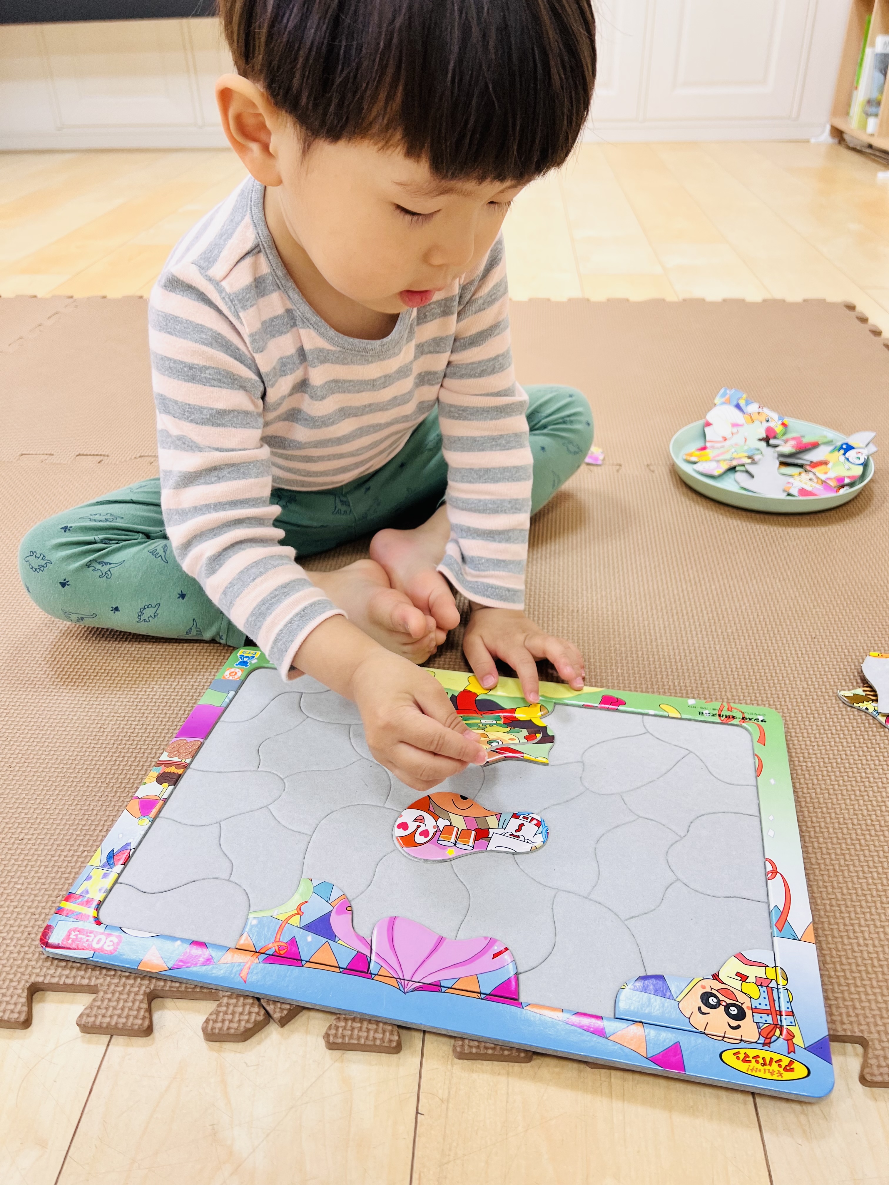 丸や三角の形のパズルも型はめできるようになってますが、今はパズルを切り込みから出し入れして、お手紙配達する郵便屋さんごっこで楽しんでます😊