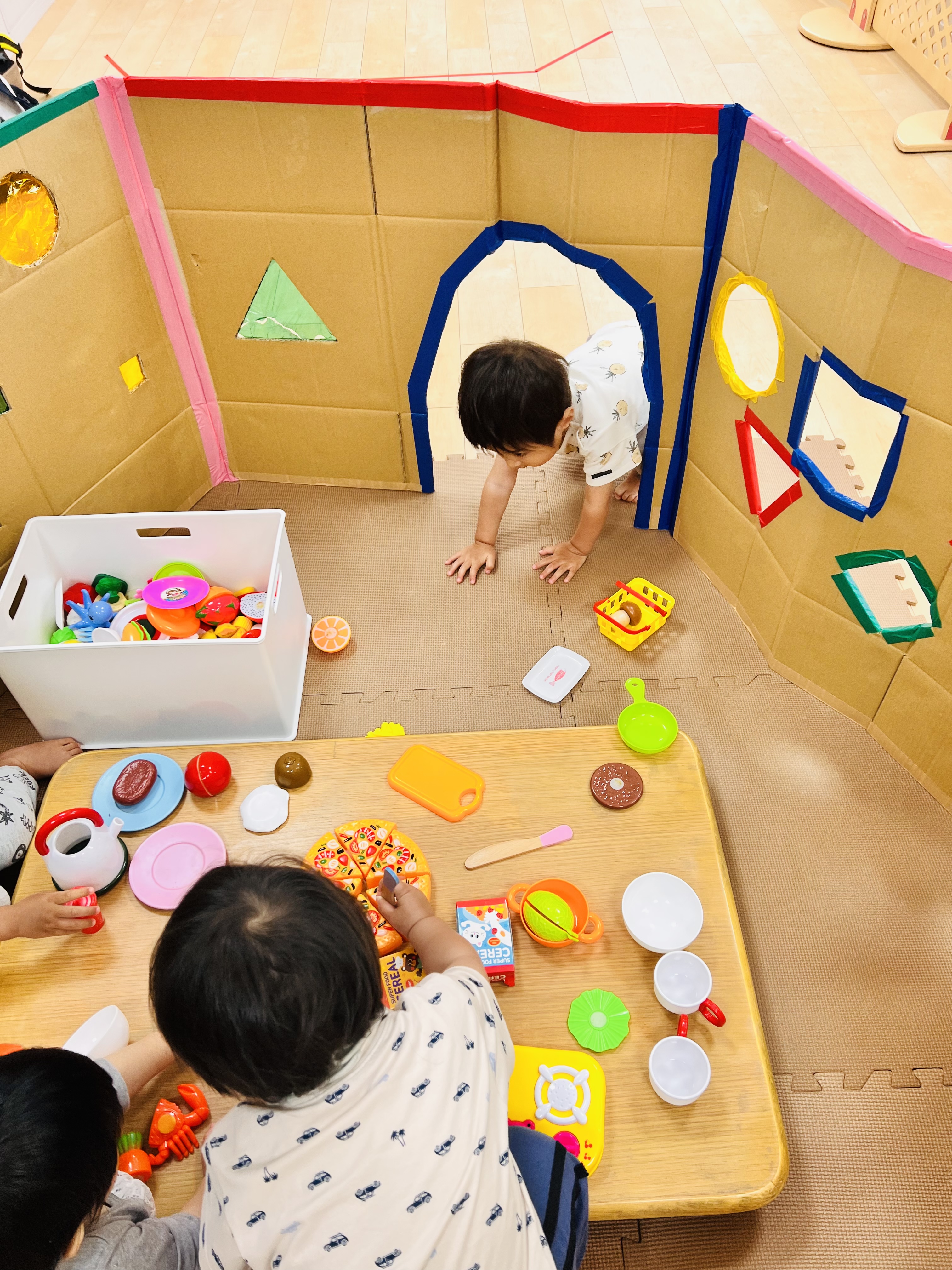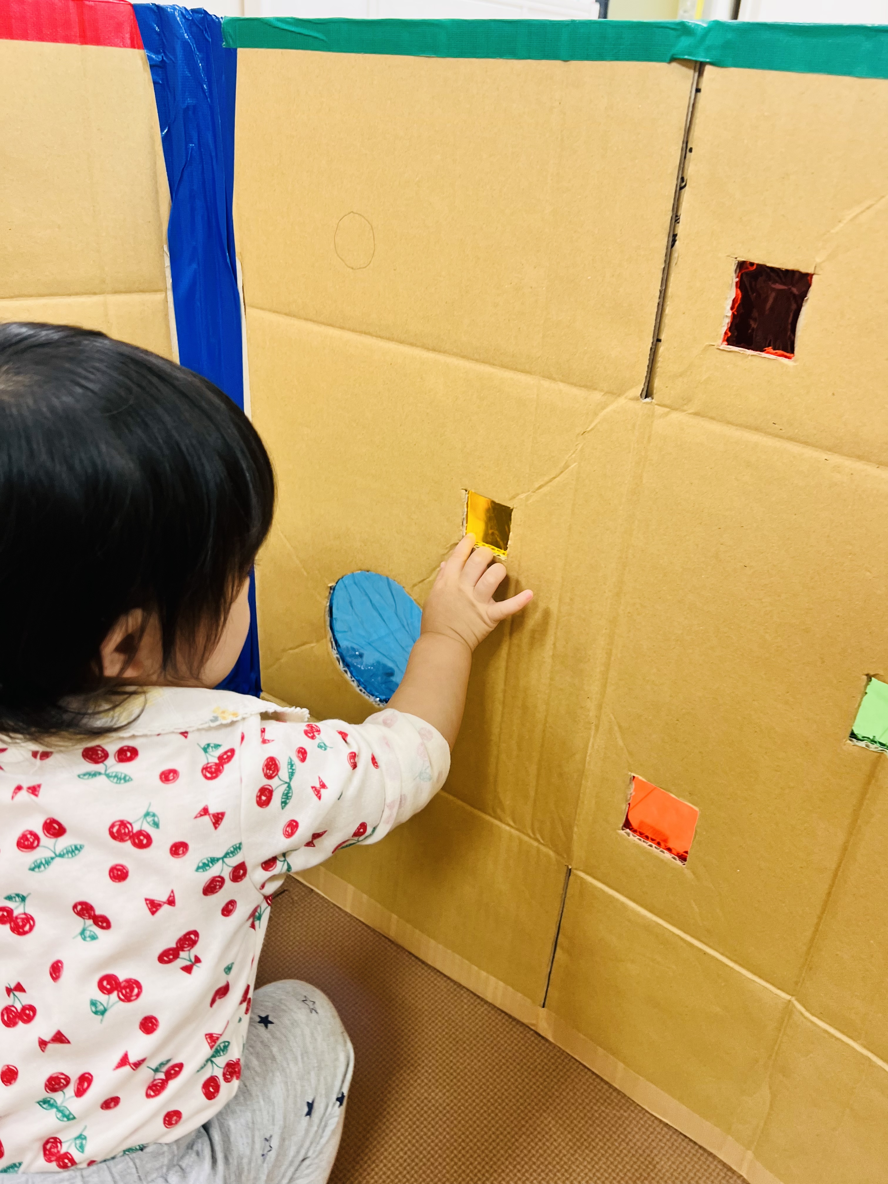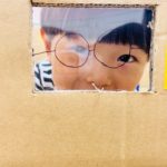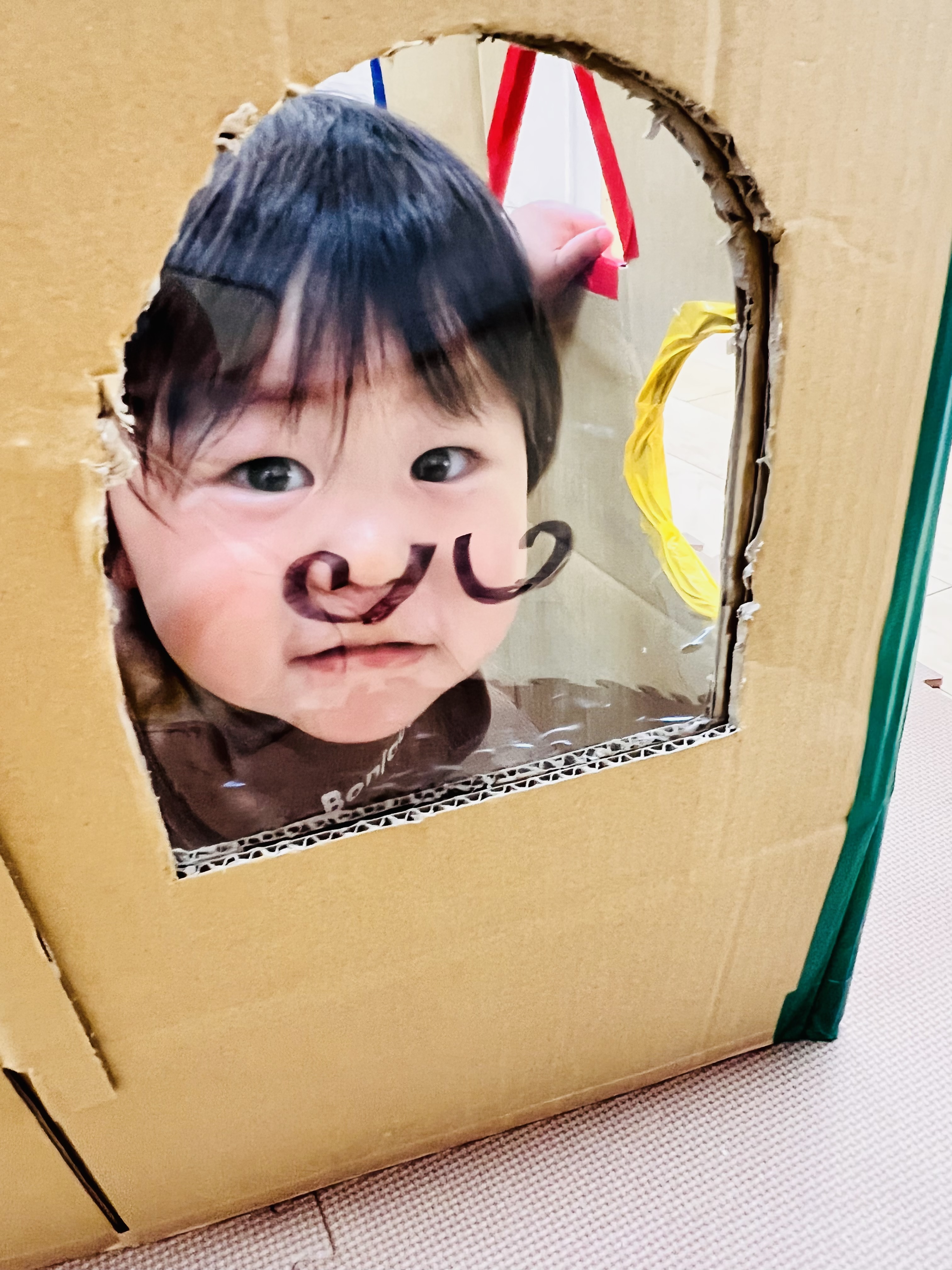 段ボールハウスの窓はカラフルだったりお髭がついてます♫