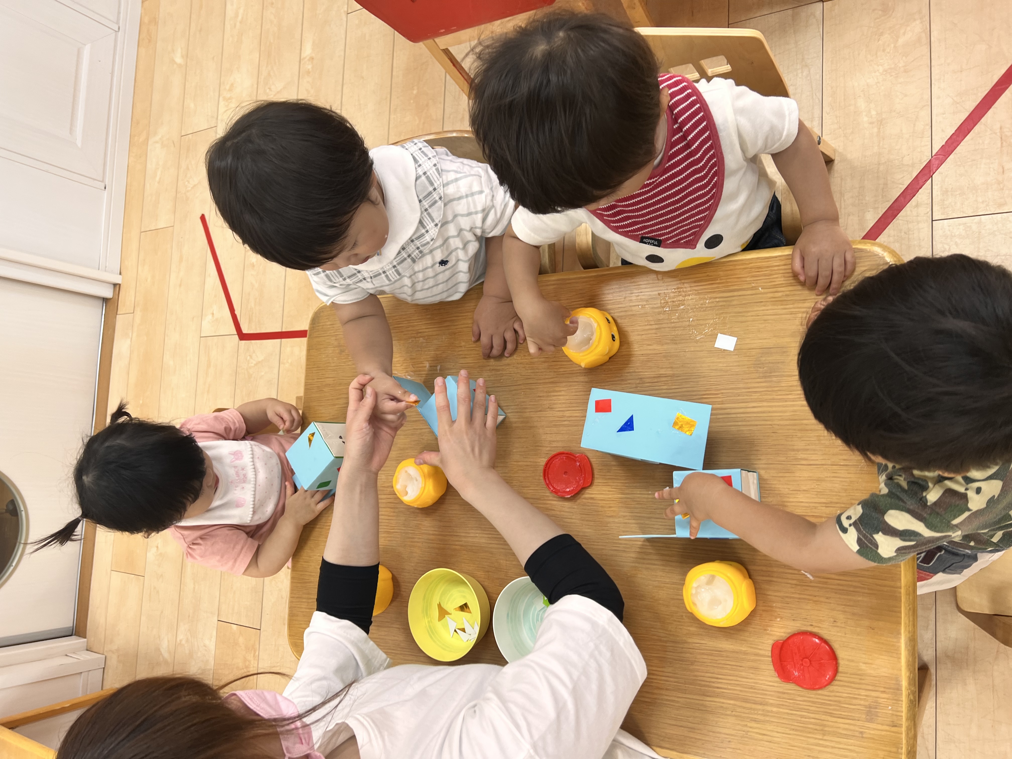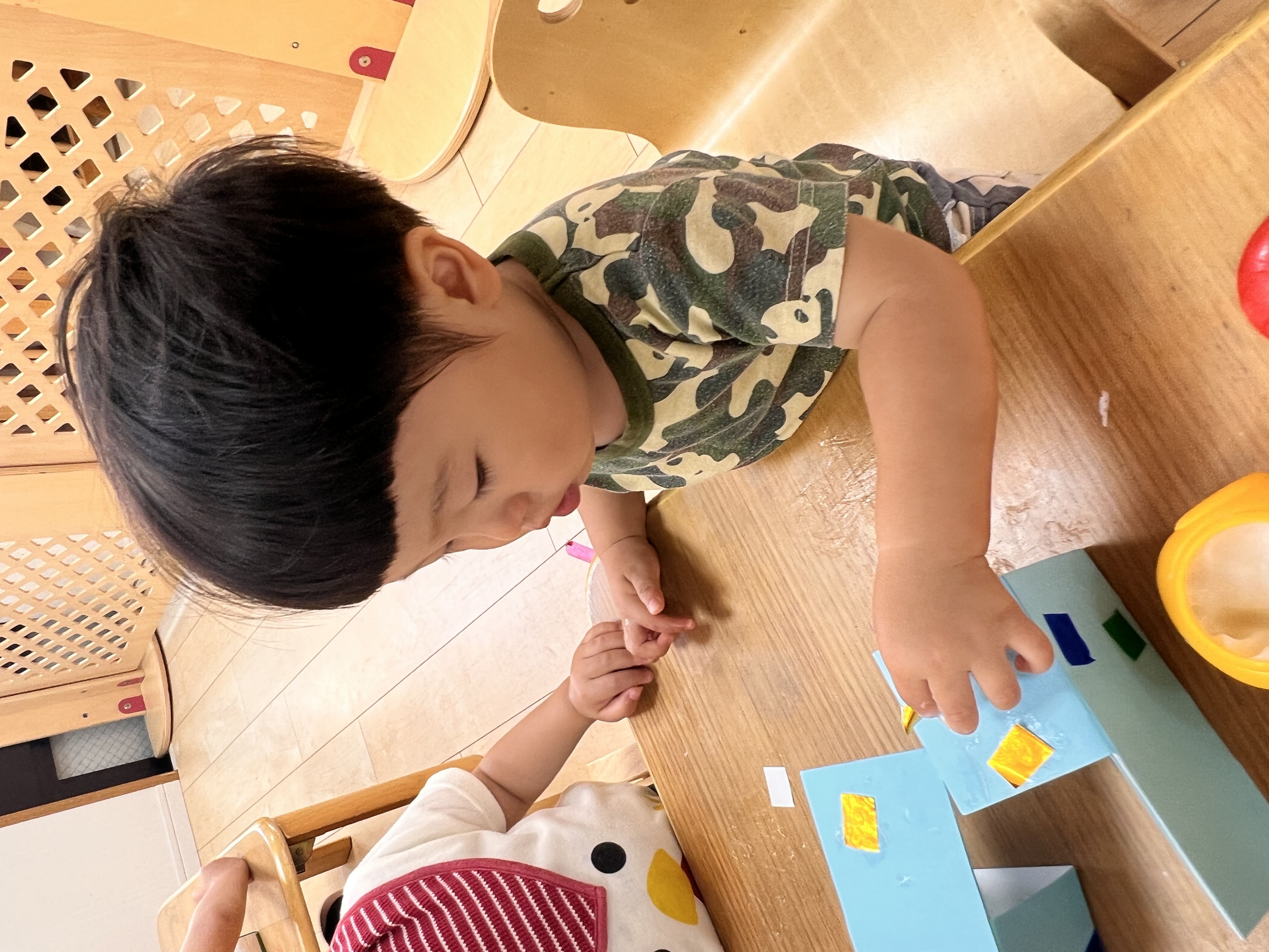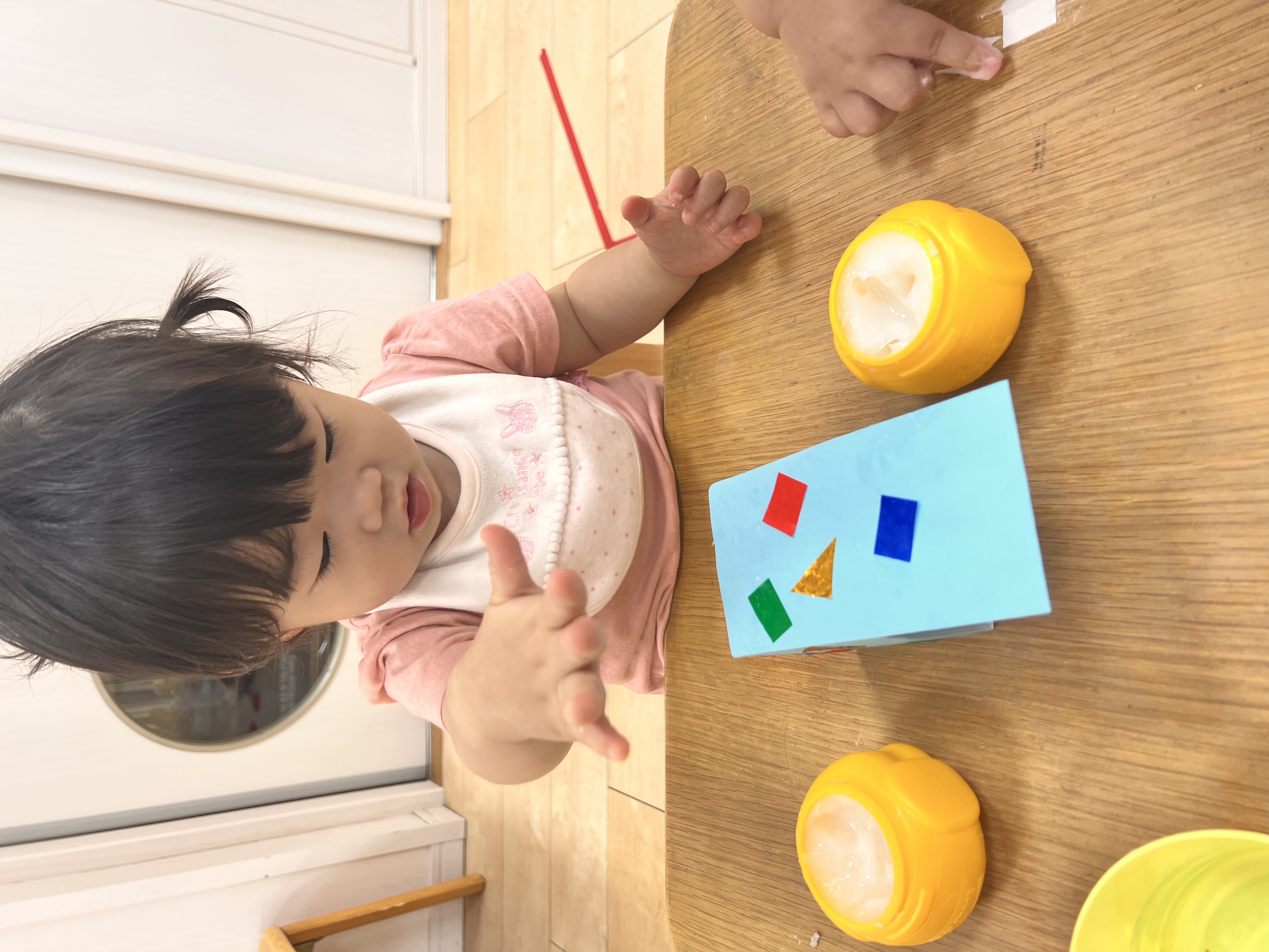 切った折り紙はのりでぺたぺた♫先生の手伝いなんてなくても、とっても上手です😊