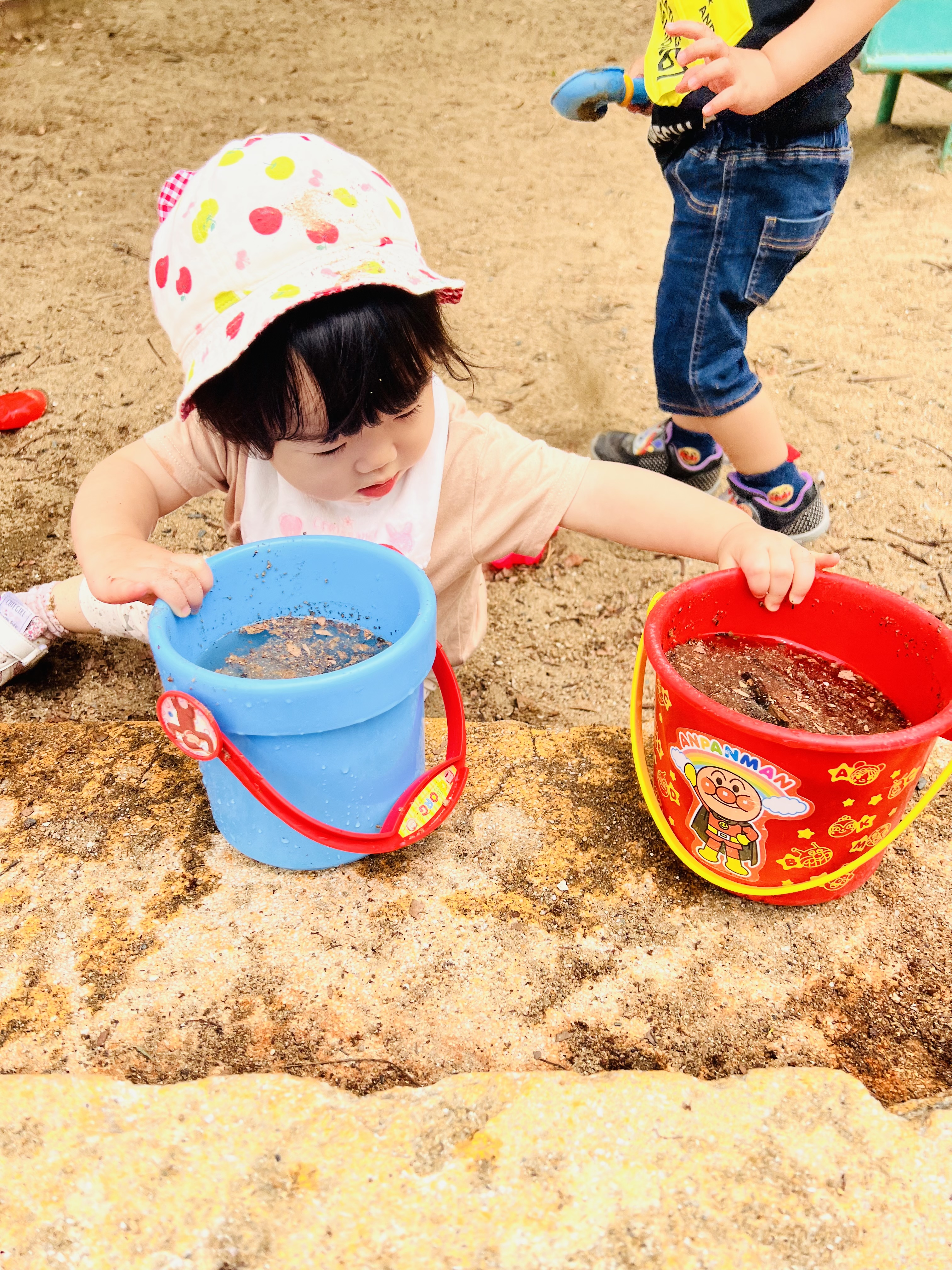 どっちの料理が美味しいかな⁉️いえいえ、バケツについてるキャラクターを吟味しているところですよ♫