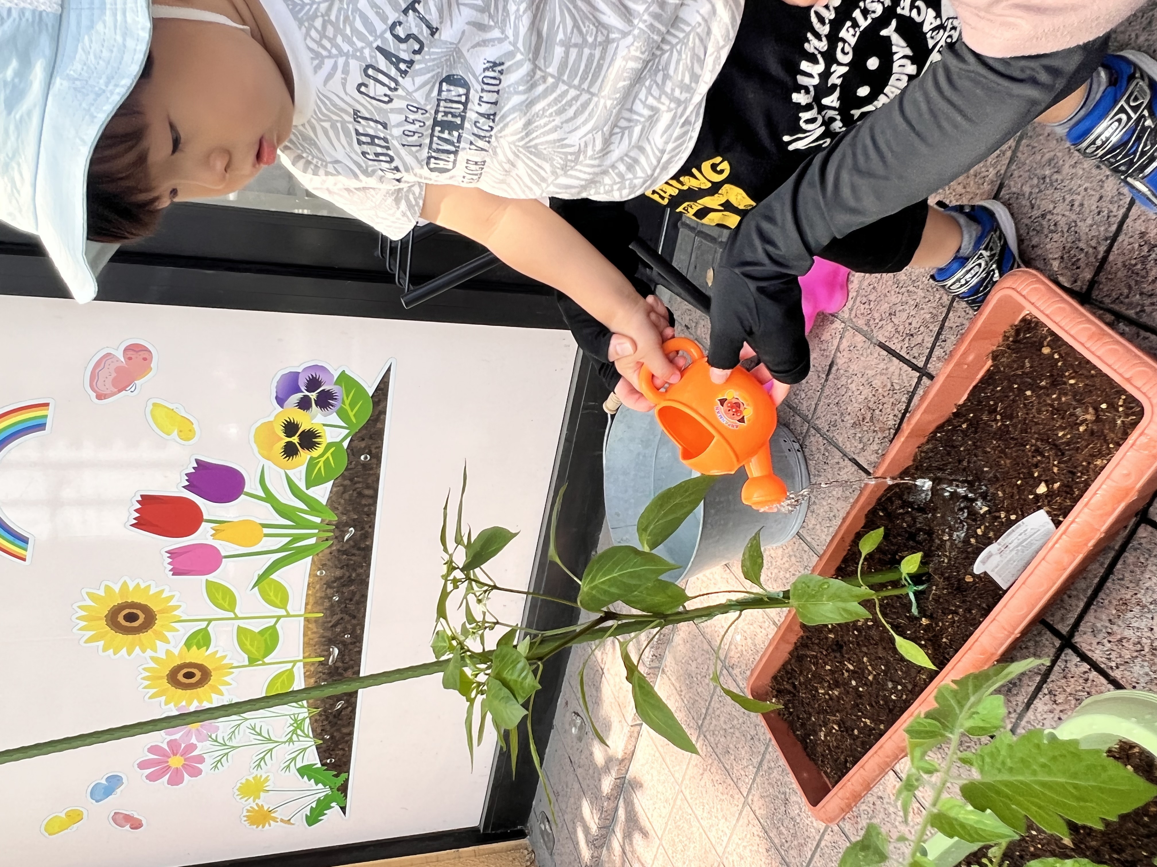 お外へ行く前に、お水をあげてピーマンとミニトマト達に大きくなぁれと声をかけました😊