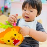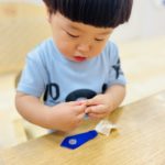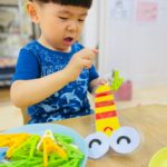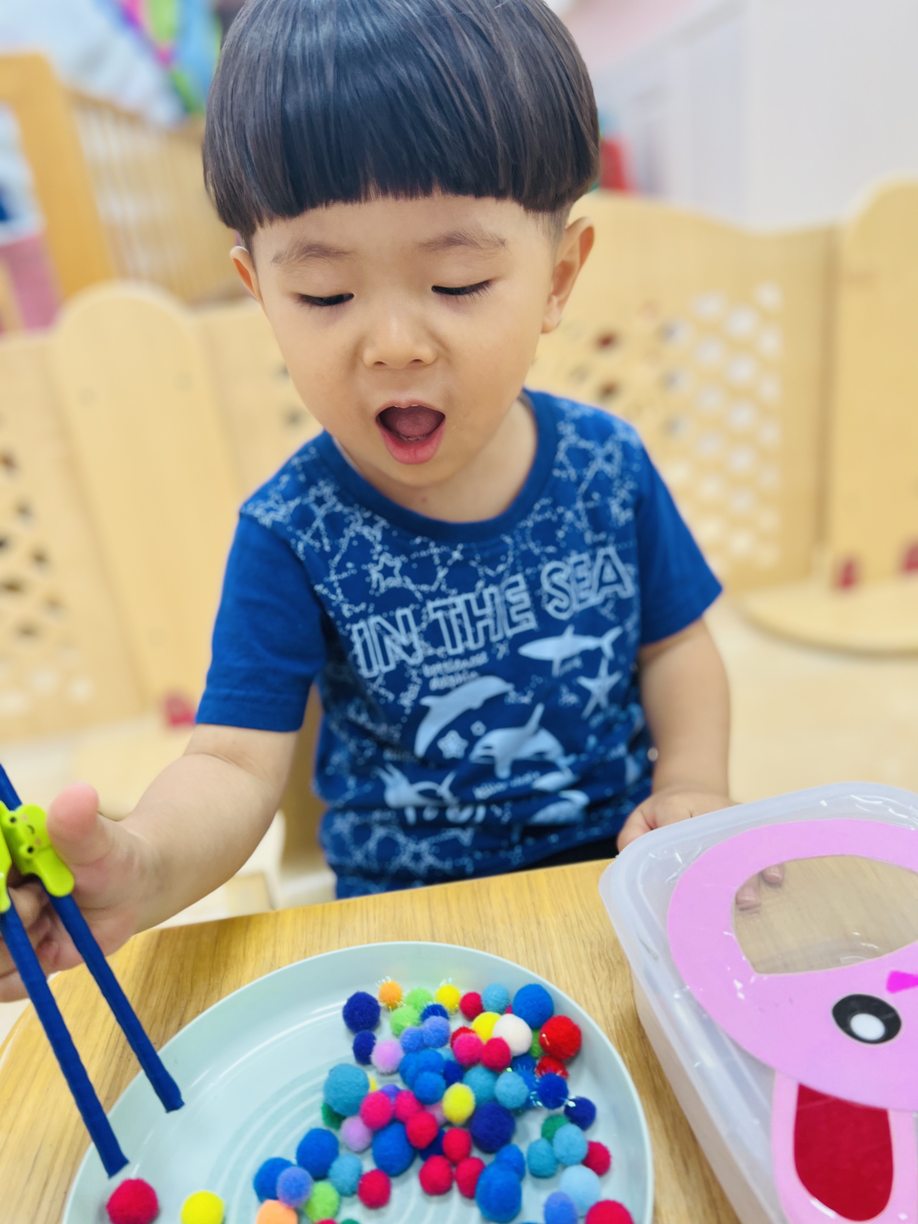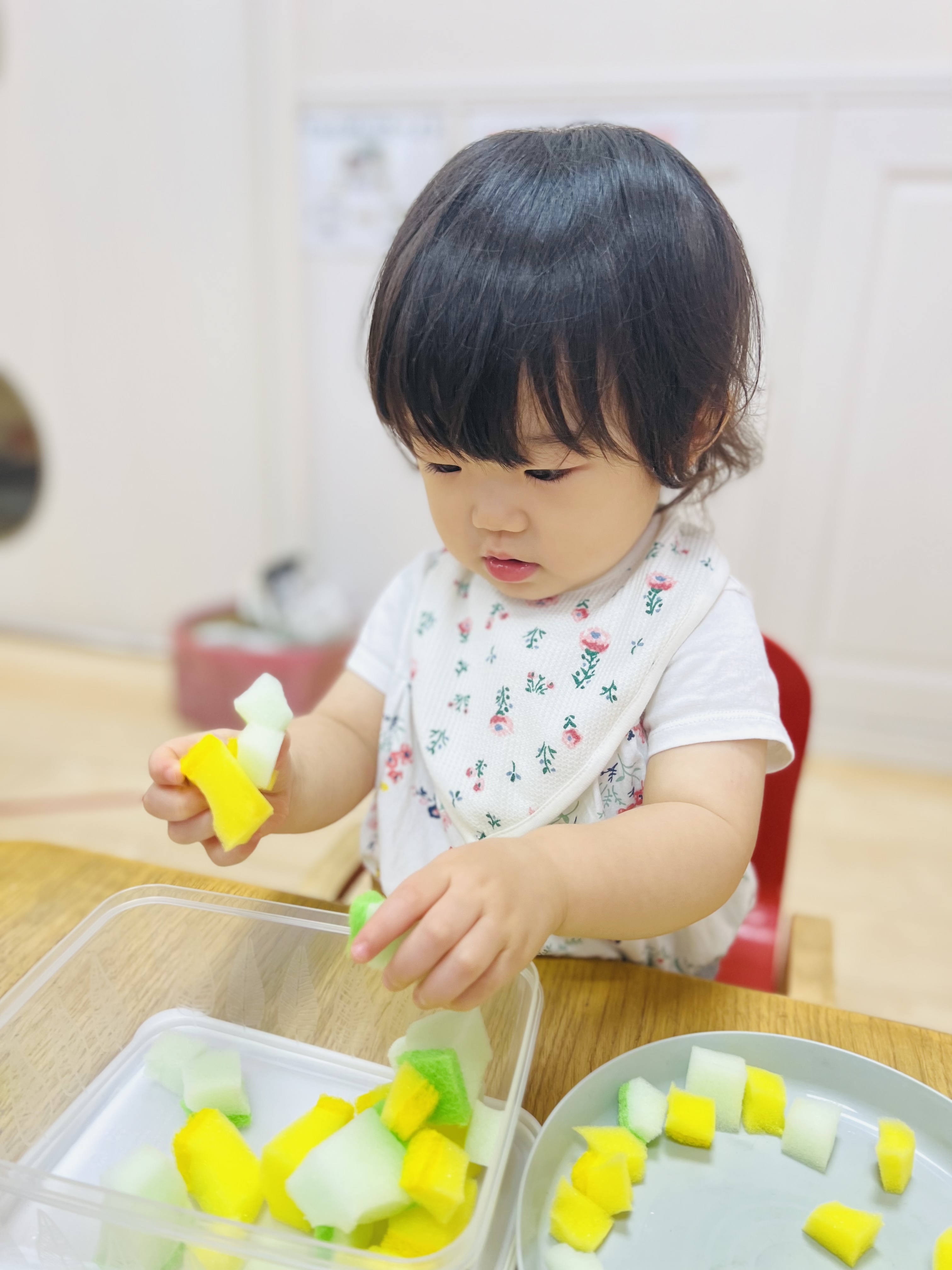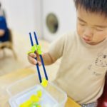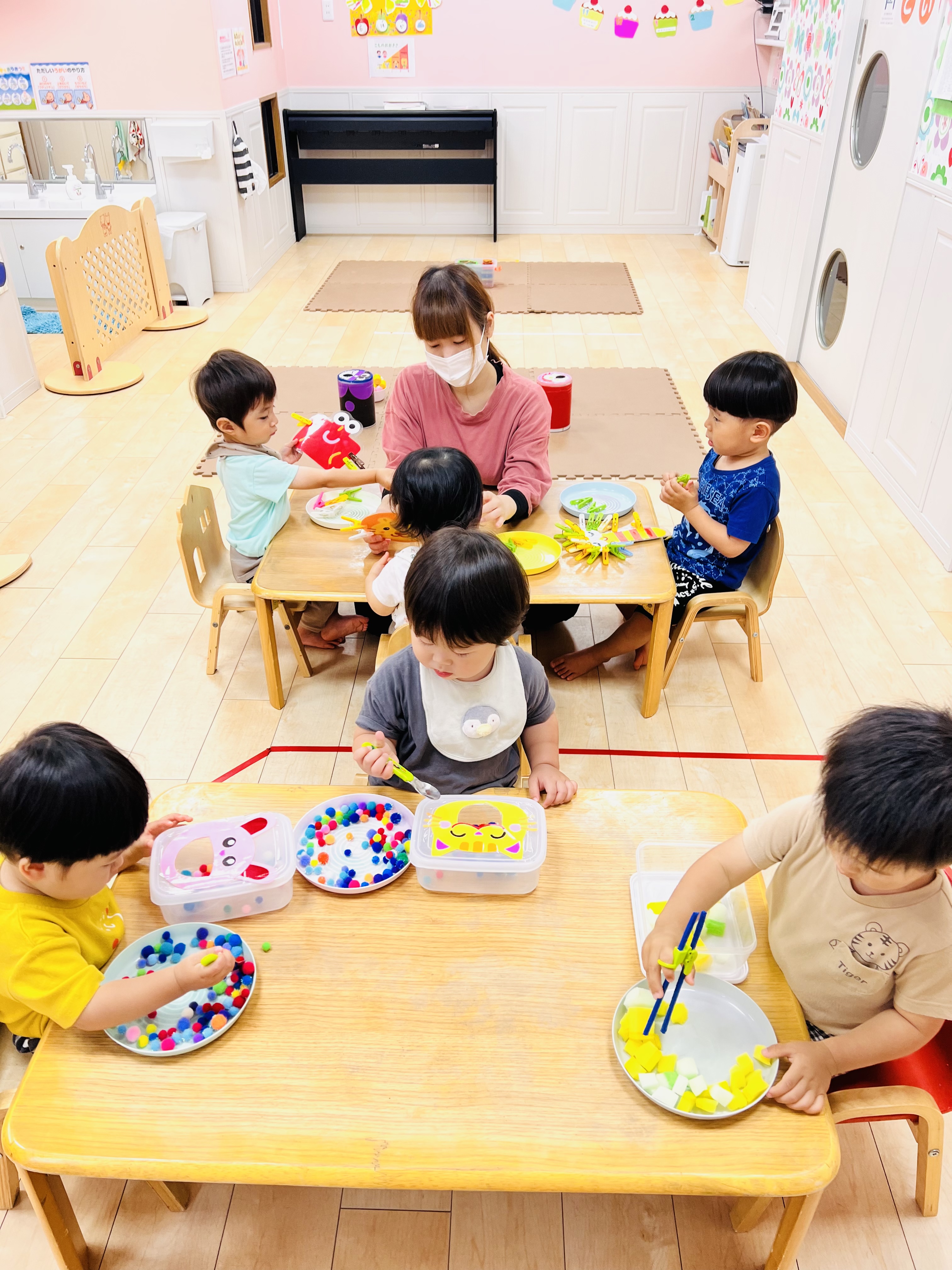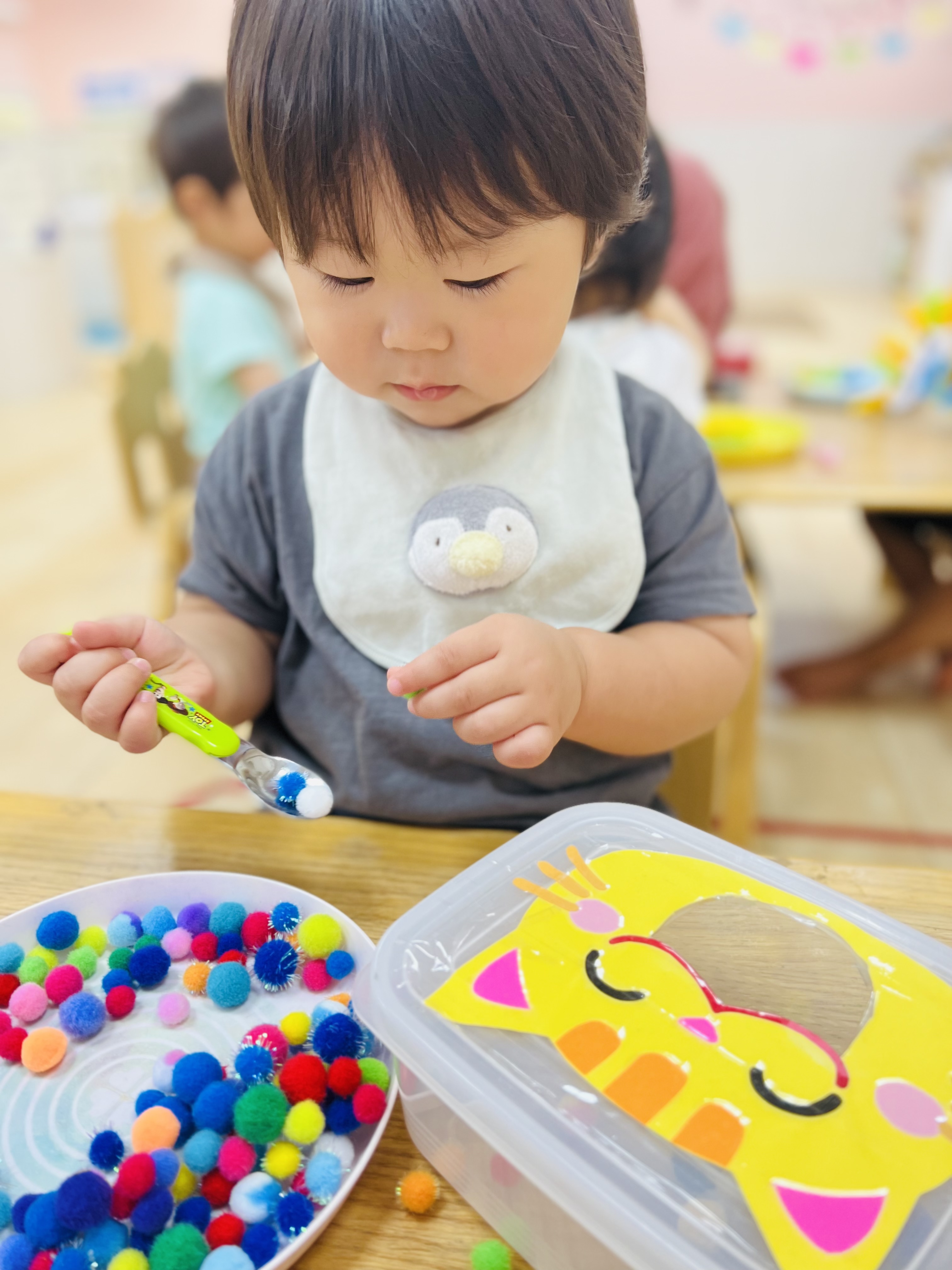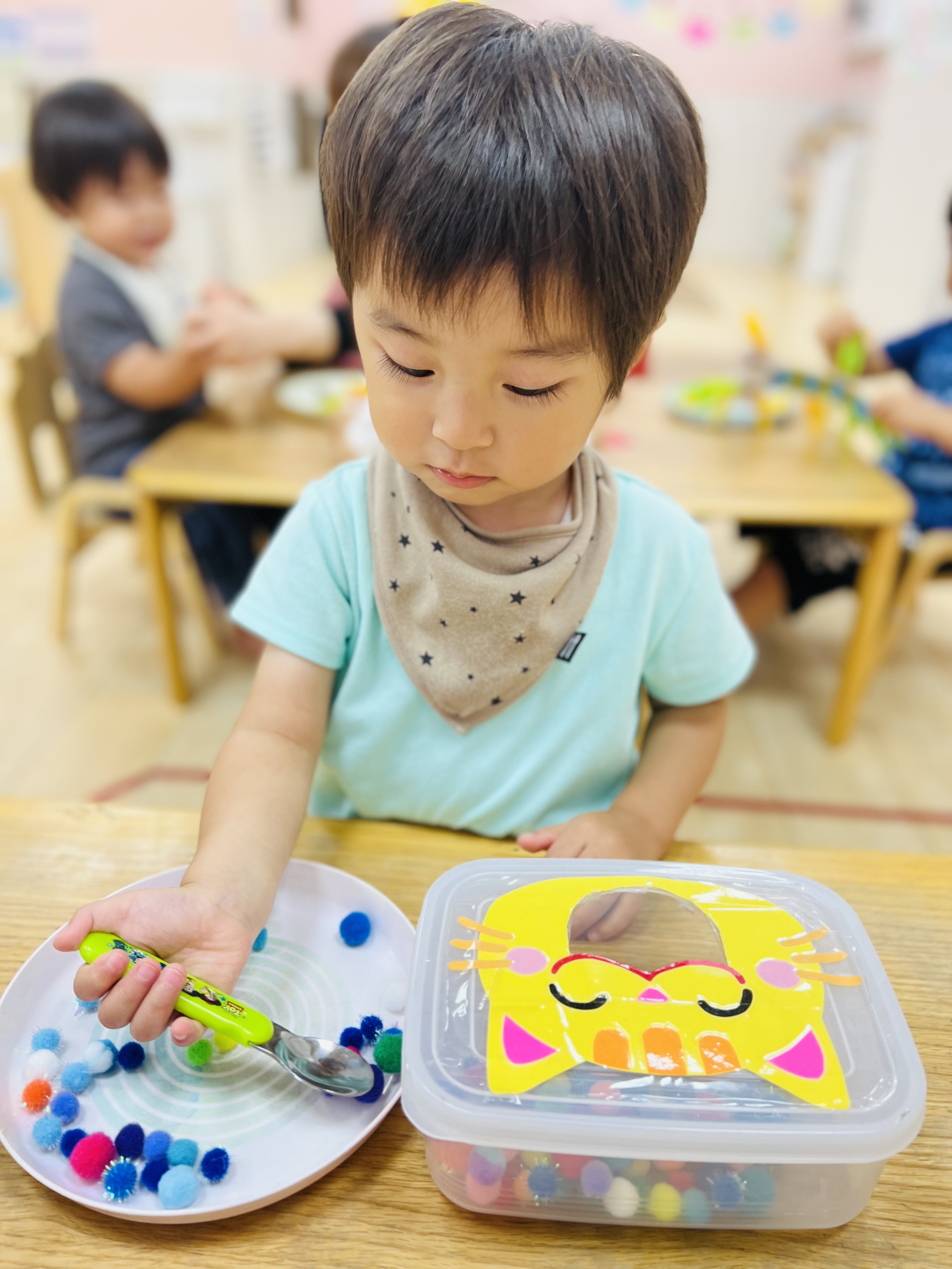 スプーンとお箸を使ってカラフルなポンポンやスポンジを器から動物さんのお口へ移し替え♫