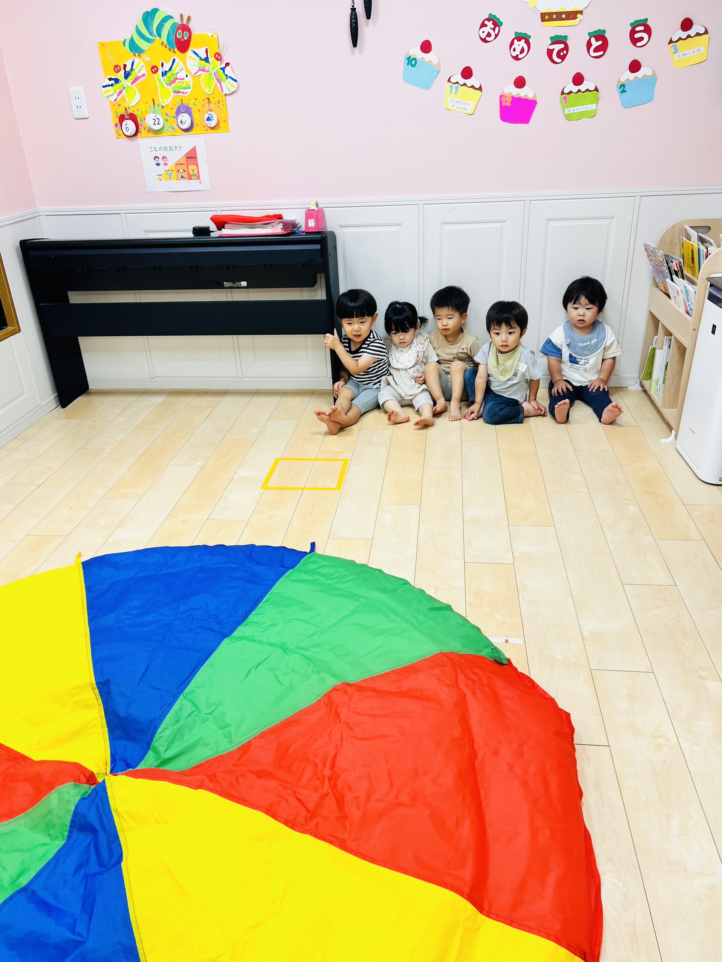 カラフルで大きな布にワクワク😊 それぞれ好きな色をしっかり握りパラバルーンをバタバター♫  楽しいー♫ 「えーいっ!」 先生と一緒にたくさんバルーンを揺らして、風が吹いてくるのを楽しみました😊