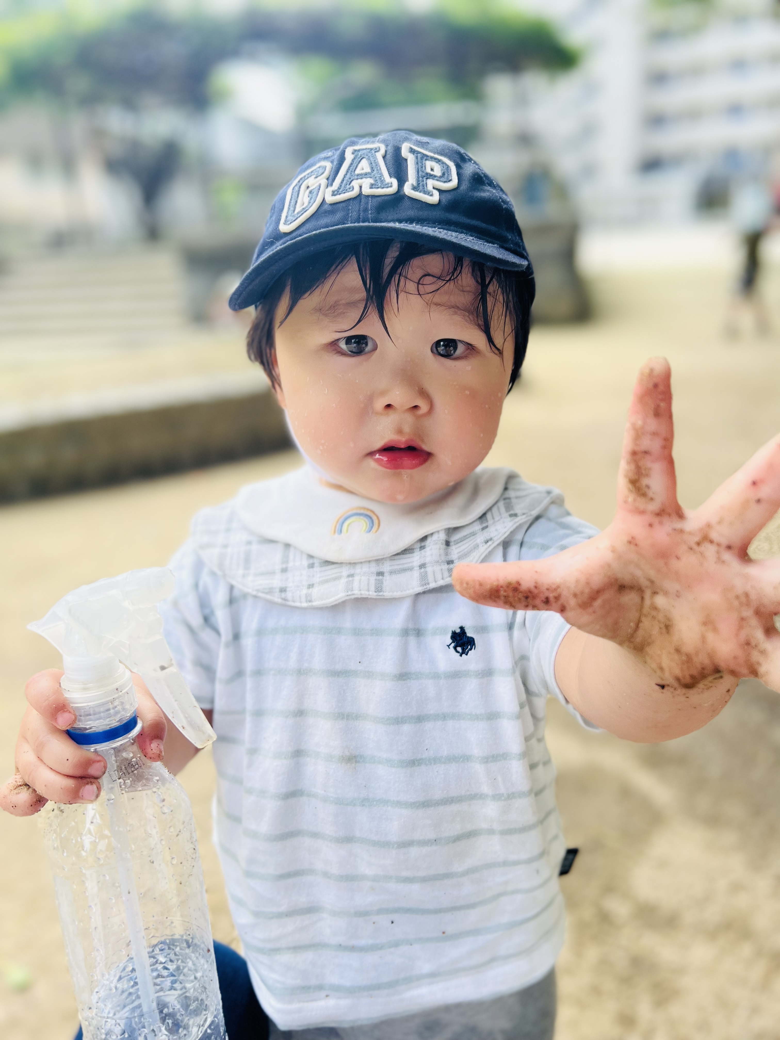 手が汚れたと先生の所へやってくるお友達もいます😊自分で伝えようとする姿がカッコいいですね😁  なんとなーく…水をどこかに入れないといけない気がして穴を探してます😁  水溜まりができたと大喜び♫  まだまだ水を流すからねー♫と持ってきたお水を豪快に撒いてます😁  最後まで泥んこバチャバチャ、足音を楽しみました😊