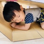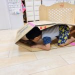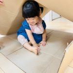 何をするんだろうと不思議そうに段ボールを見つめながら先生のお話を聞いてます😊