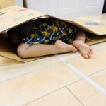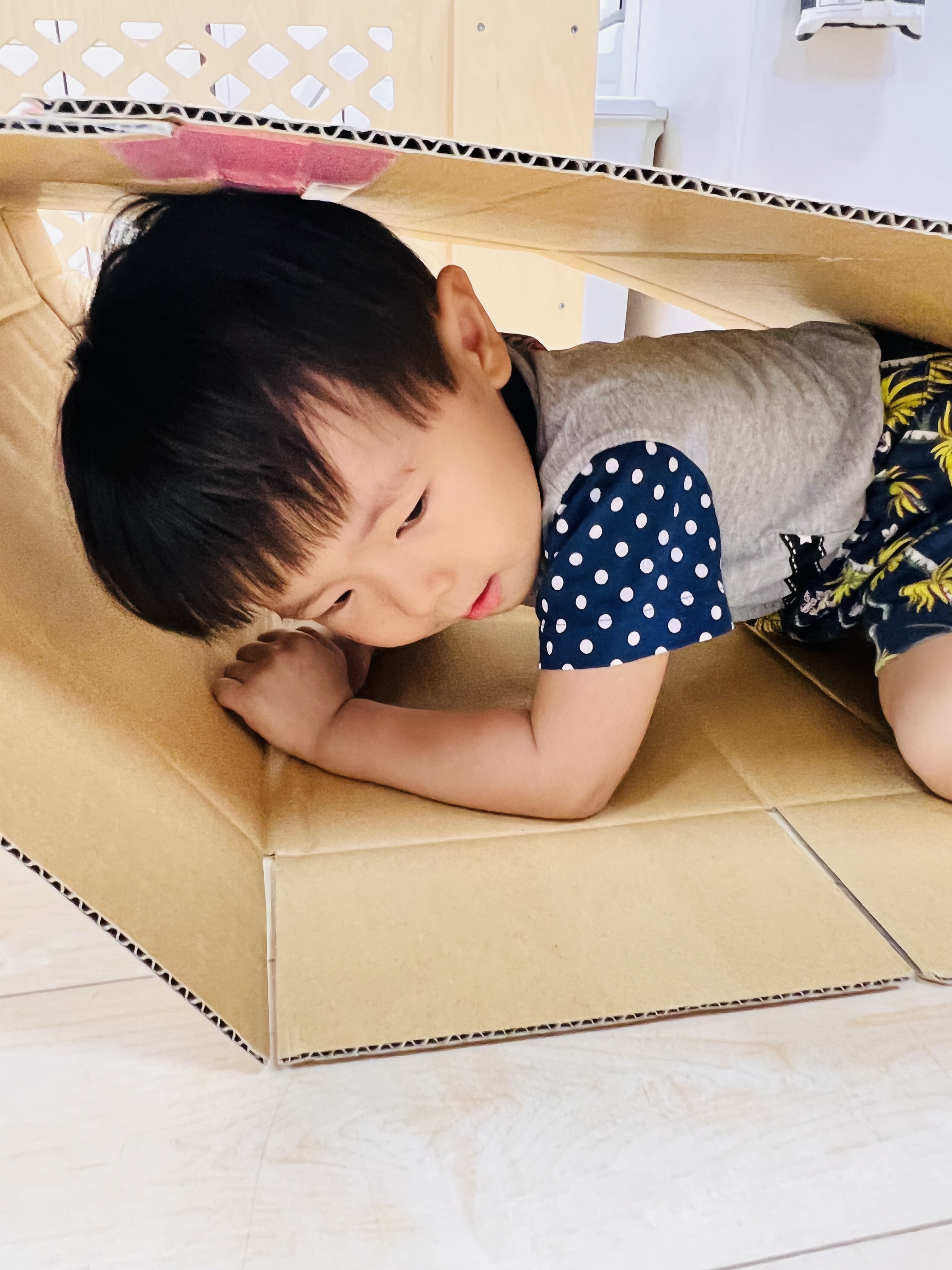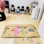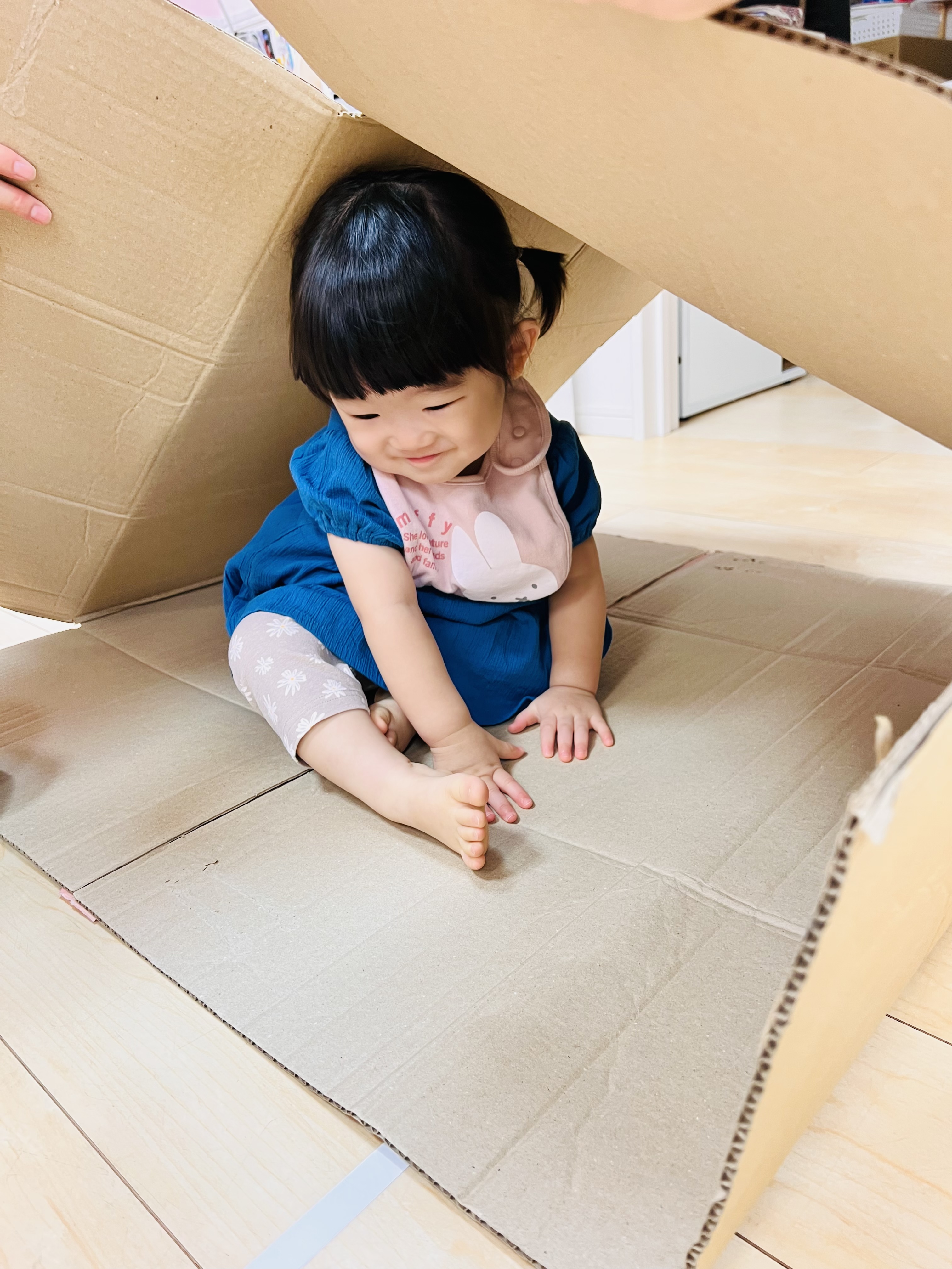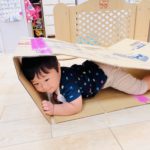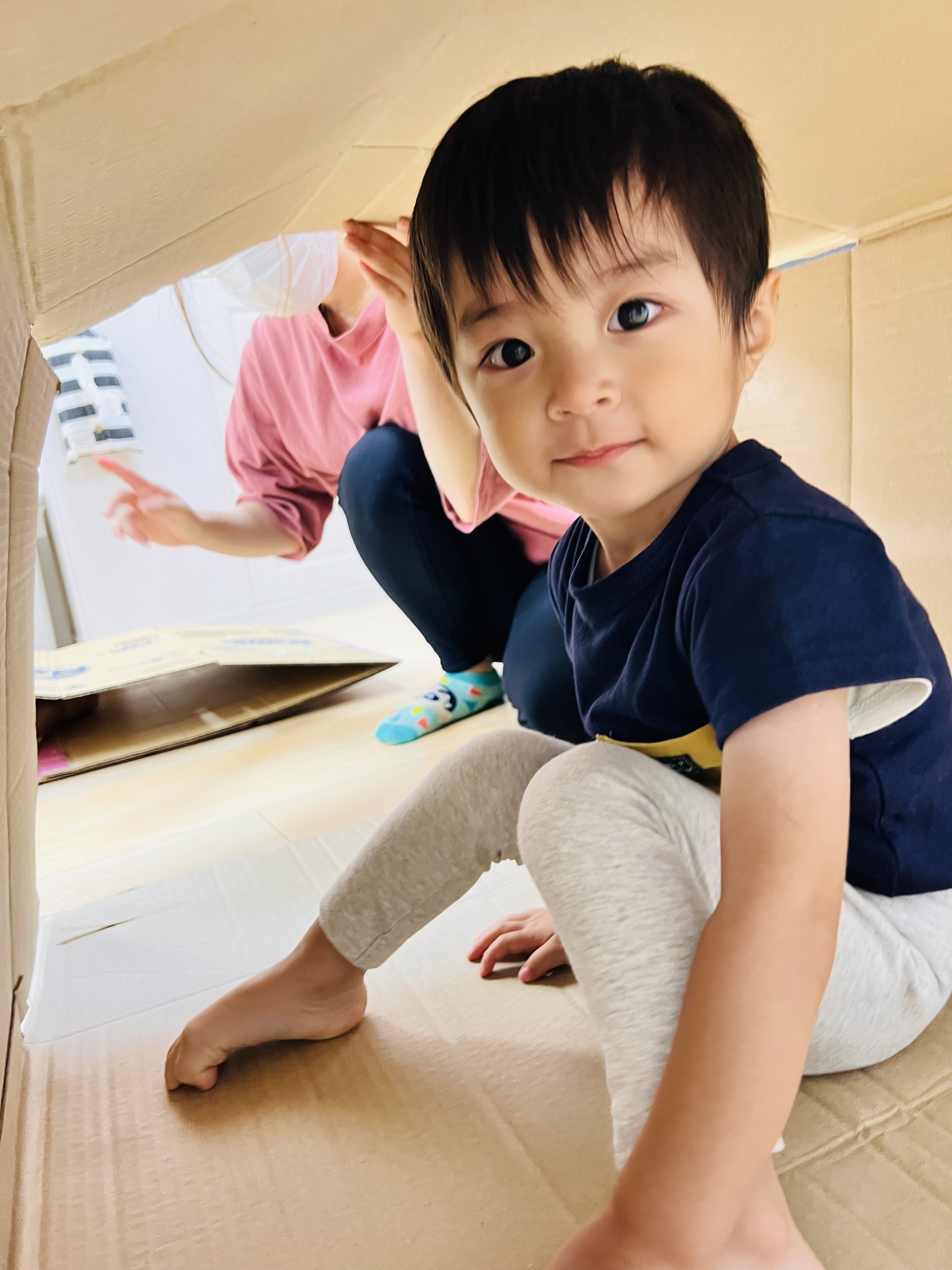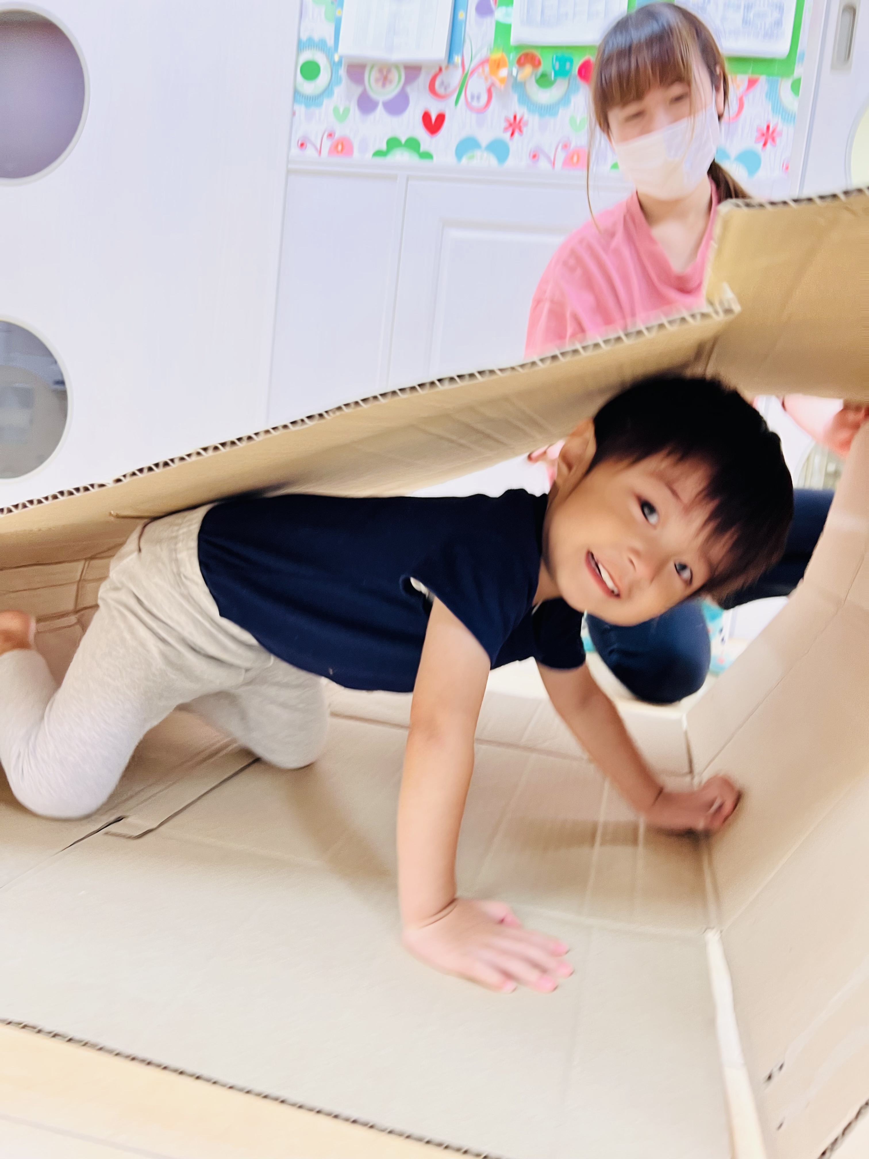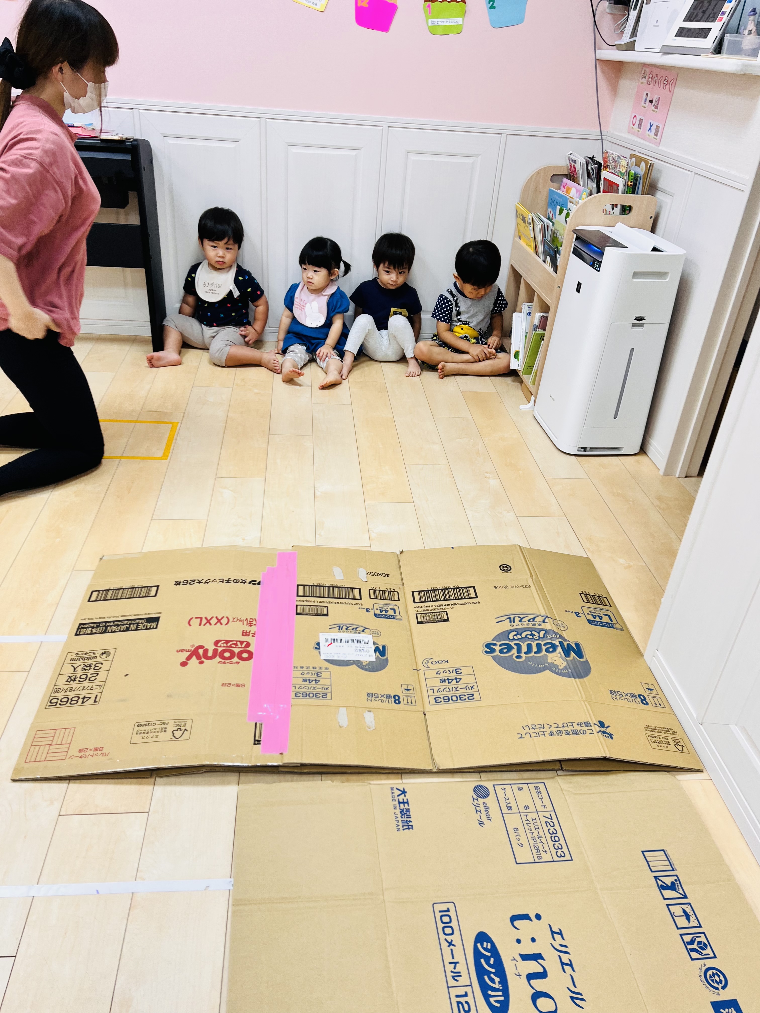 何をするんだろうと不思議そうに段ボールを見つめながら先生のお話を聞いてます😊