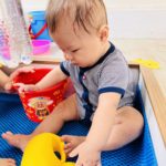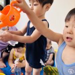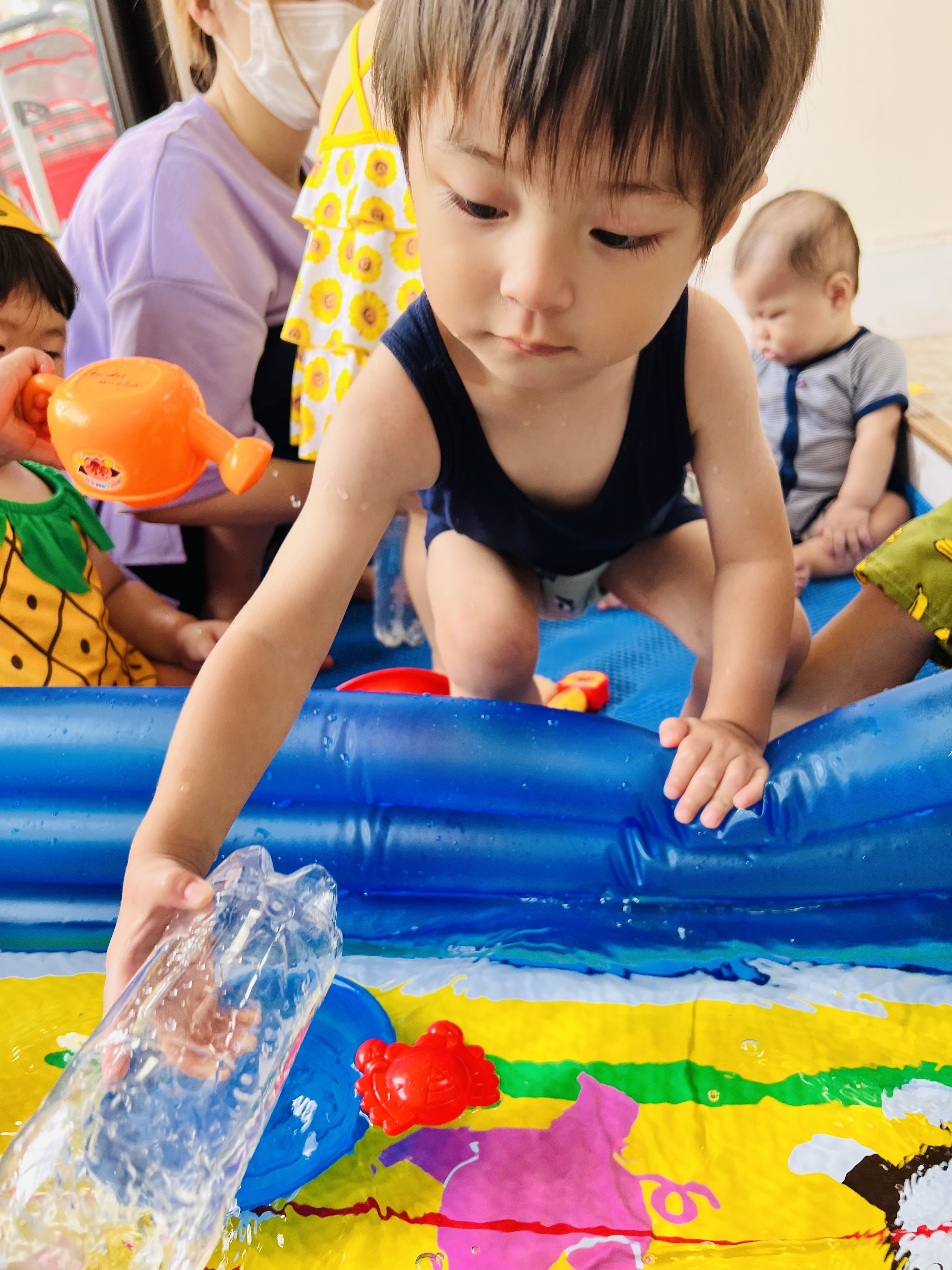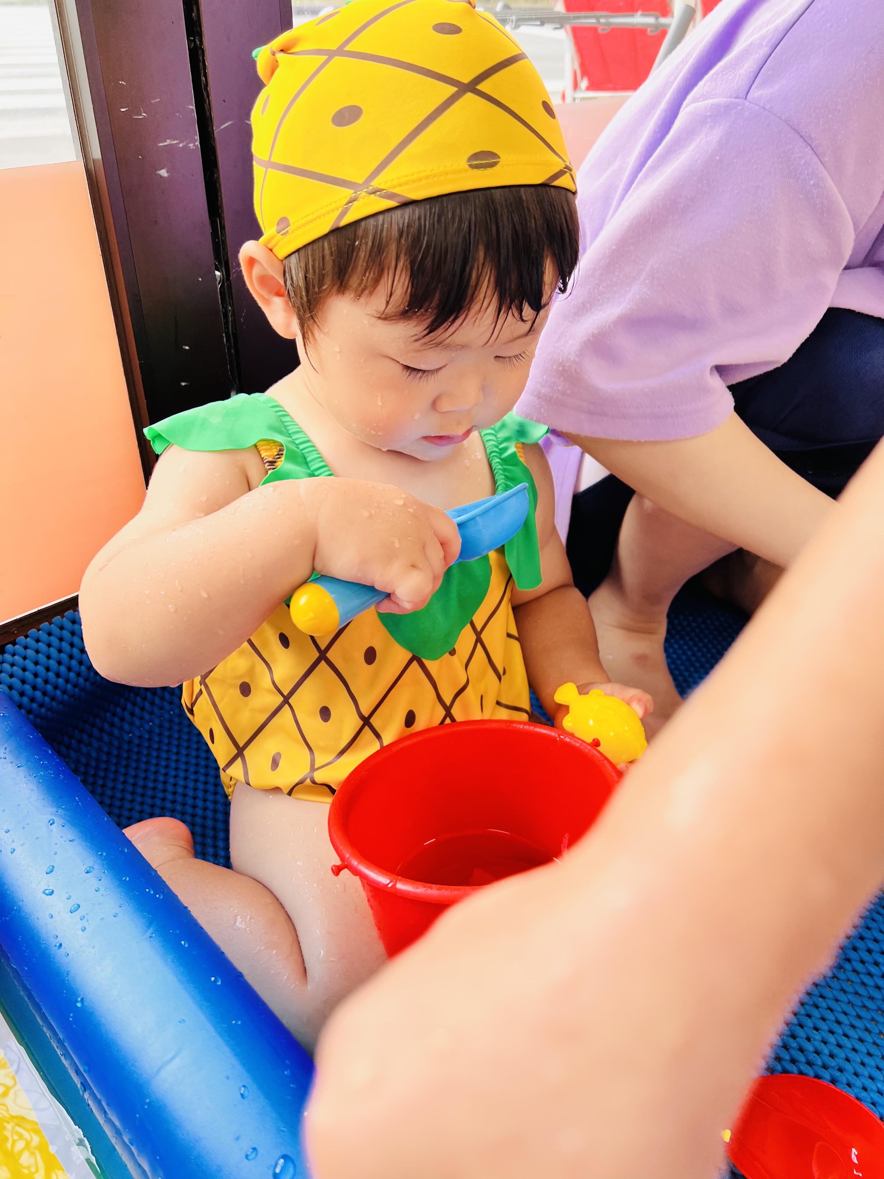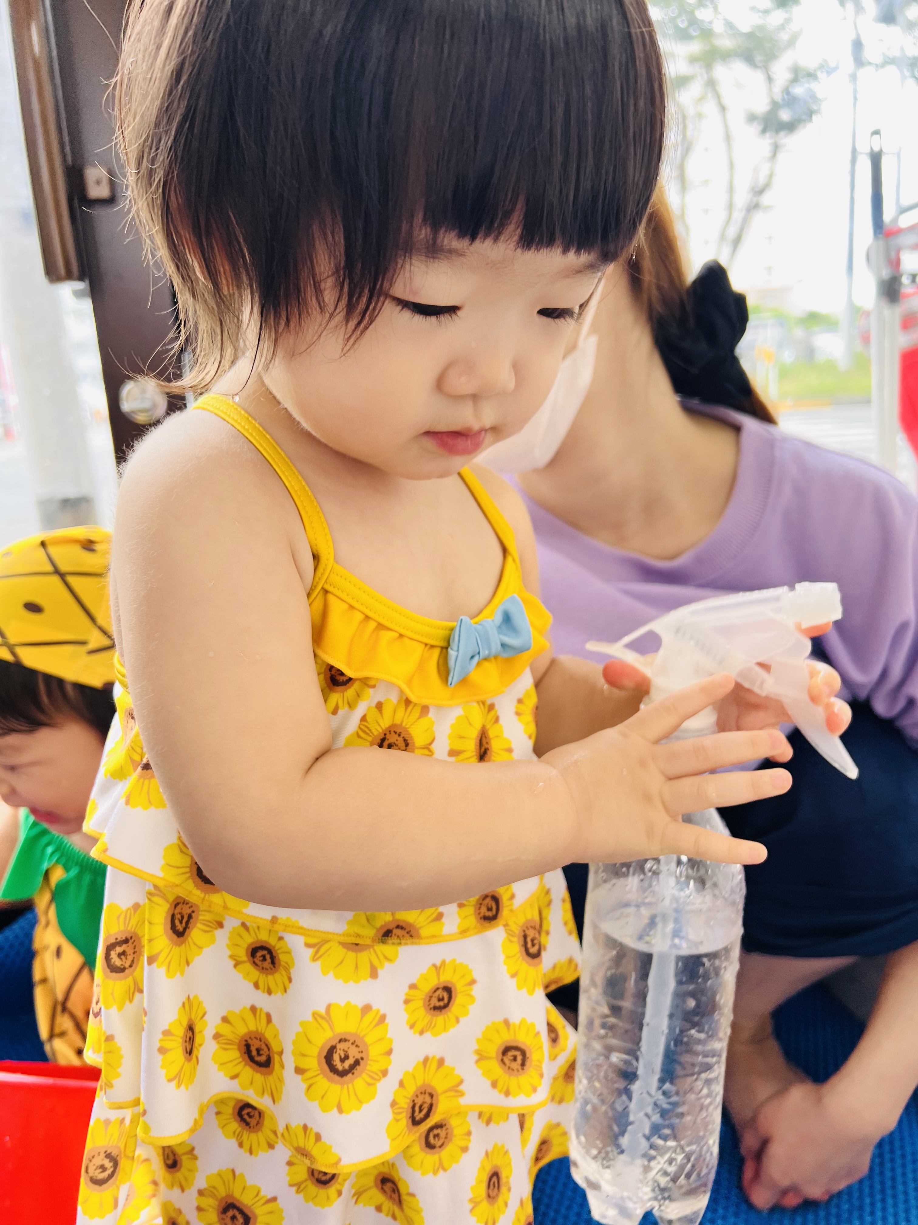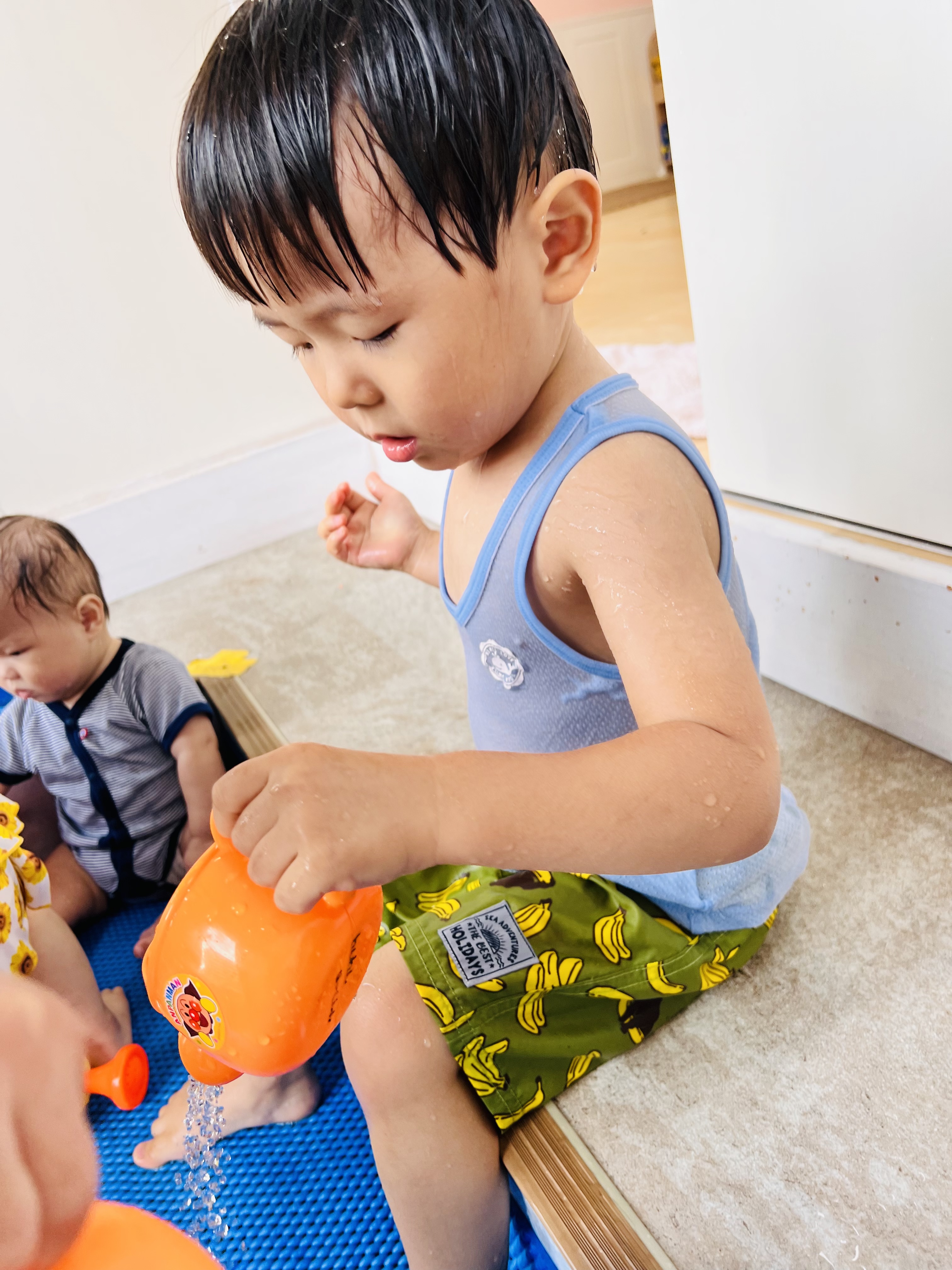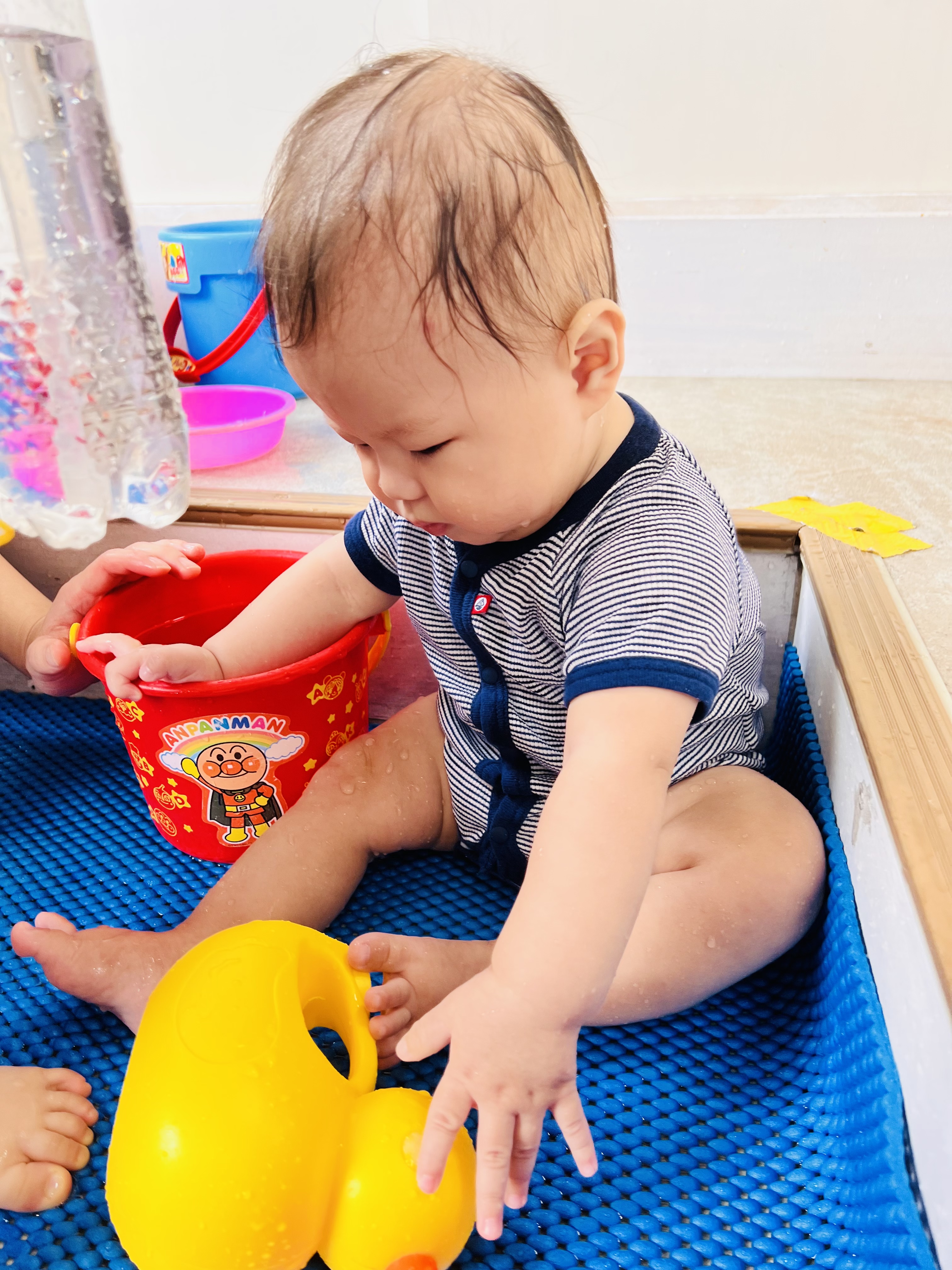 0歳児さんは水よりもバケツやジョウロをニギニギするのに夢中です🥰