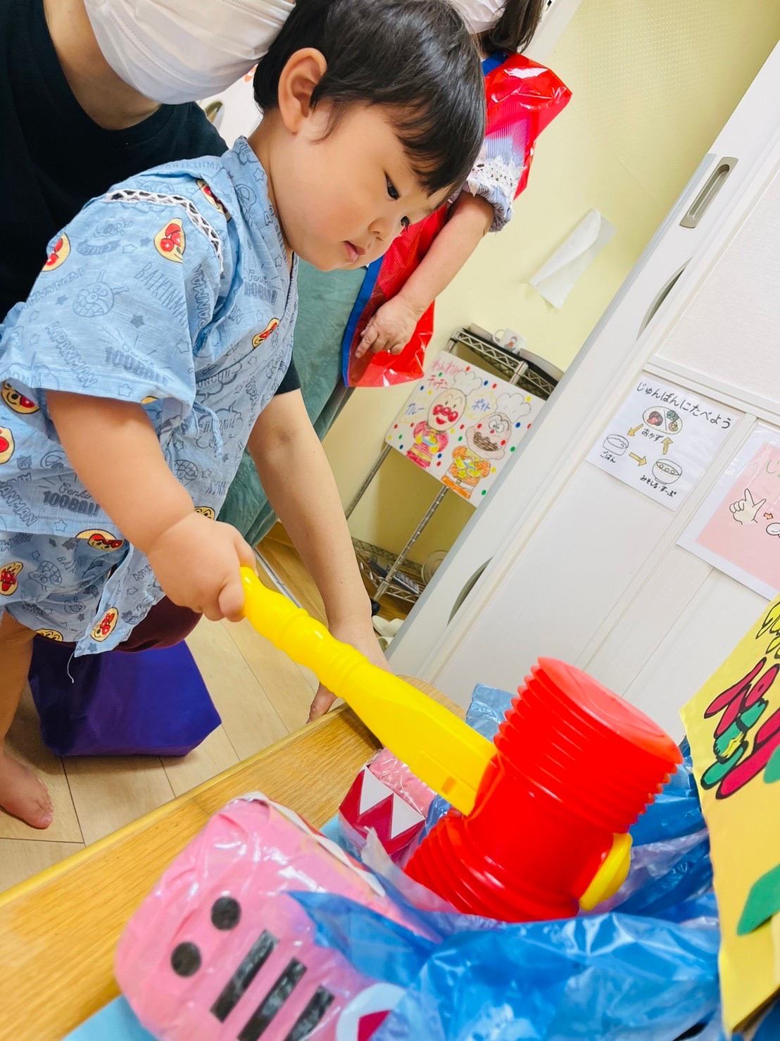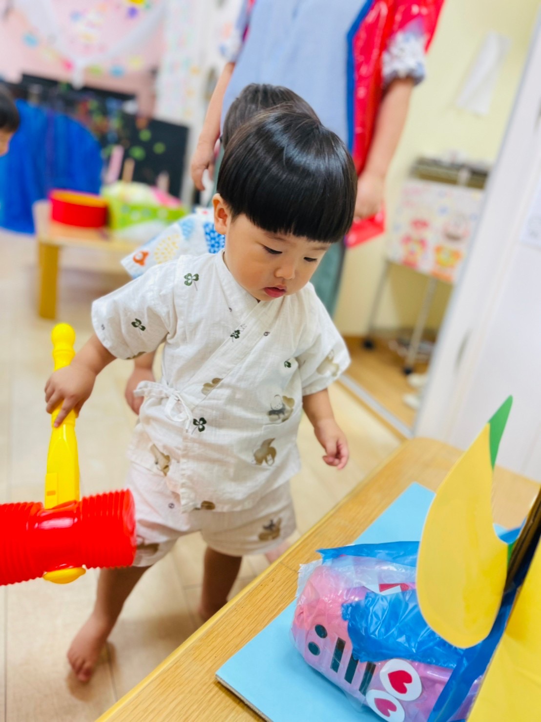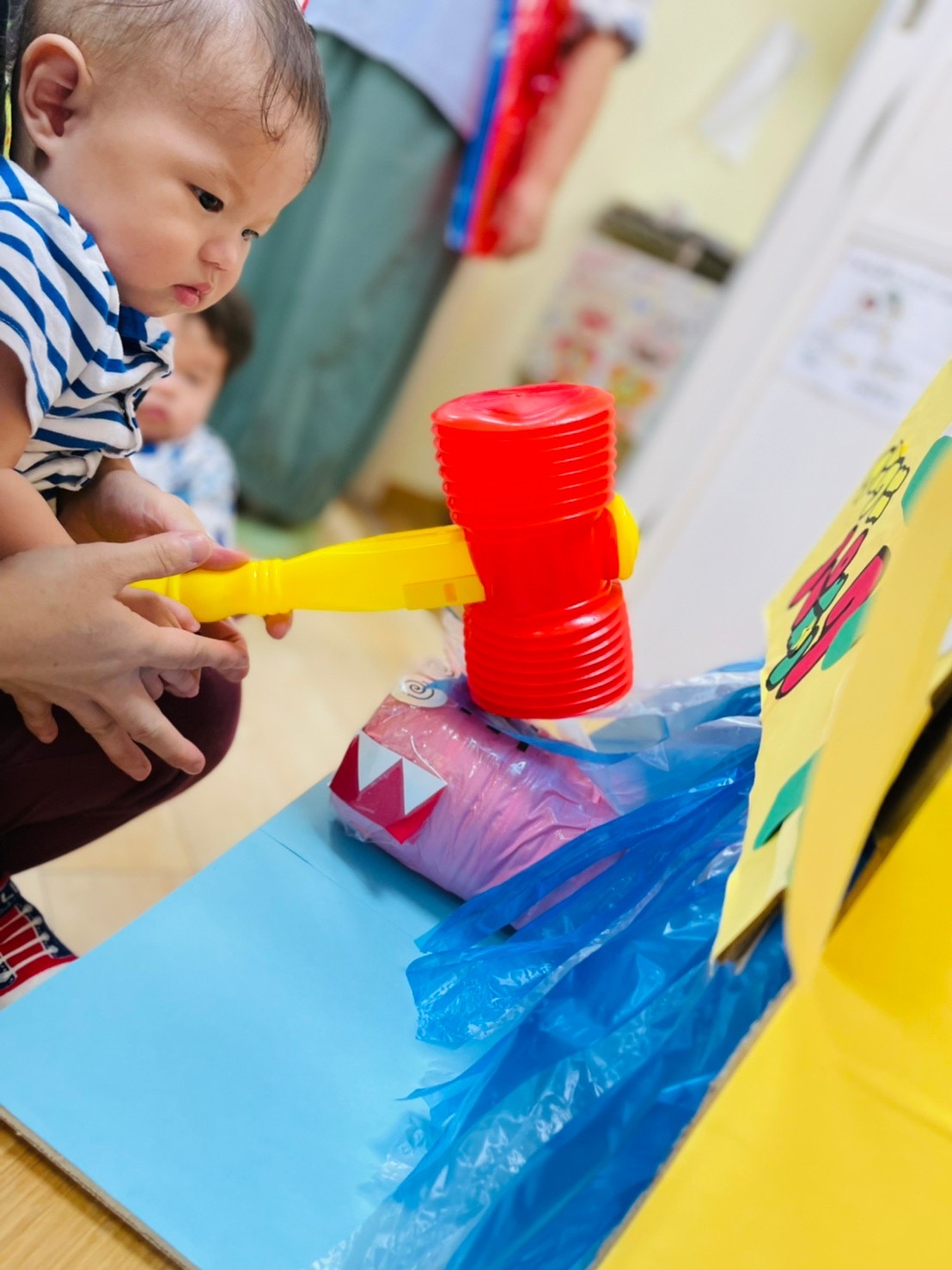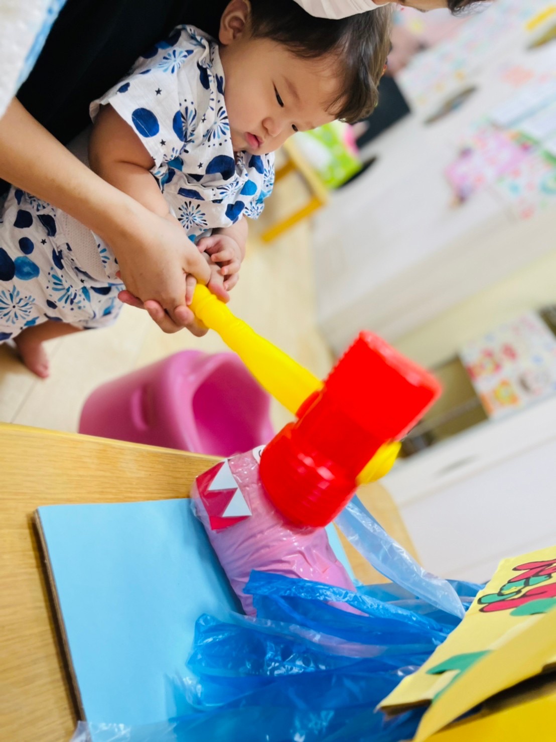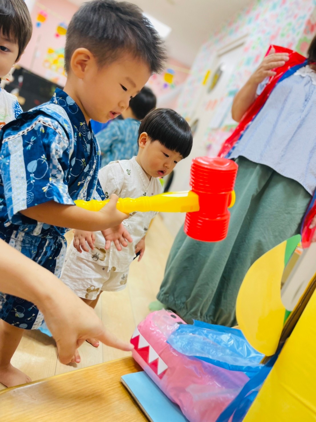 やる気いっぱい叩くお友達もいれば、先生の側で恐る恐るハンマーを握る子も😊