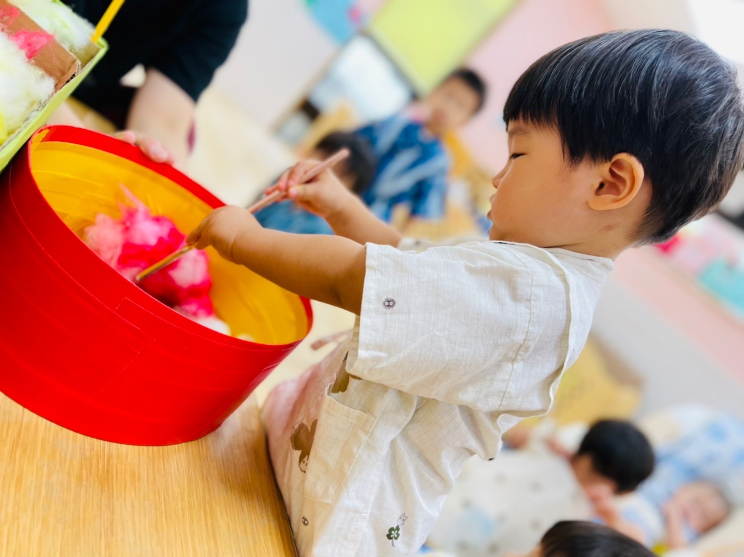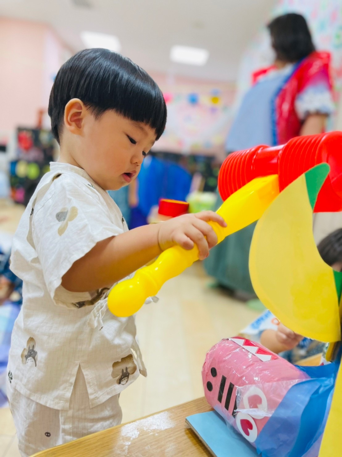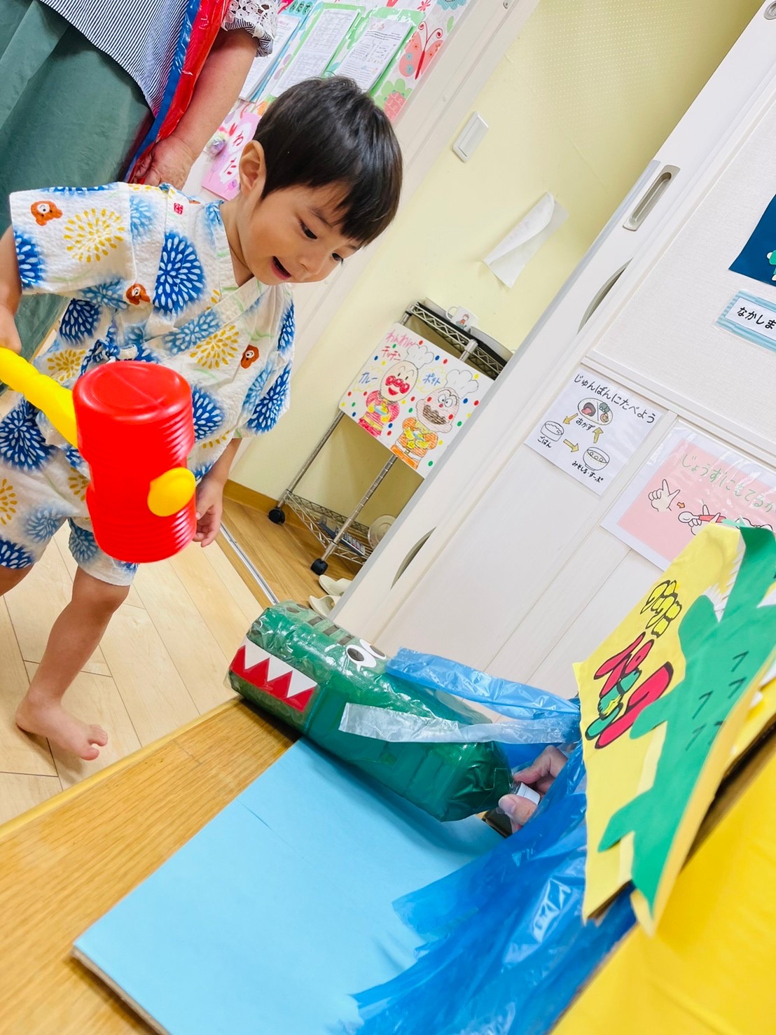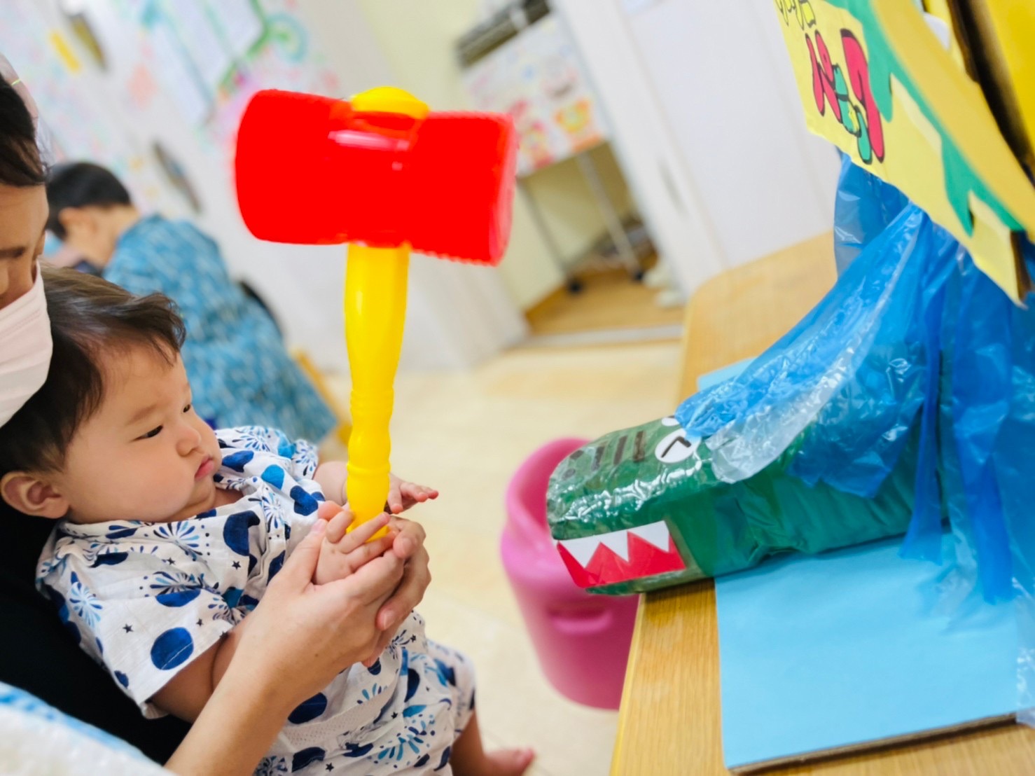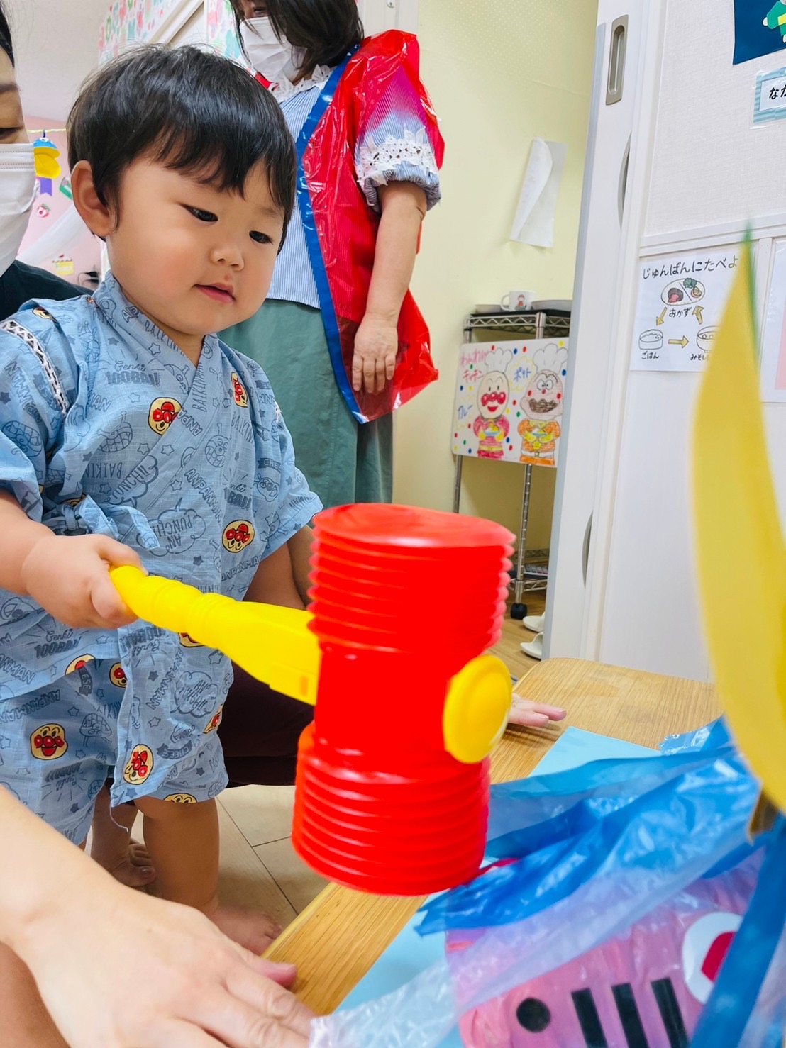 やる気いっぱい叩くお友達もいれば、先生の側で恐る恐るハンマーを握る子も😊