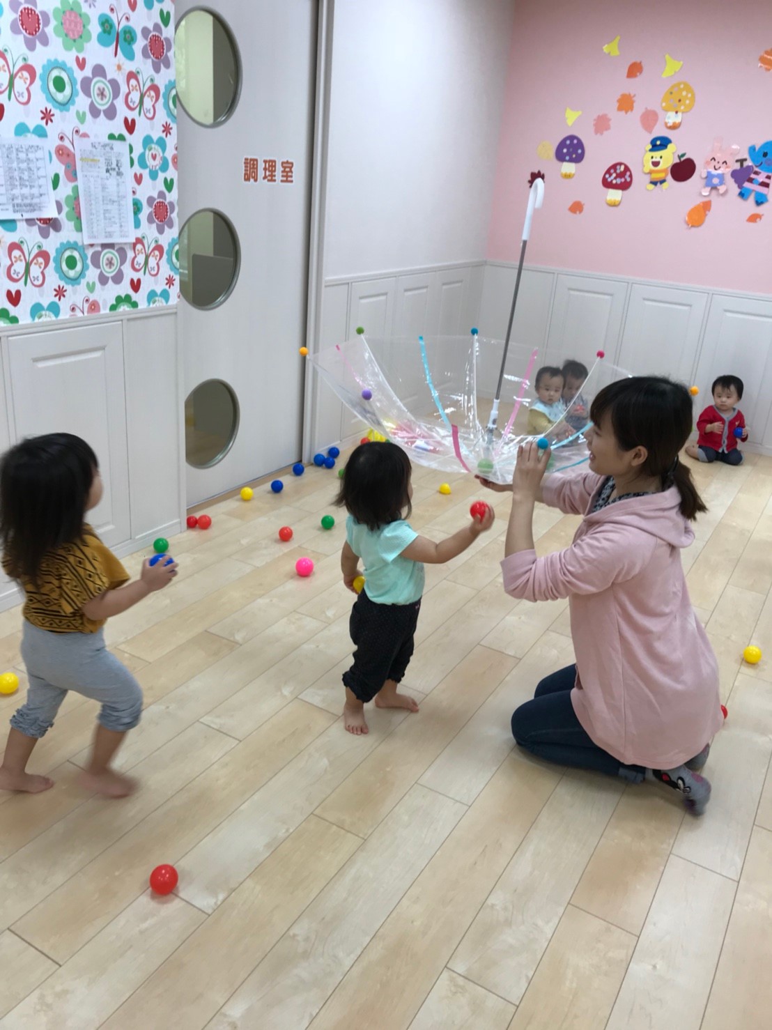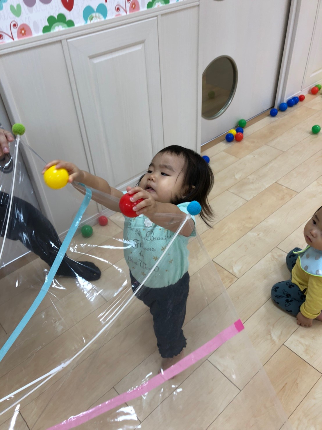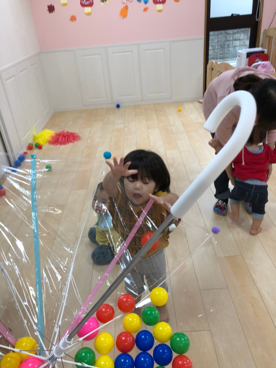 自分達でボールを傘の中に入れられるかな??