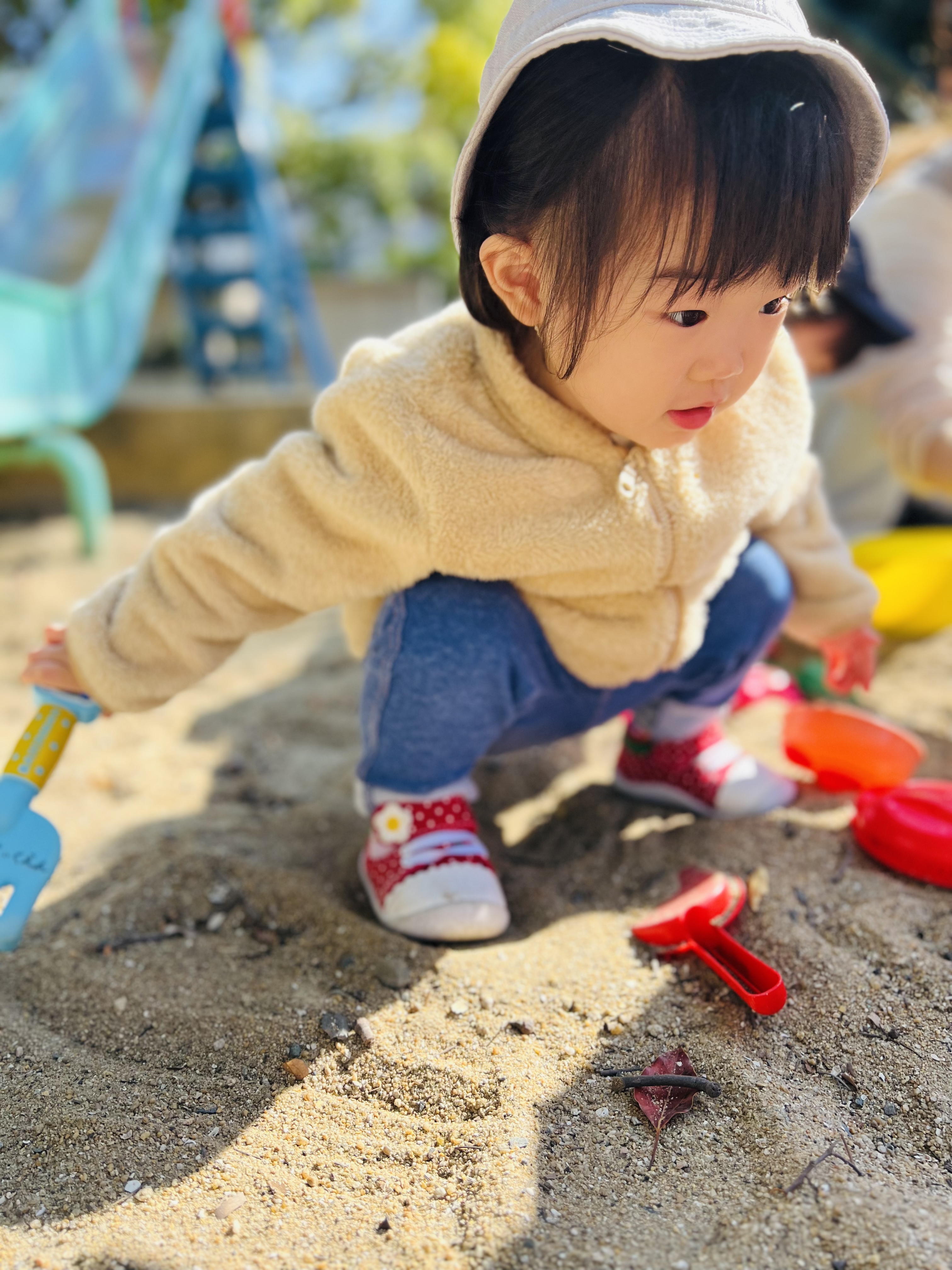 砂の感触がちょっと嫌なお友達😊今日はお砂場のおもちゃに手を伸ばし、どこかへ運ぼうとやる気いっぱいです✨