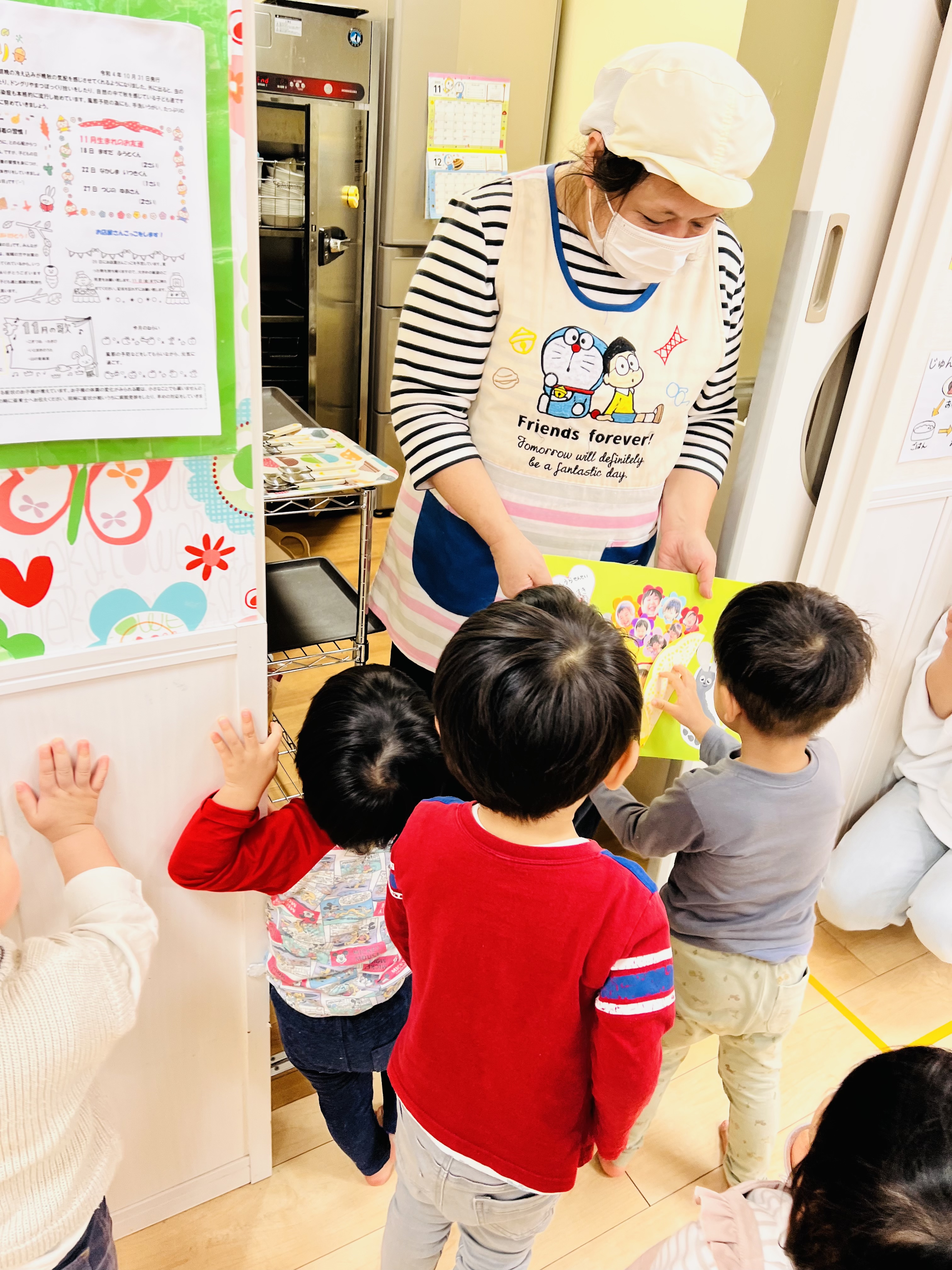 1日早いけれど…いつも美味しいおやつや給食を作ってくださる調理の先生へプレゼントを渡しに行きました😊