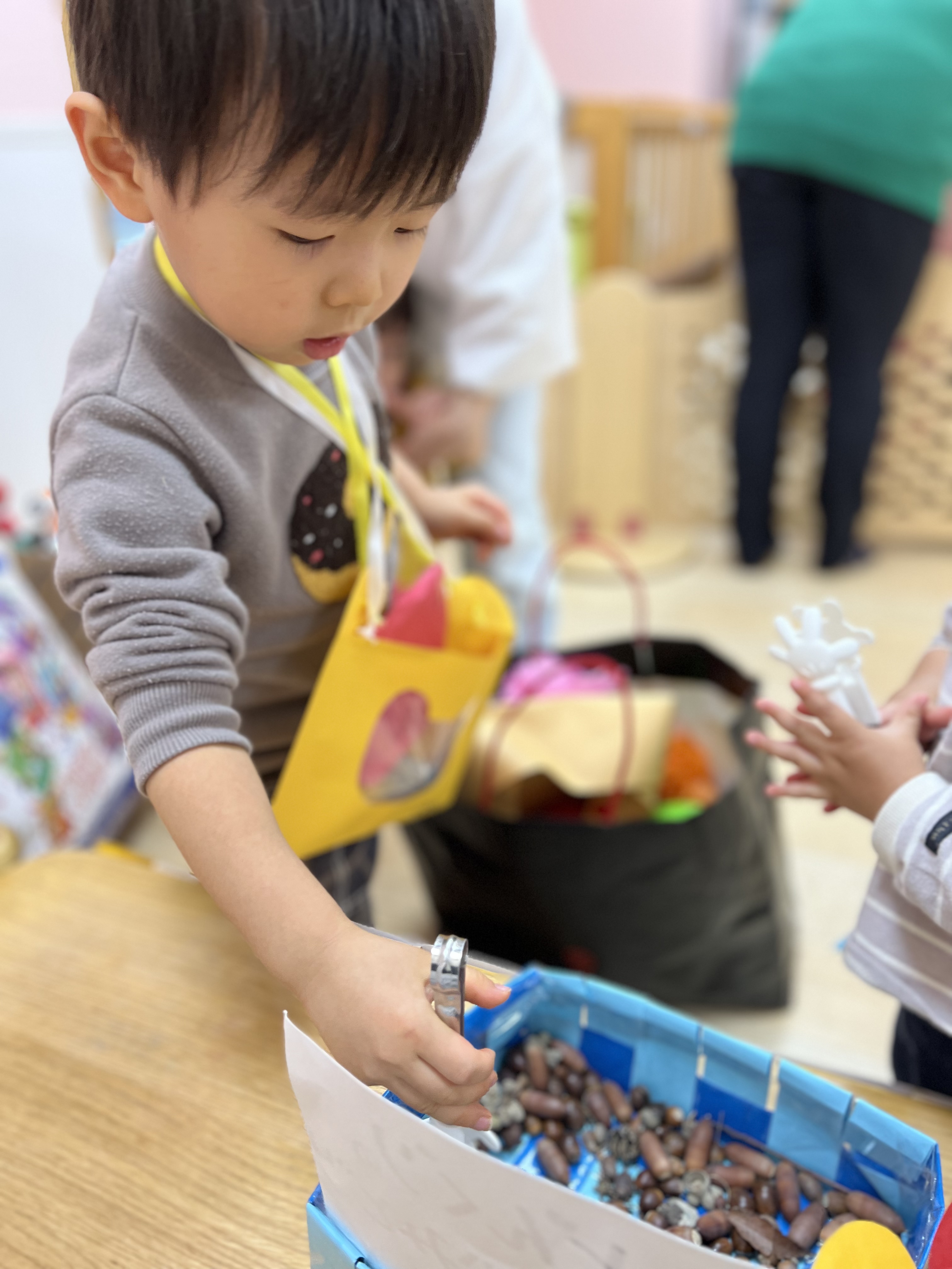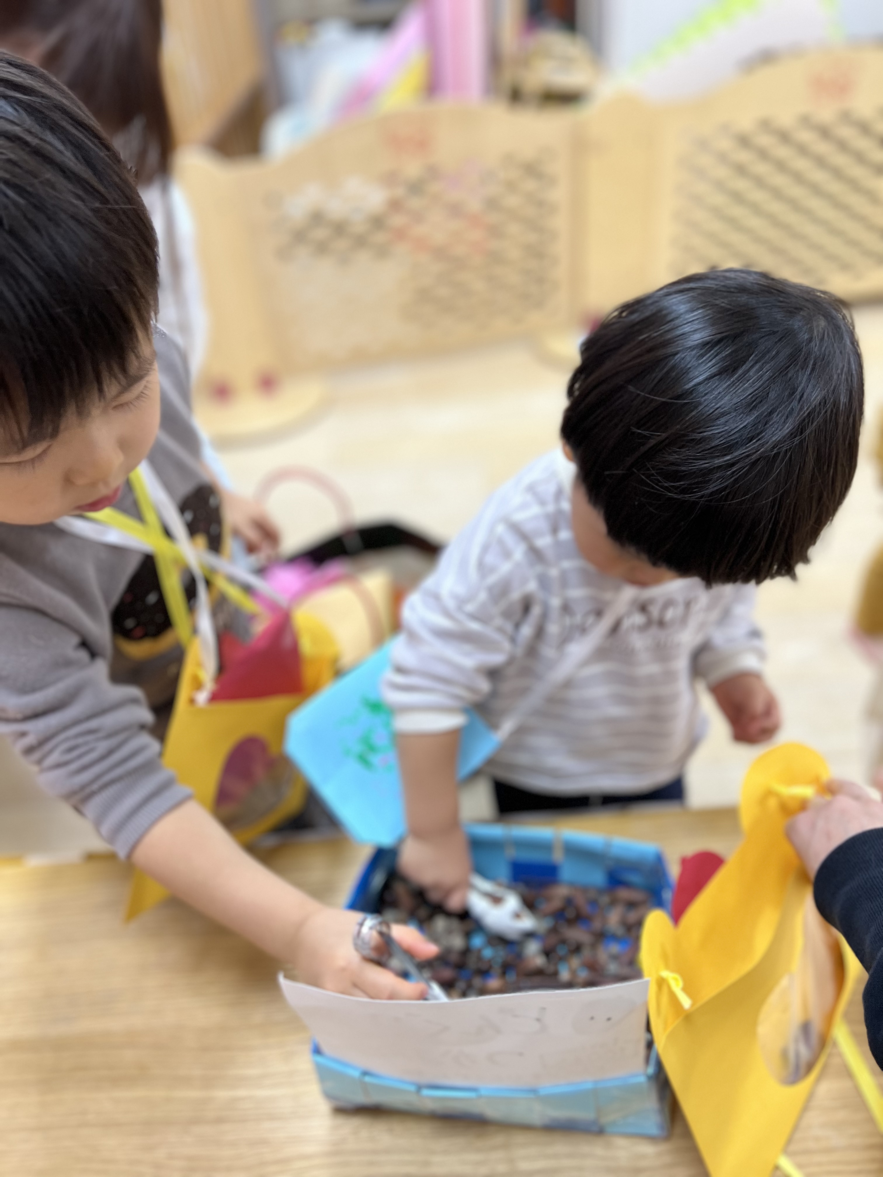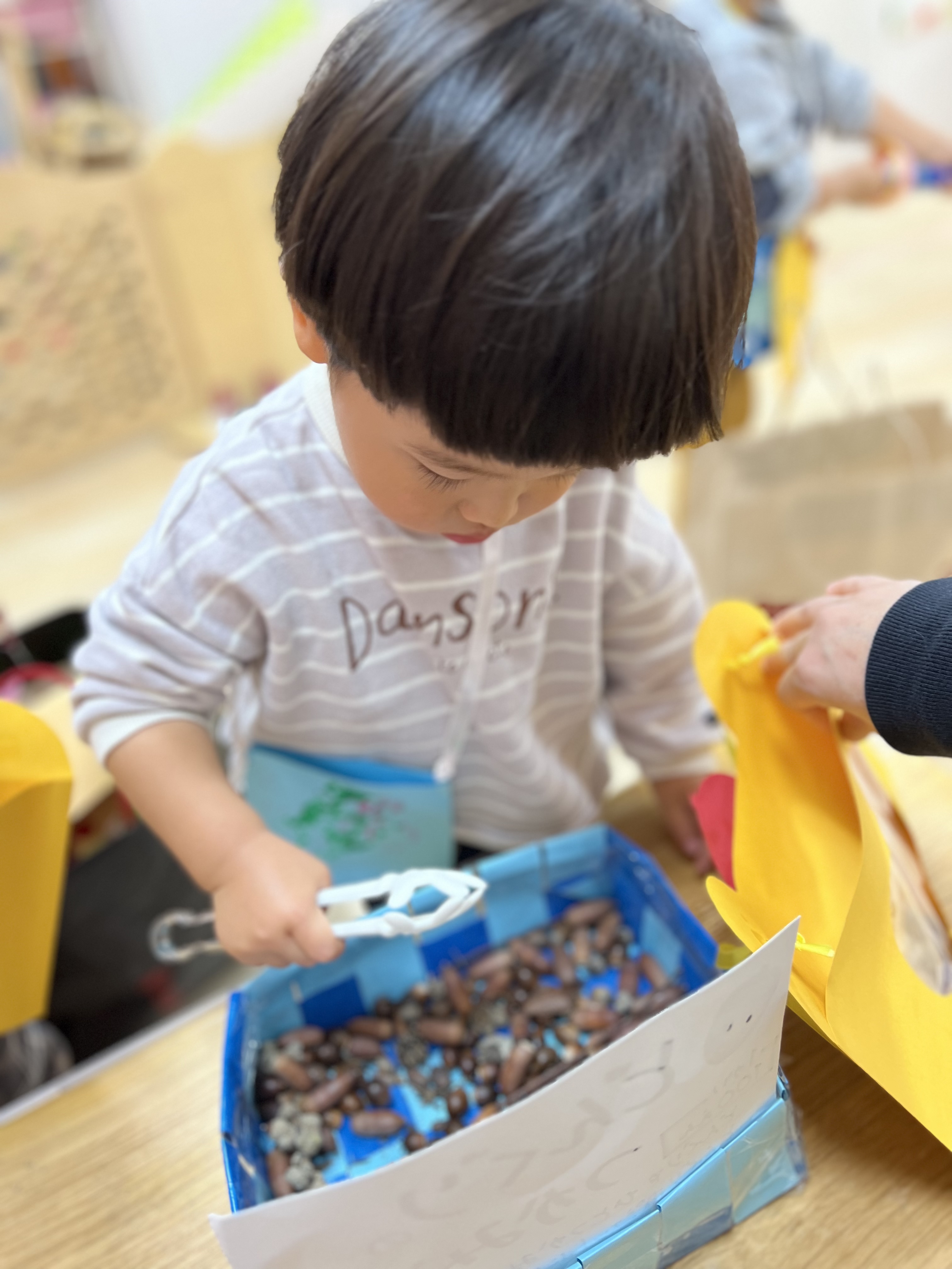 トングで上手につまんで、くまさんポシェットへ入れました😊