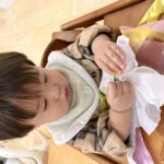 0歳児さんがたくさん絵本をだすと、1.2歳児のお兄さんお姉さんが「1こずつよ✨」とお片付けを教えてくれています😊