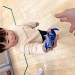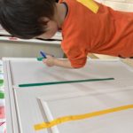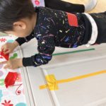 順番は関係ない!と白い線の上を動きながら色々な場所にシールを貼るお友達♫