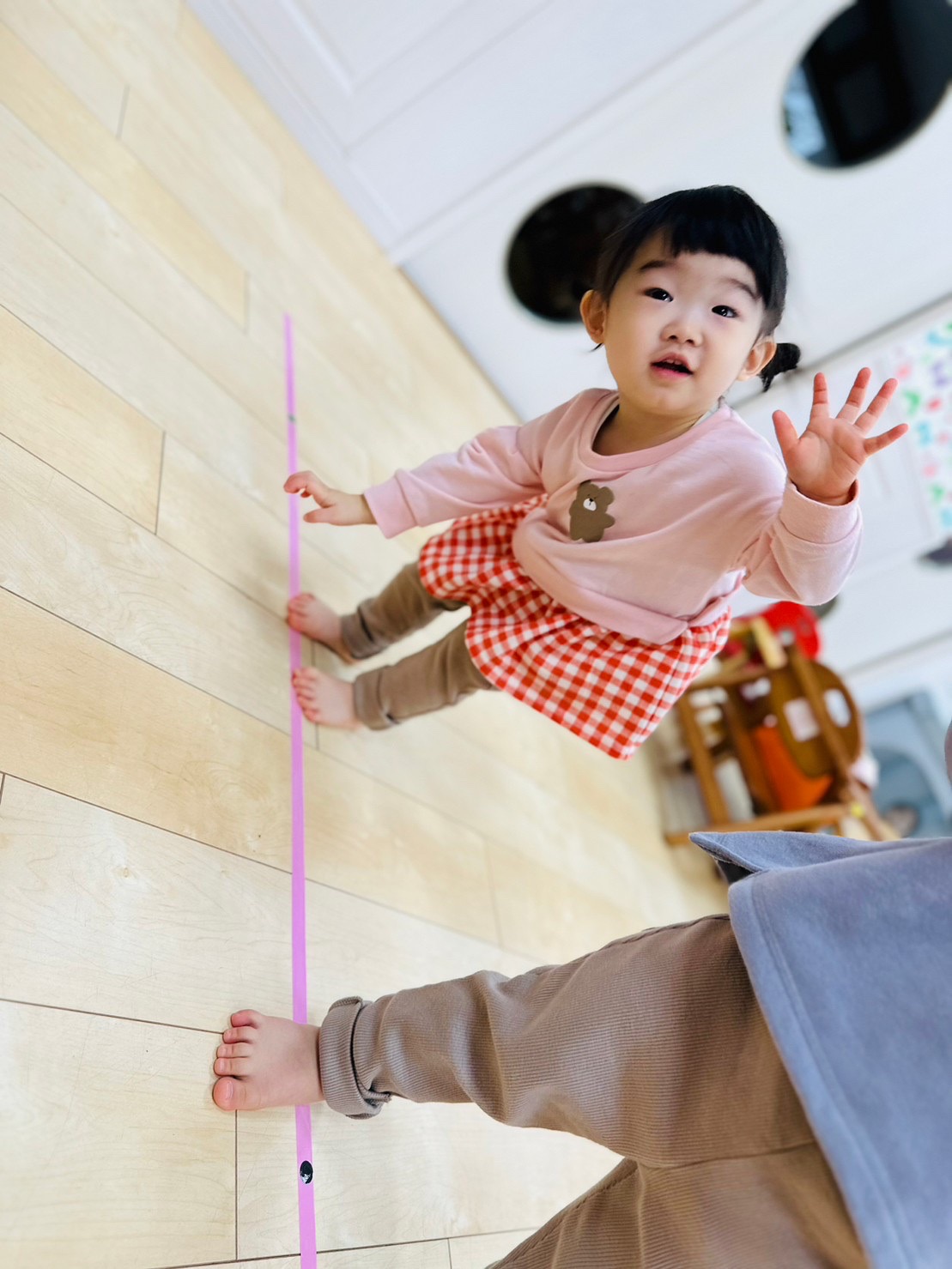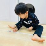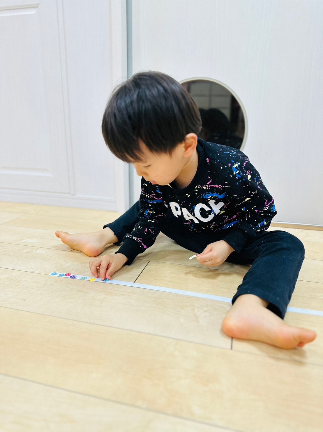 順番は関係ない!と白い線の上を動きながら色々な場所にシールを貼るお友達♫