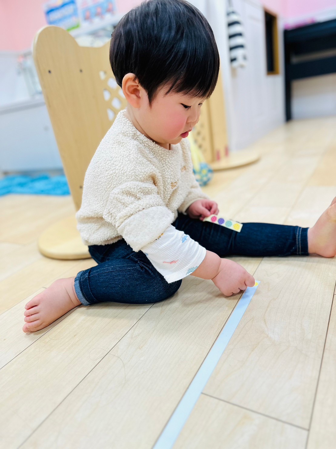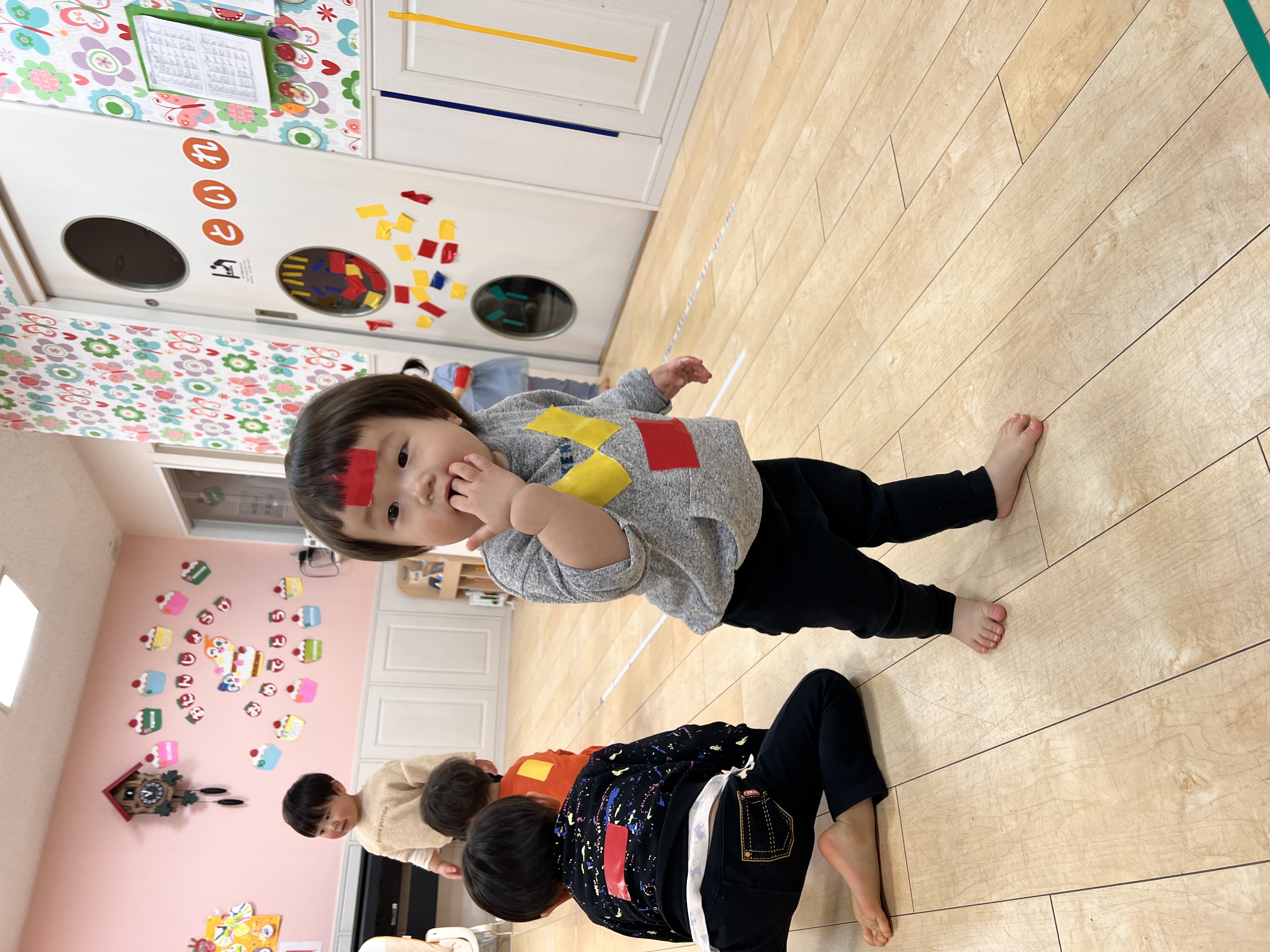 椅子と机は片付けてお部屋全体を使ってシール遊びをしましたよ♫