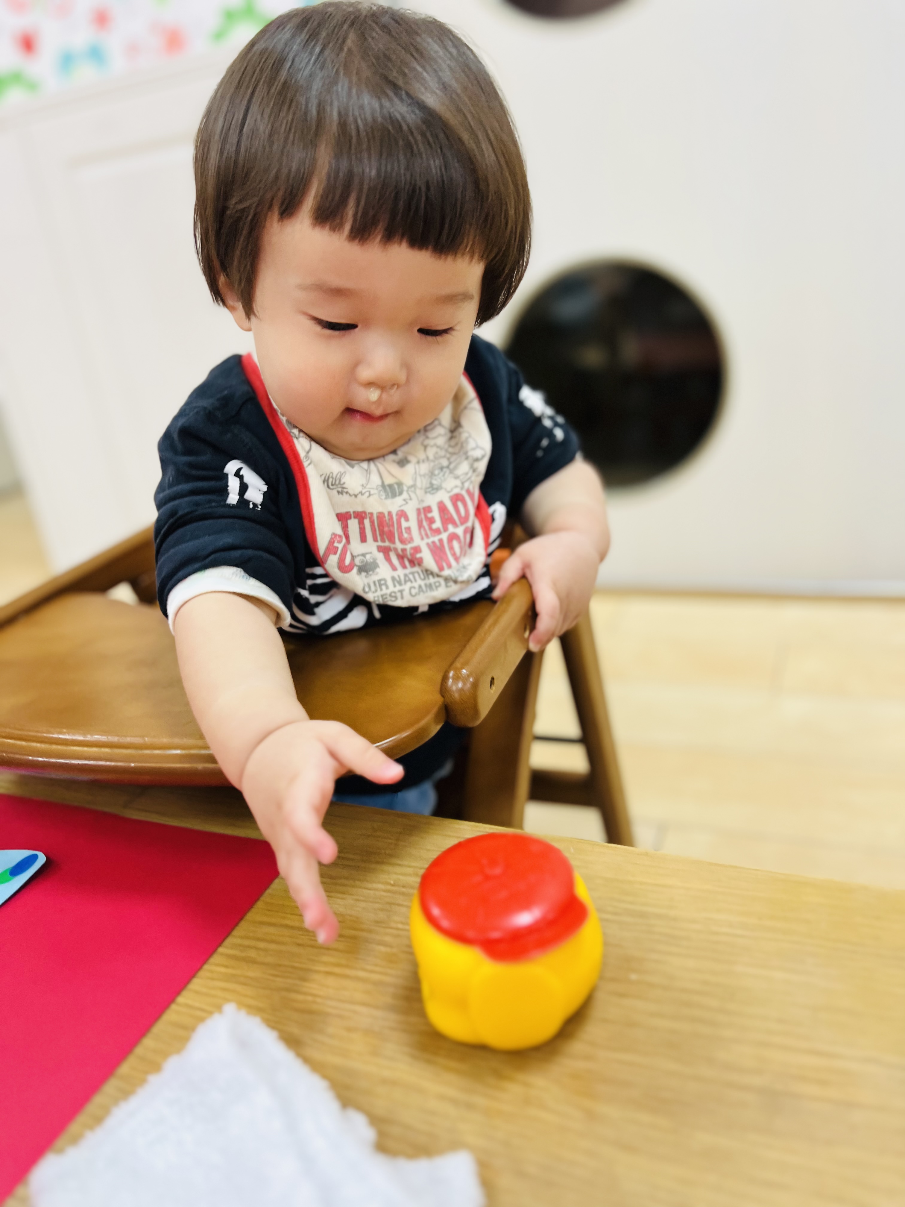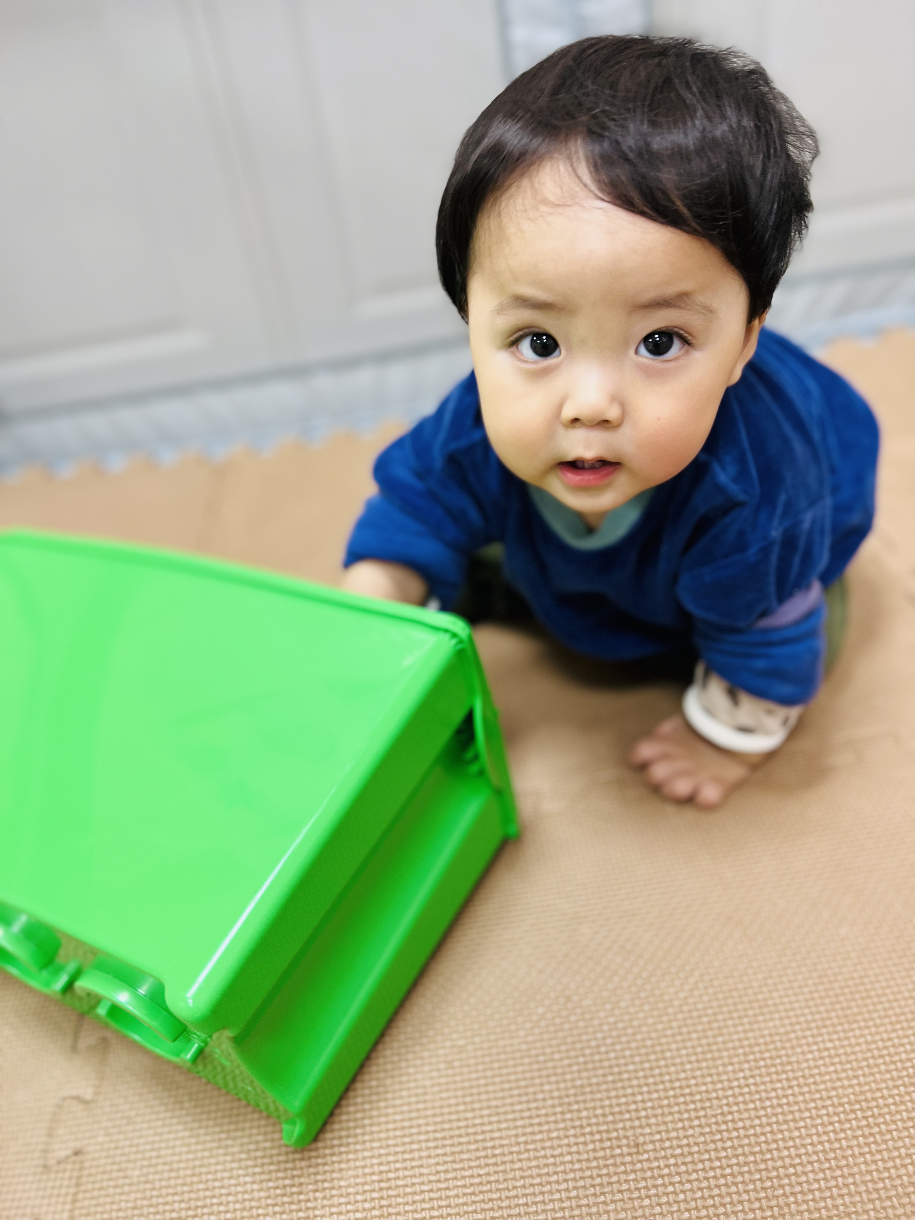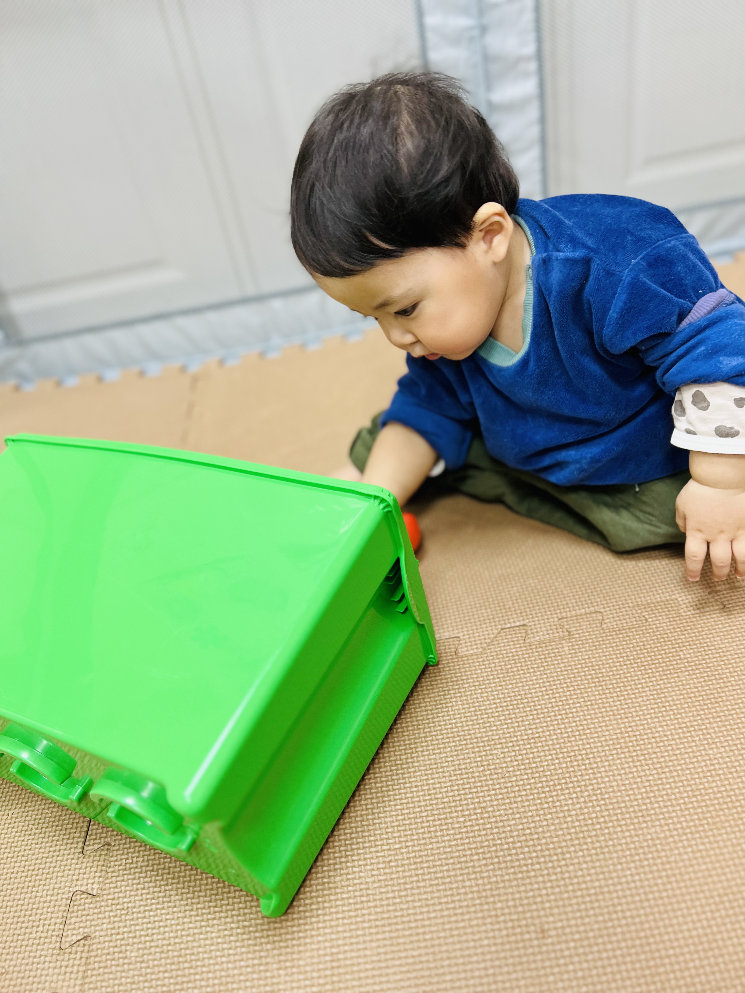 箱に隠したボールを出し入れするのに夢中な0歳児さんです😊