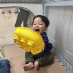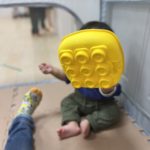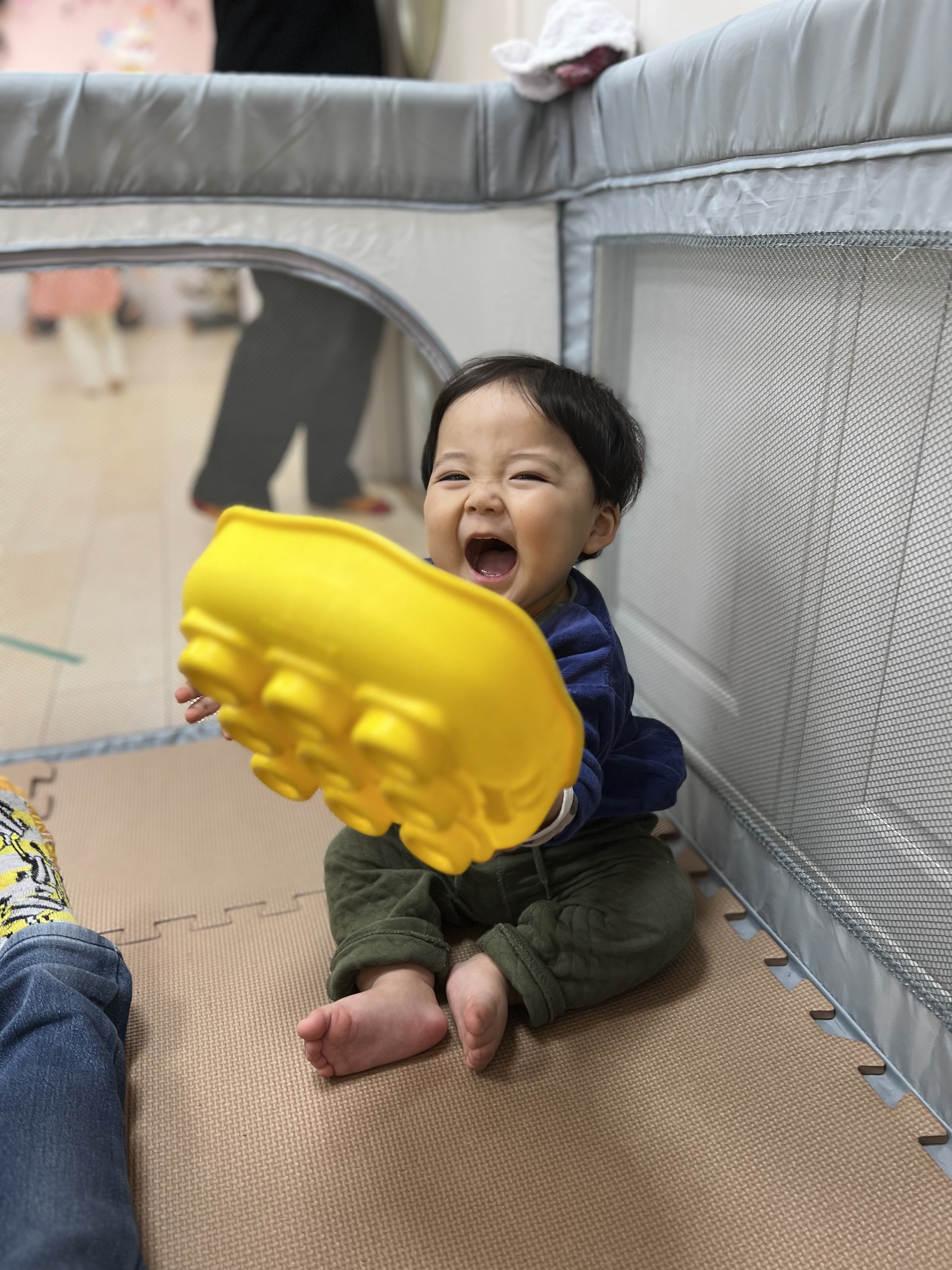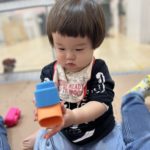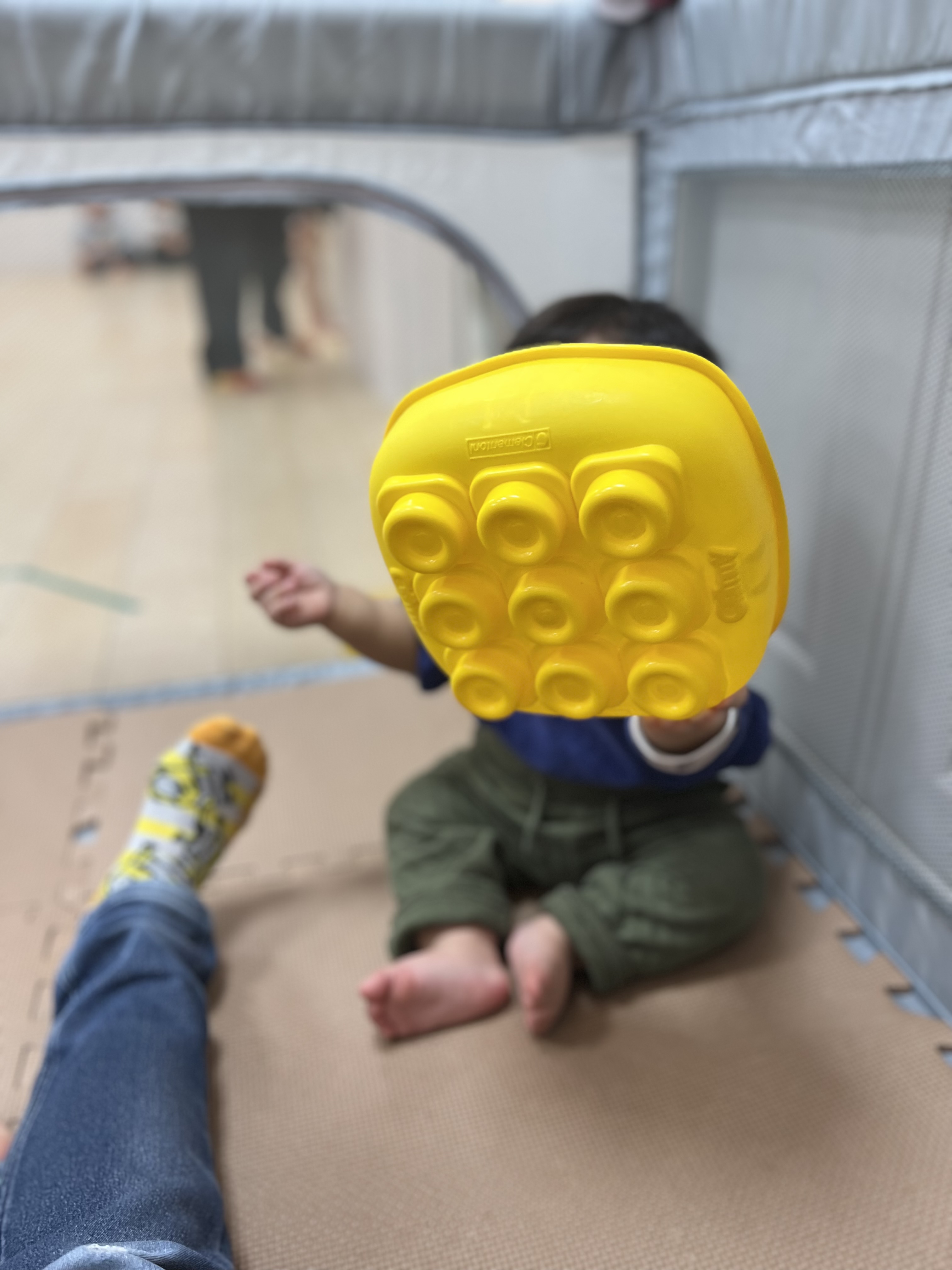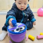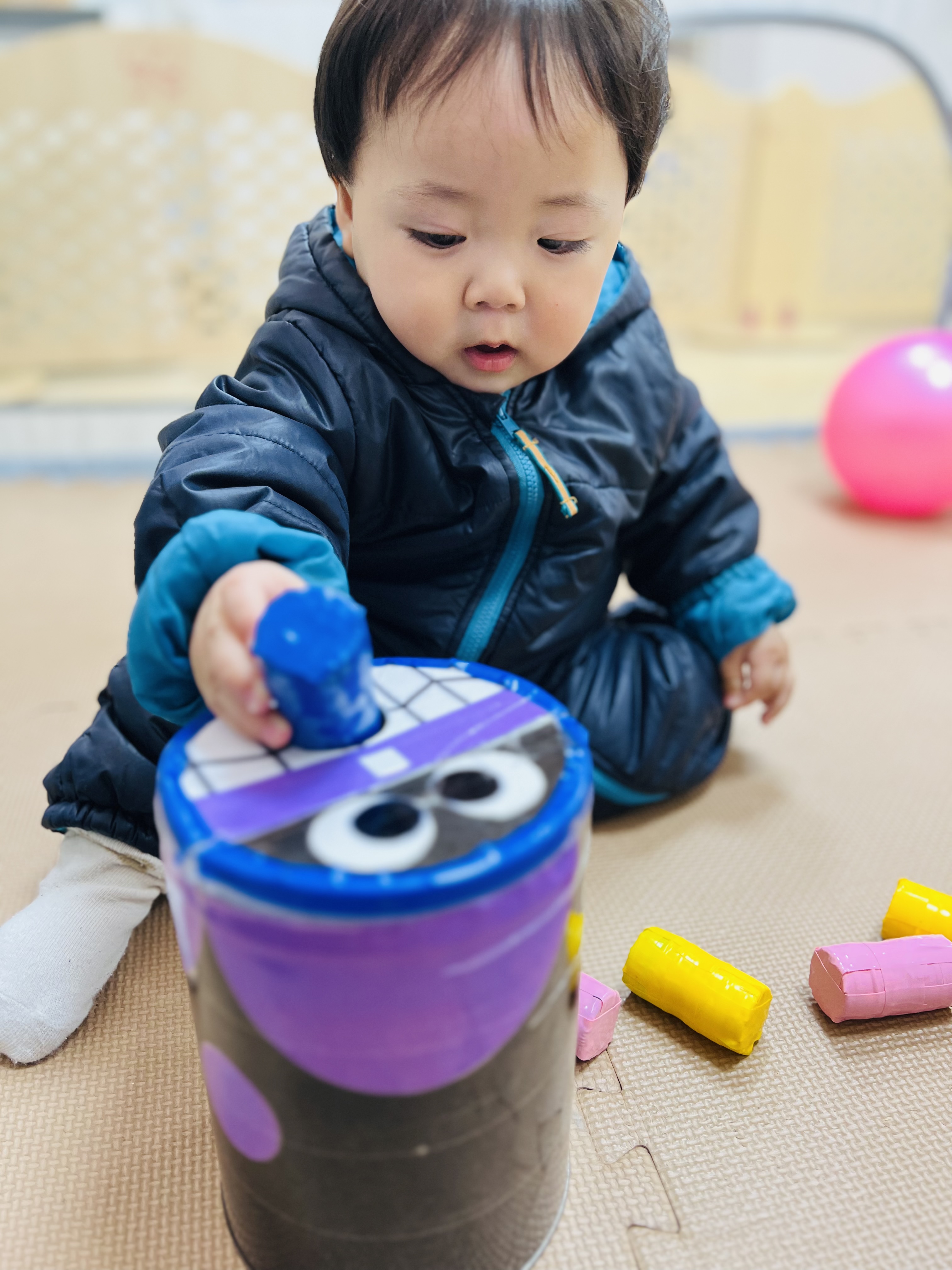箱に隠したボールを出し入れするのに夢中な0歳児さんです😊