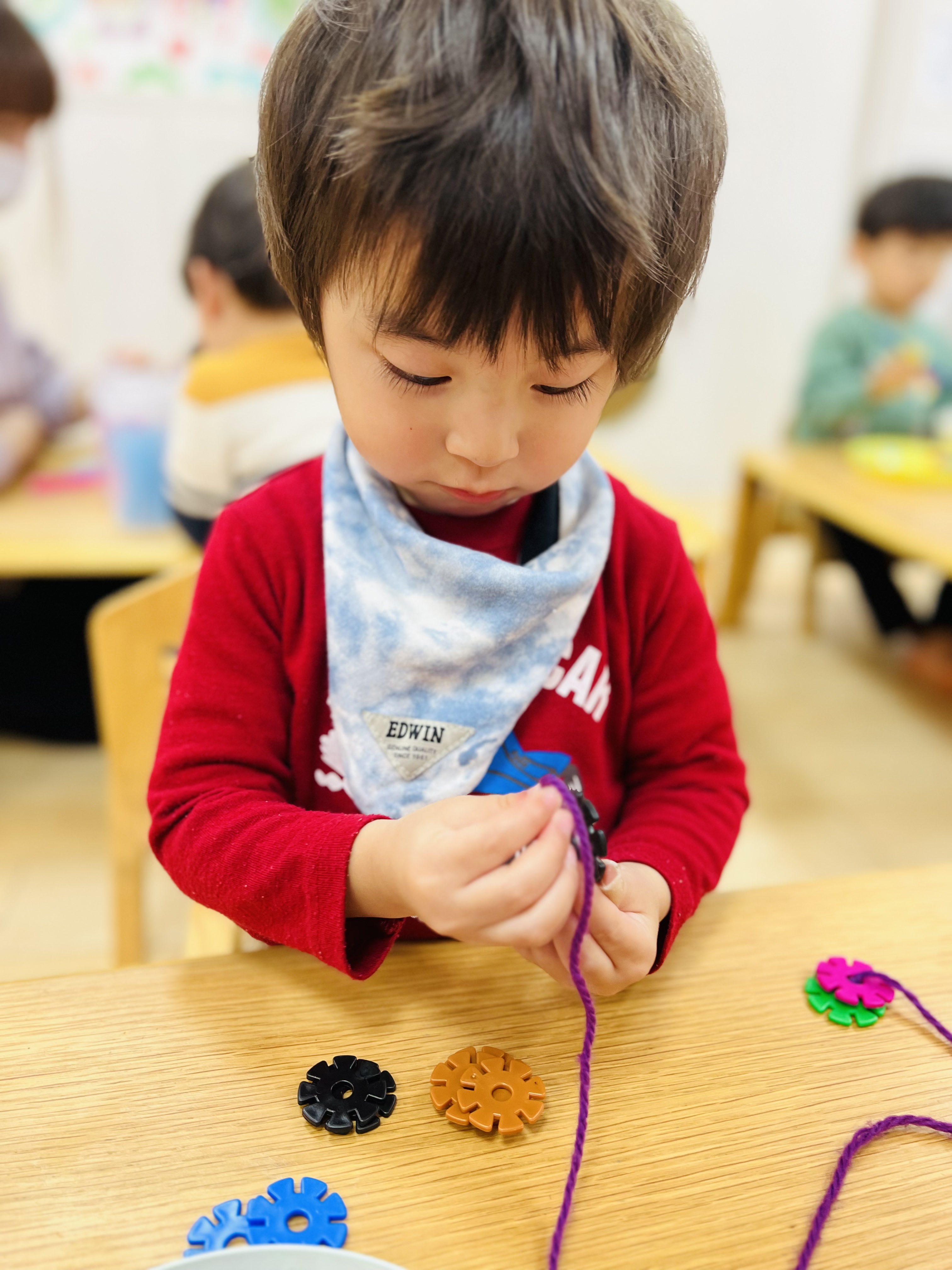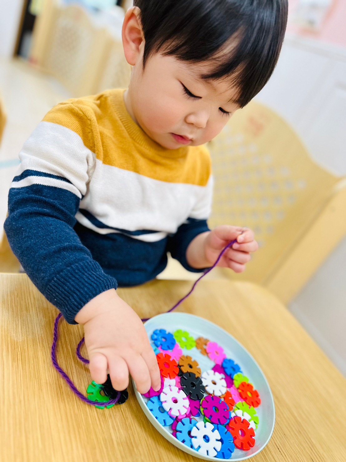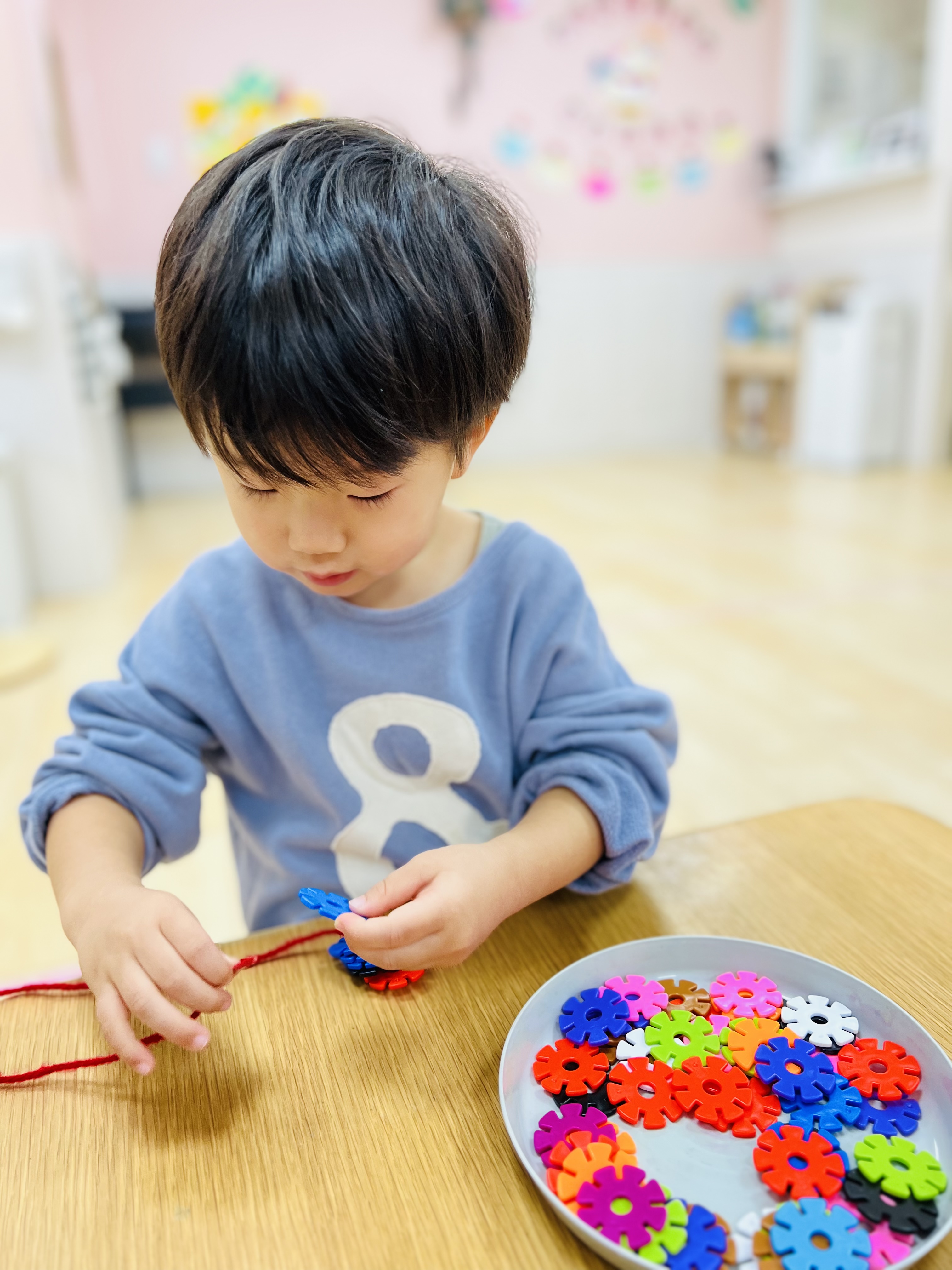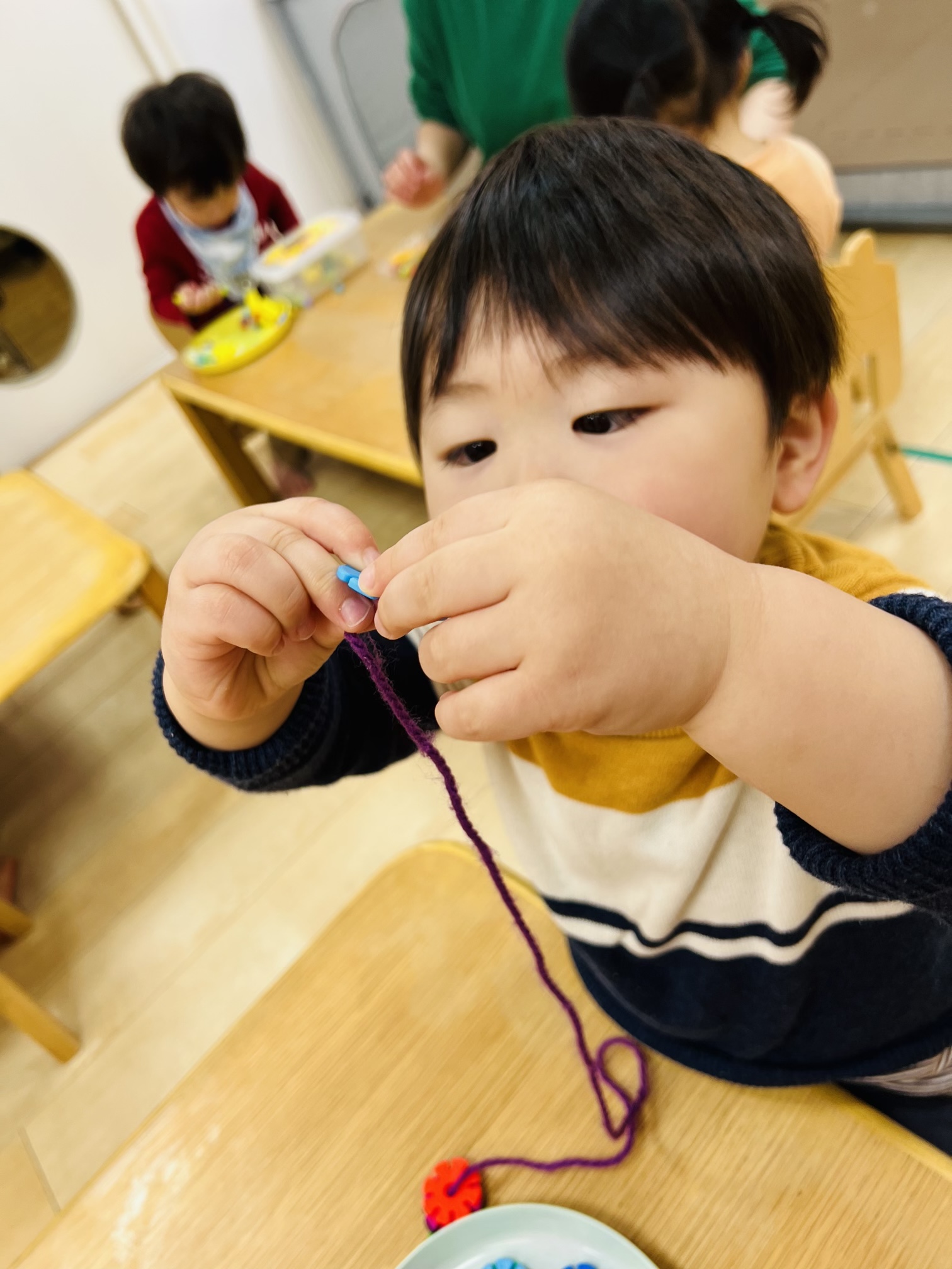 色を確認したり、好きな色だけを紐に通したり、同じ作業でも個性が出ますね😊
