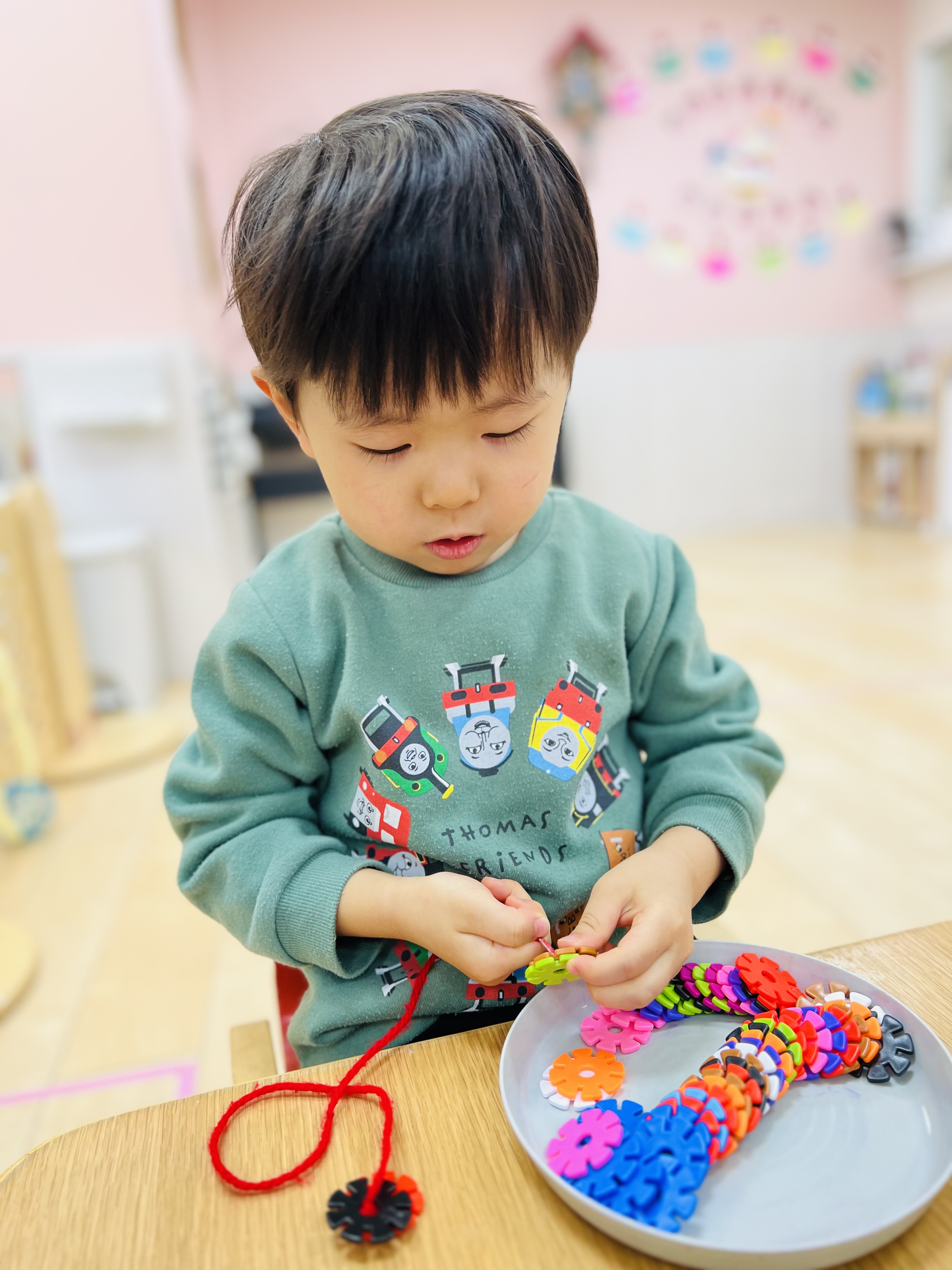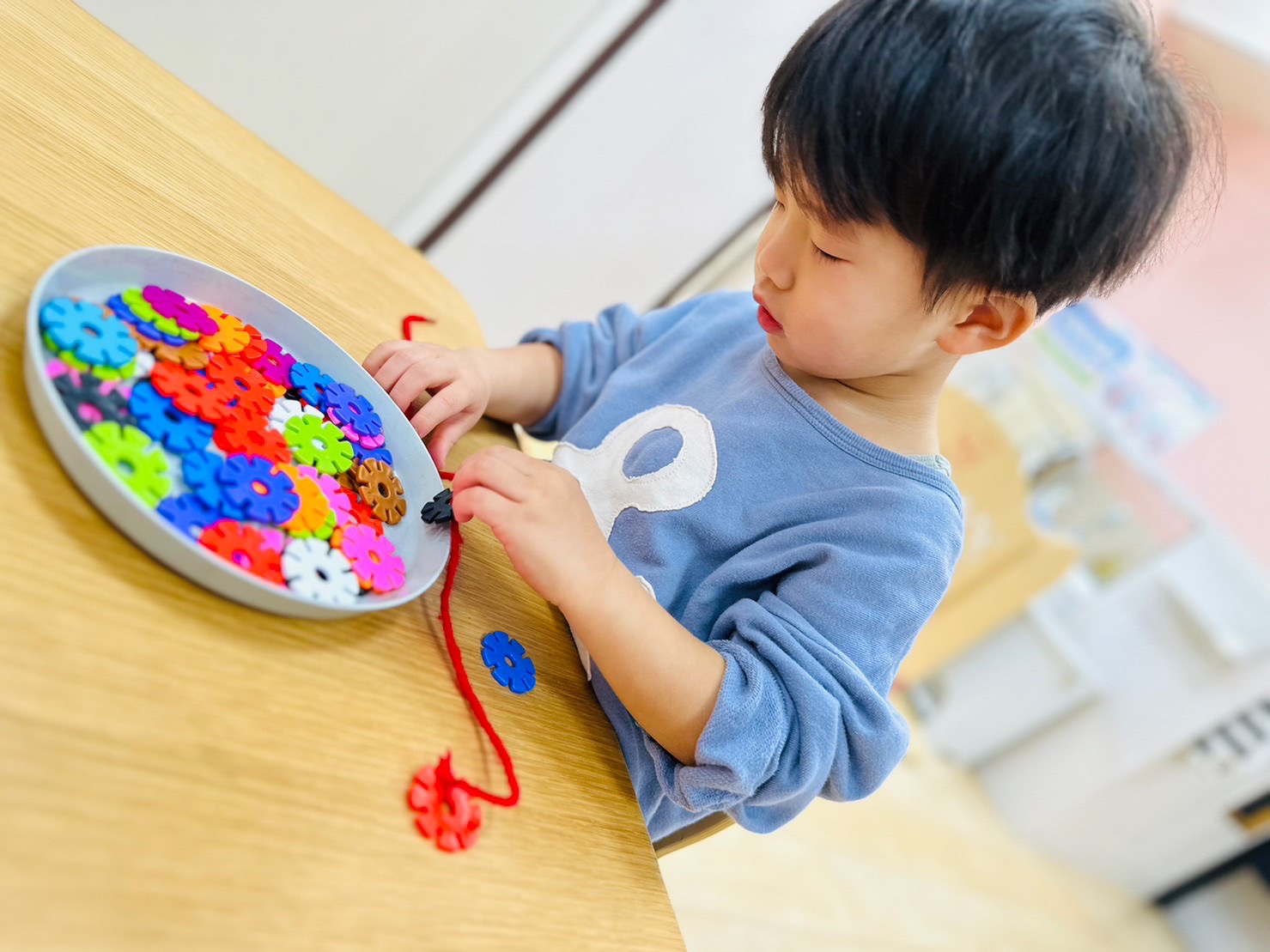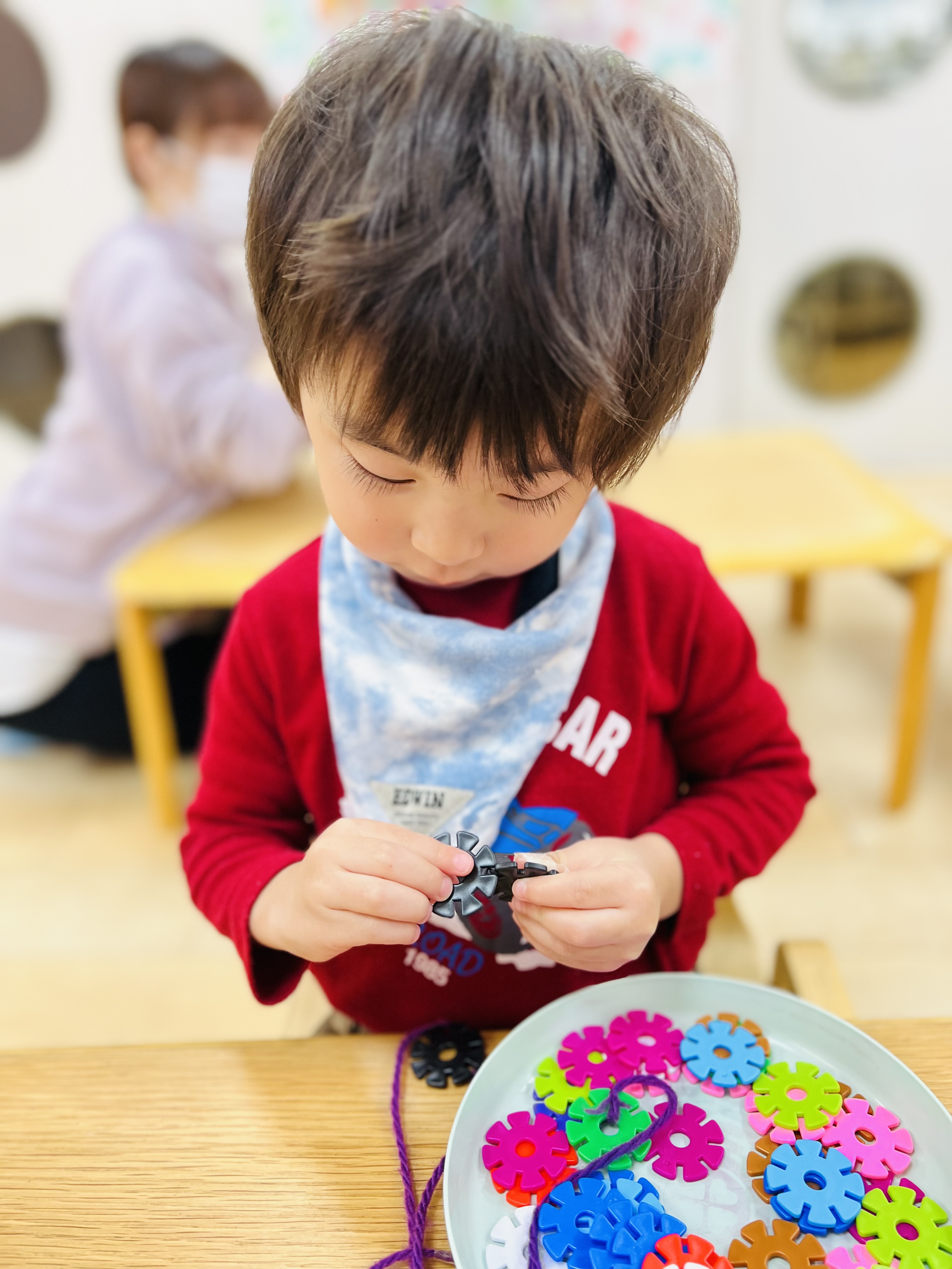 色を確認したり、好きな色だけを紐に通したり、同じ作業でも個性が出ますね😊