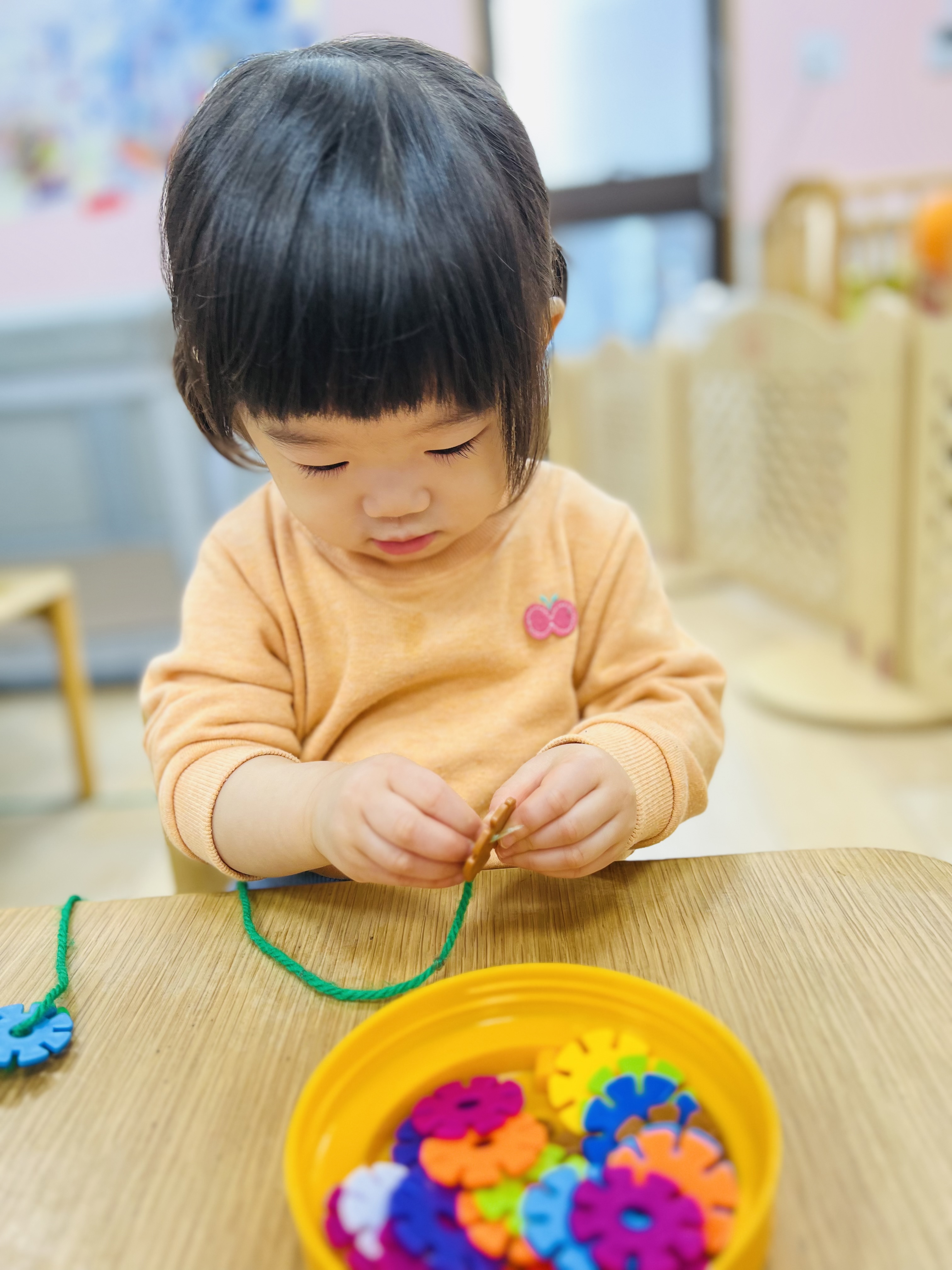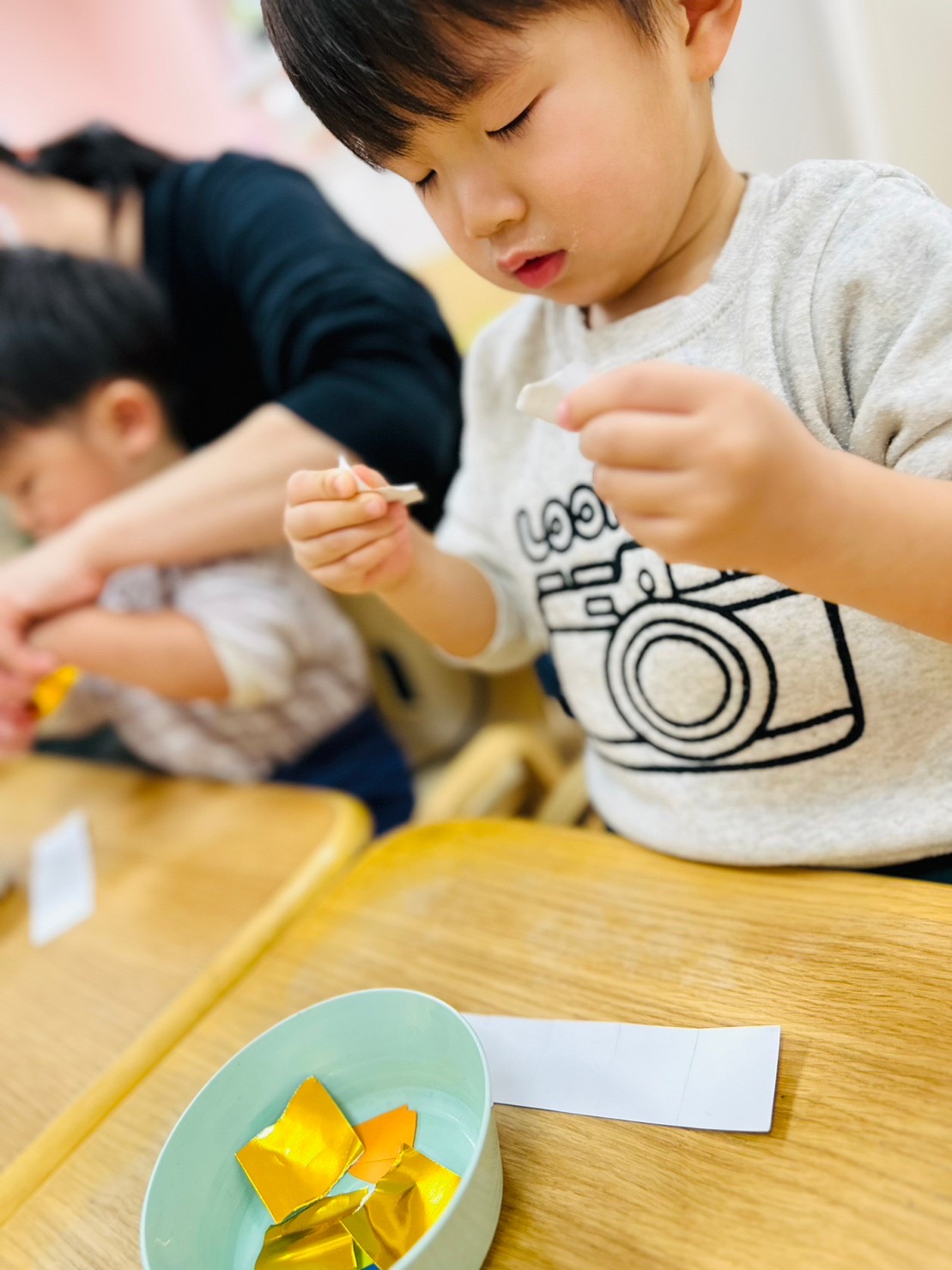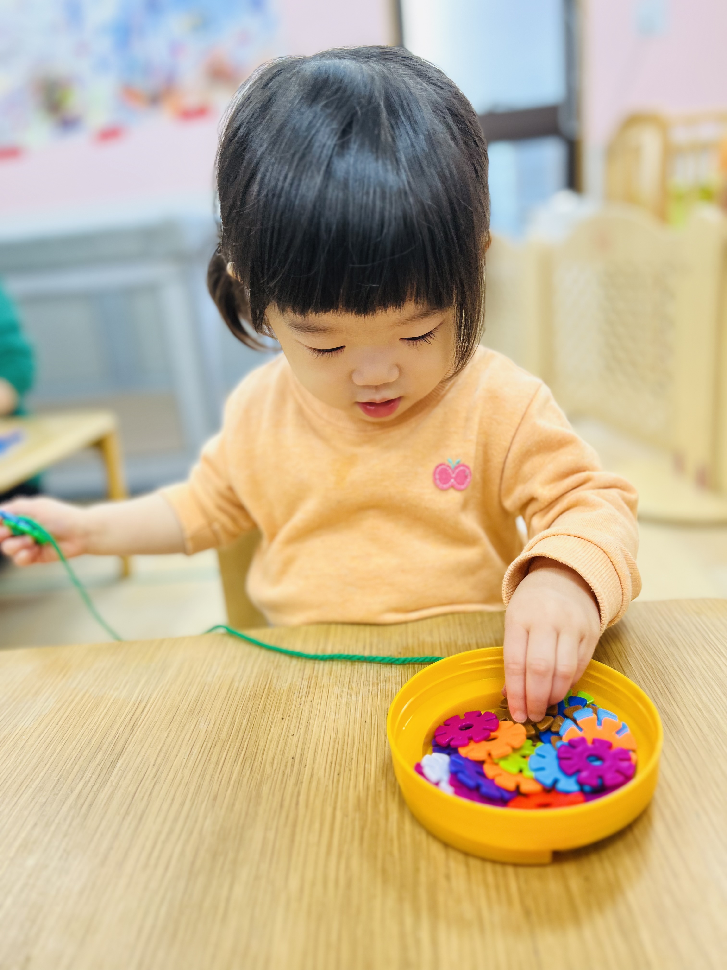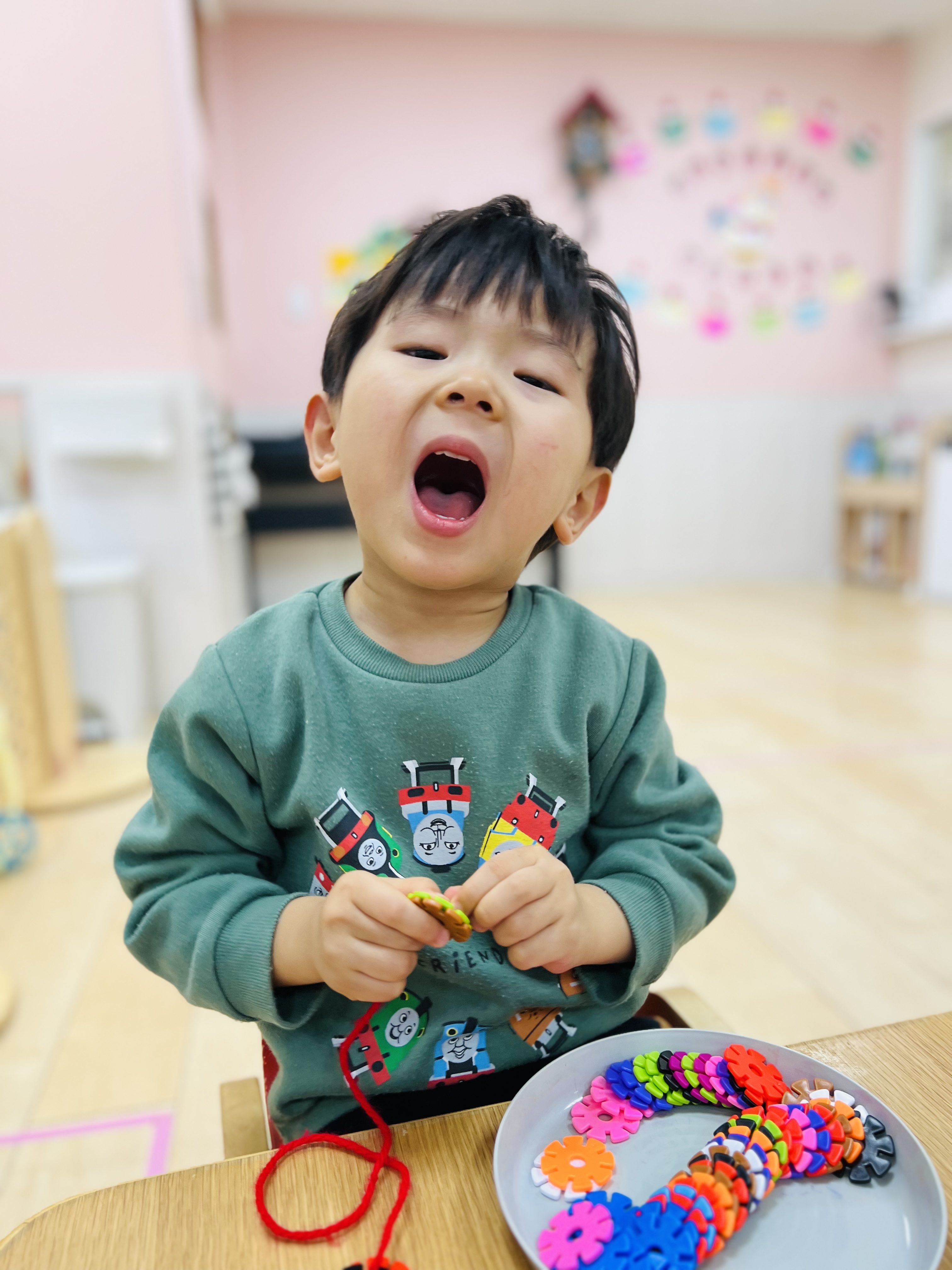 色を確認したり、好きな色だけを紐に通したり、同じ作業でも個性が出ますね😊