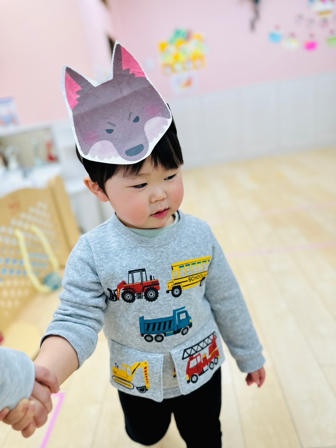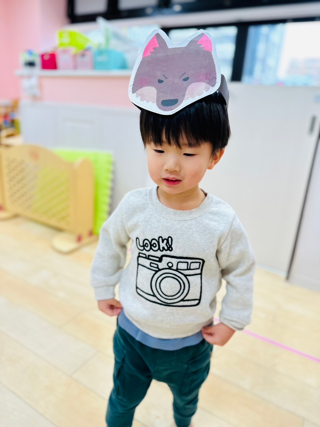 可愛いオオカミのお面ですが、逃げるお友達は先生にしがみつき、とっても必死に逃げますよ😊その反面、オオカミ役になるとみんな張り切り、ガォーー❗️と追いかけて楽しそうです♫