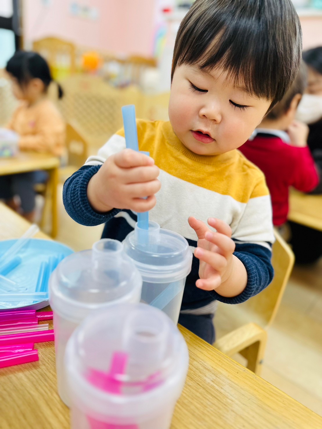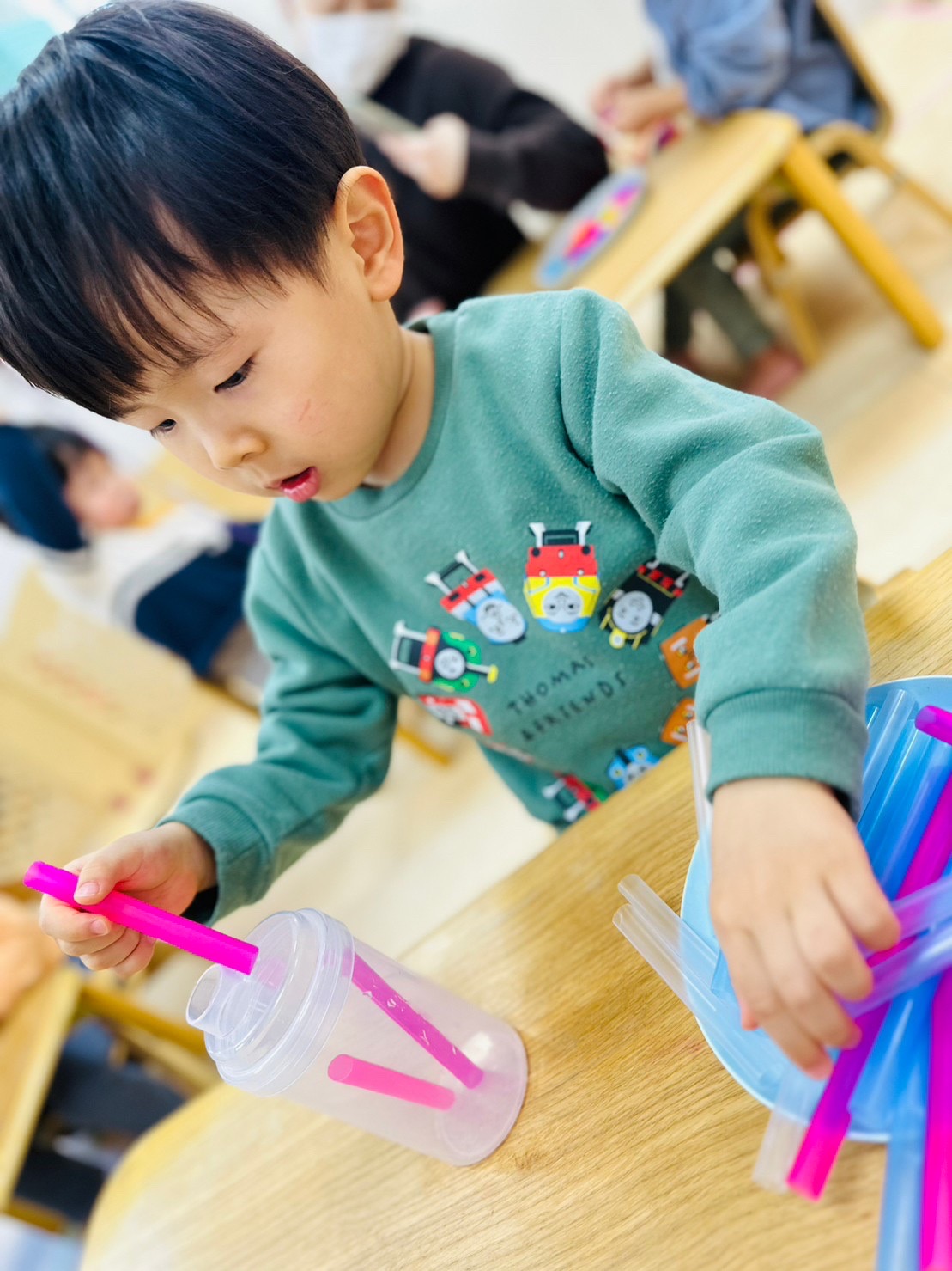 紐通しやお箸の練習、ストローのポットン落としが用意されました♫