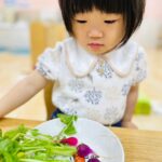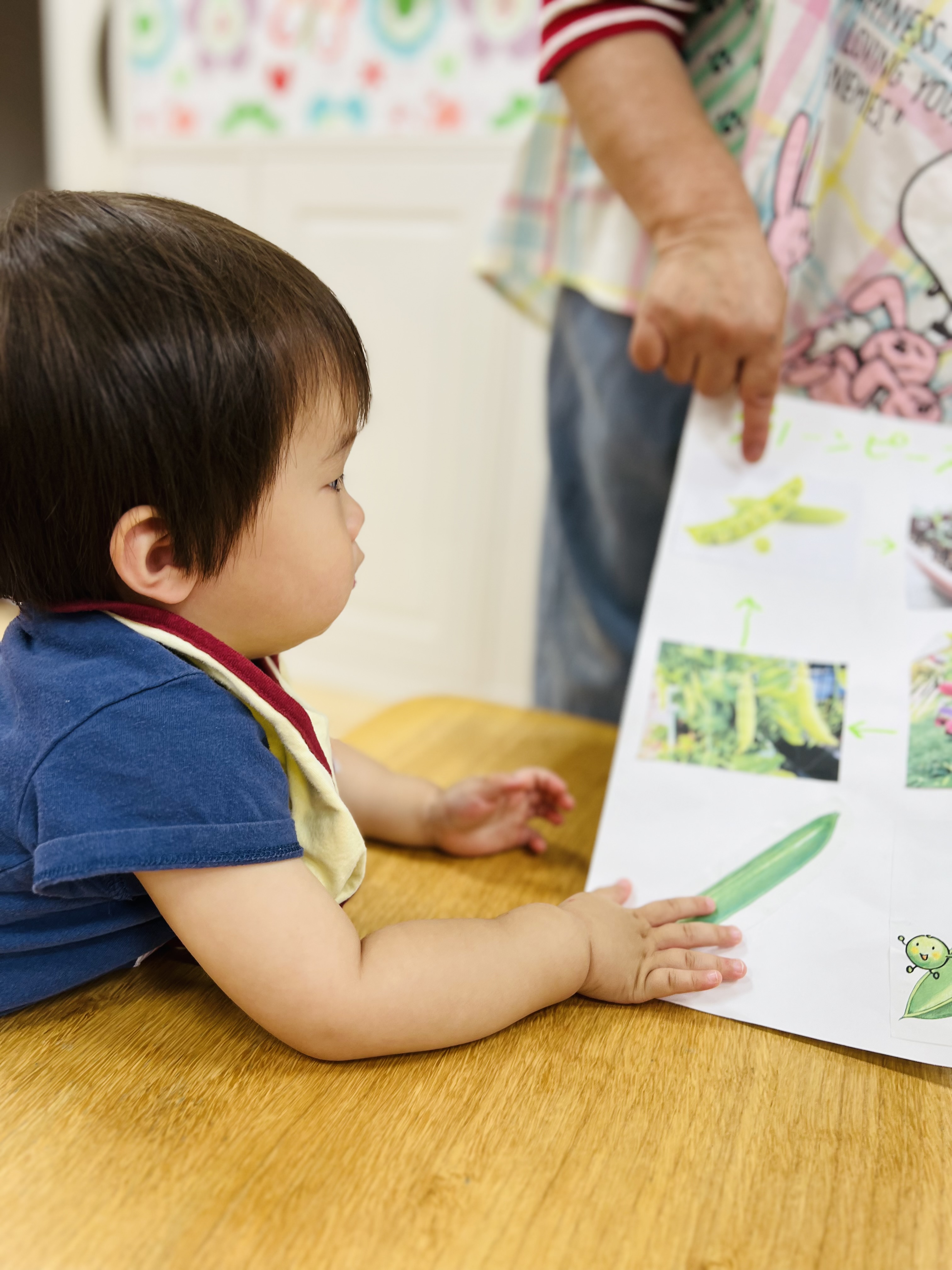 調理の先生にお花はどんな風に咲いているのか、グリーンピースはどうやって育つのかお話してもらいました😊