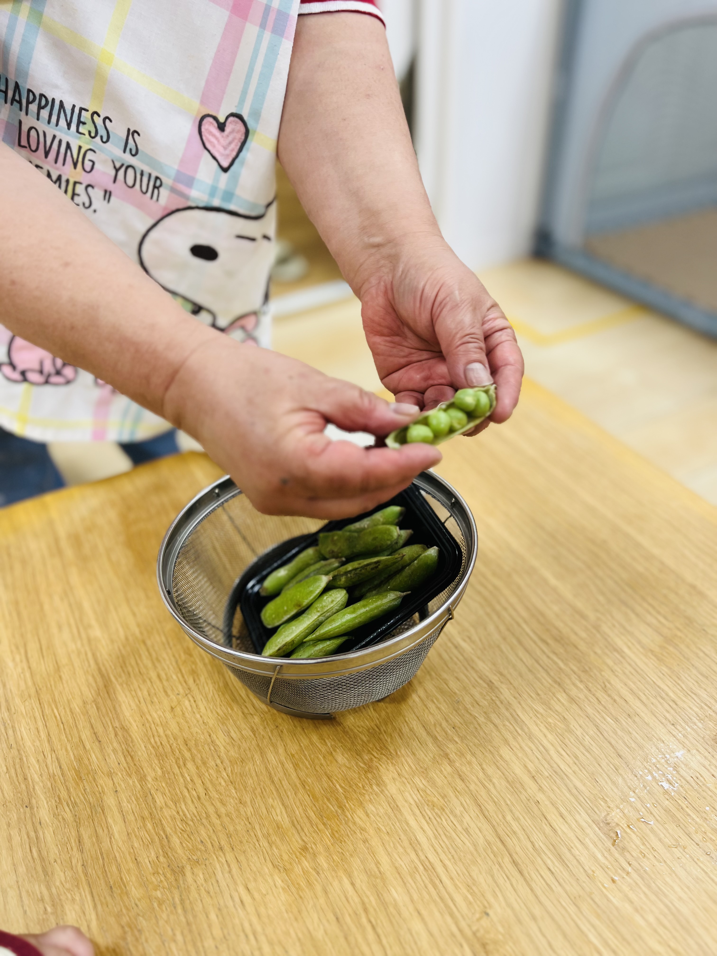 今日はグリーンピースの皮剥き体験をしましたよ🫛