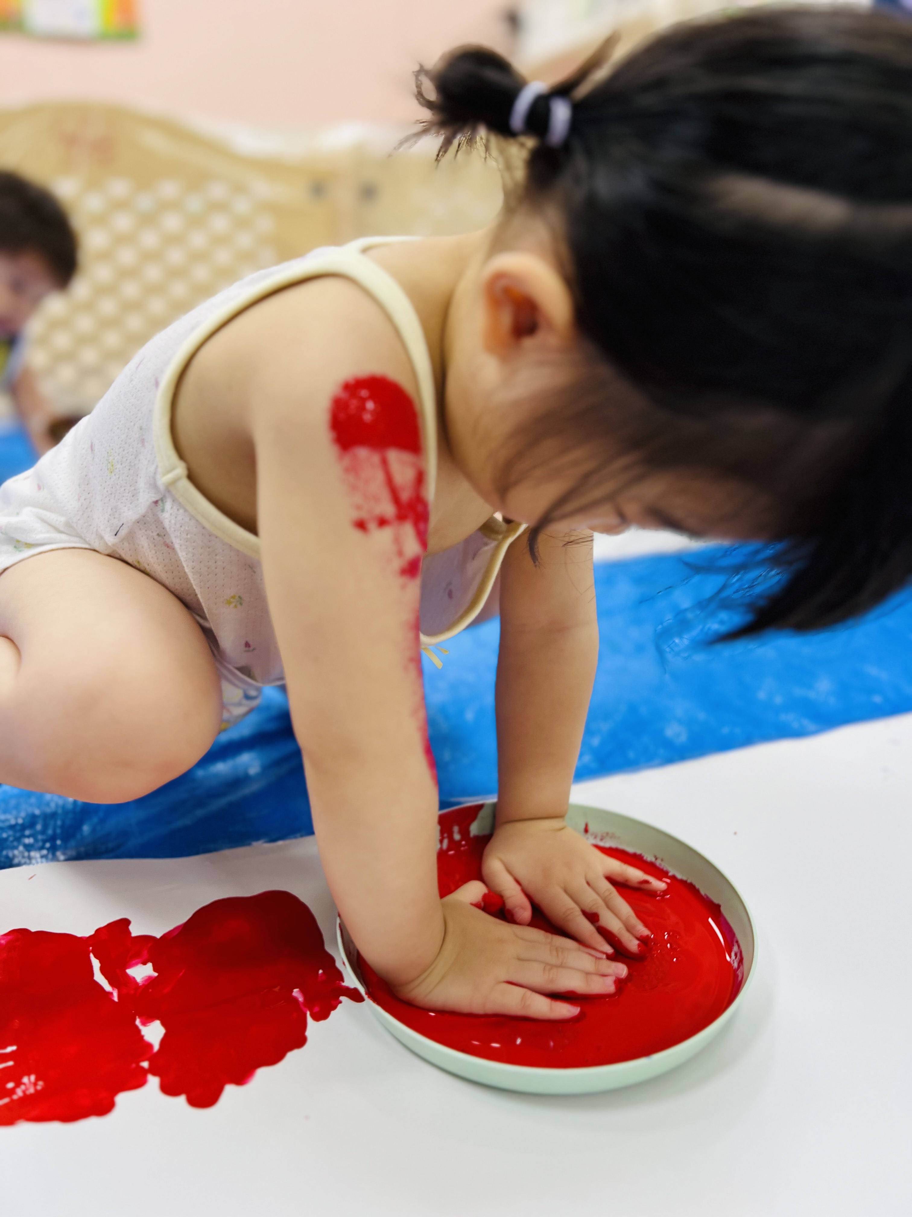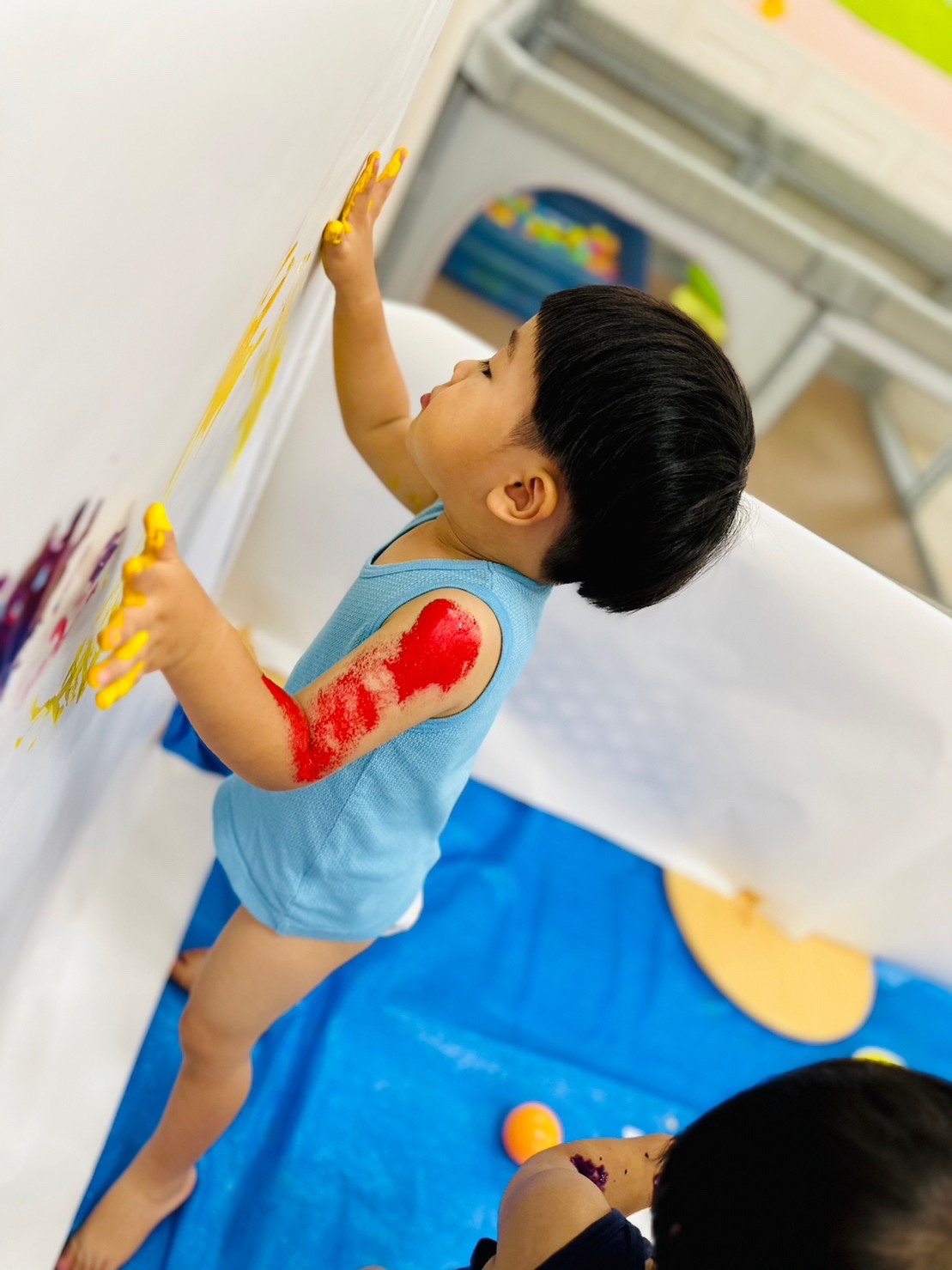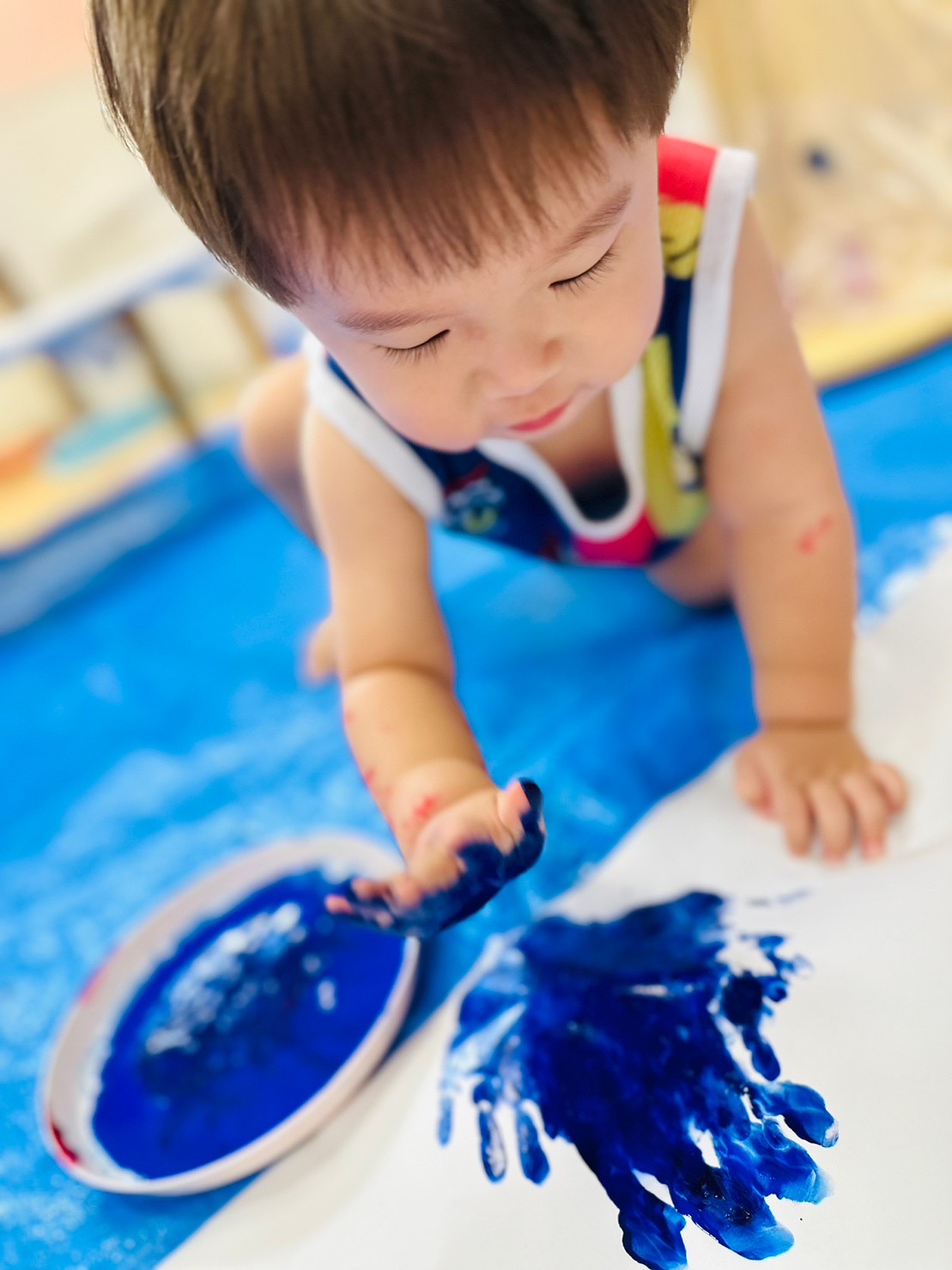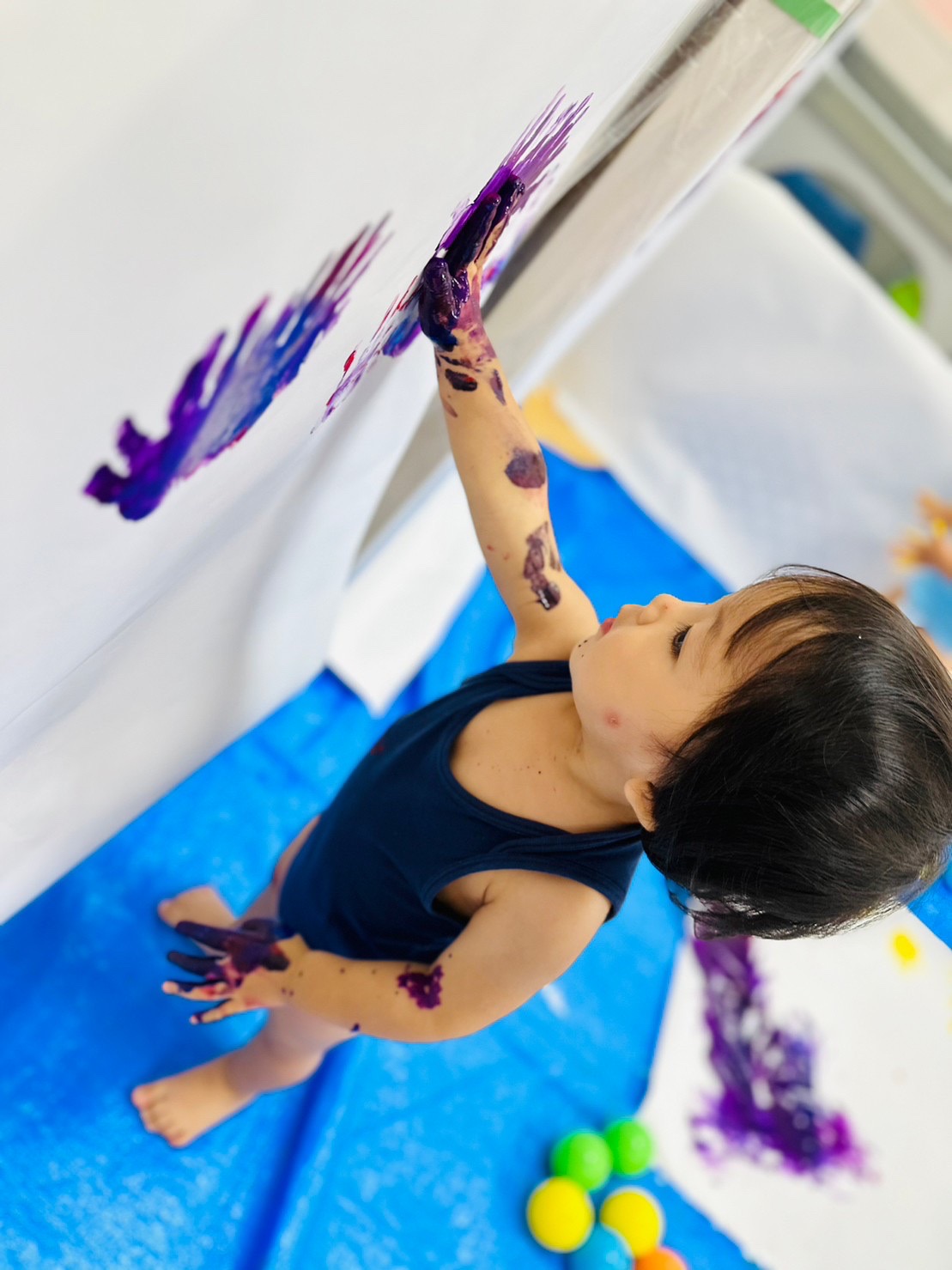 たくさんの模造紙にも手形をたくさんつけたり、絵の具をのばしたり、とっても楽しそうでした🎵