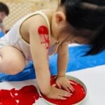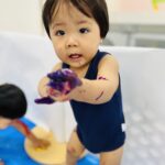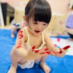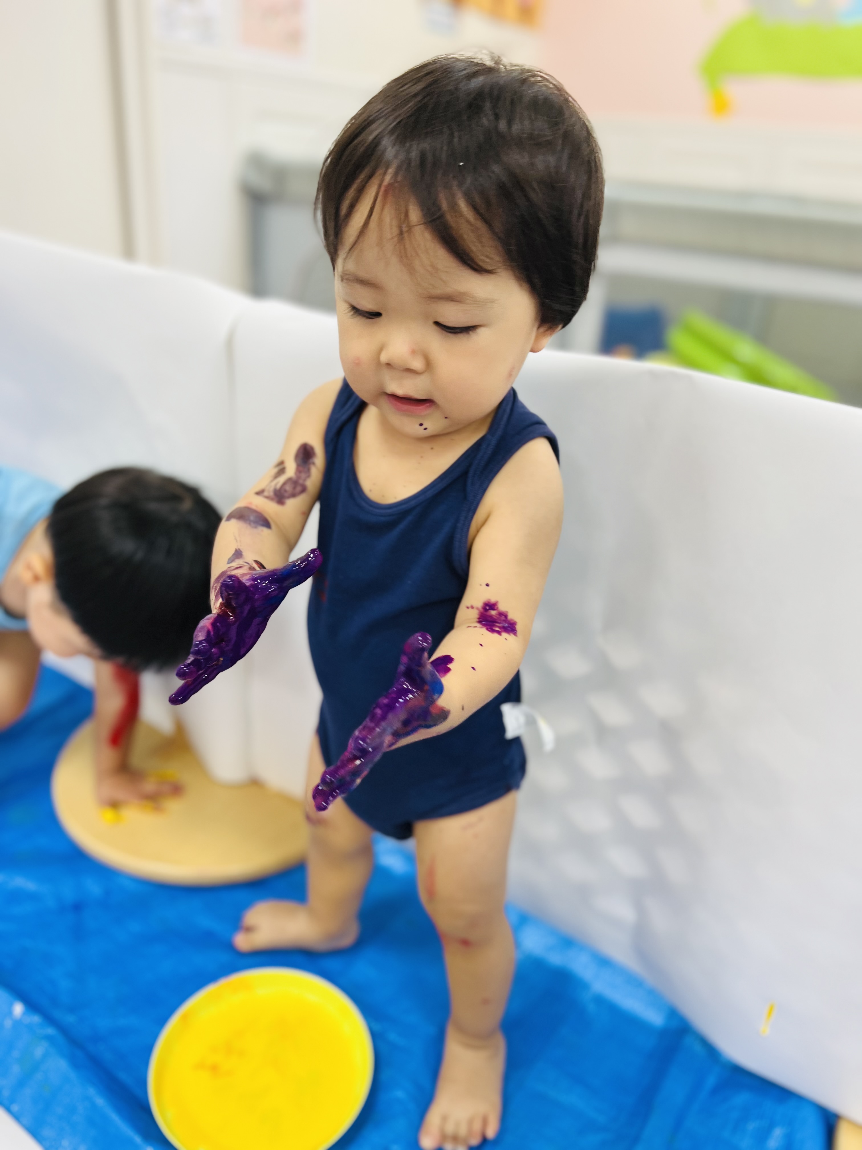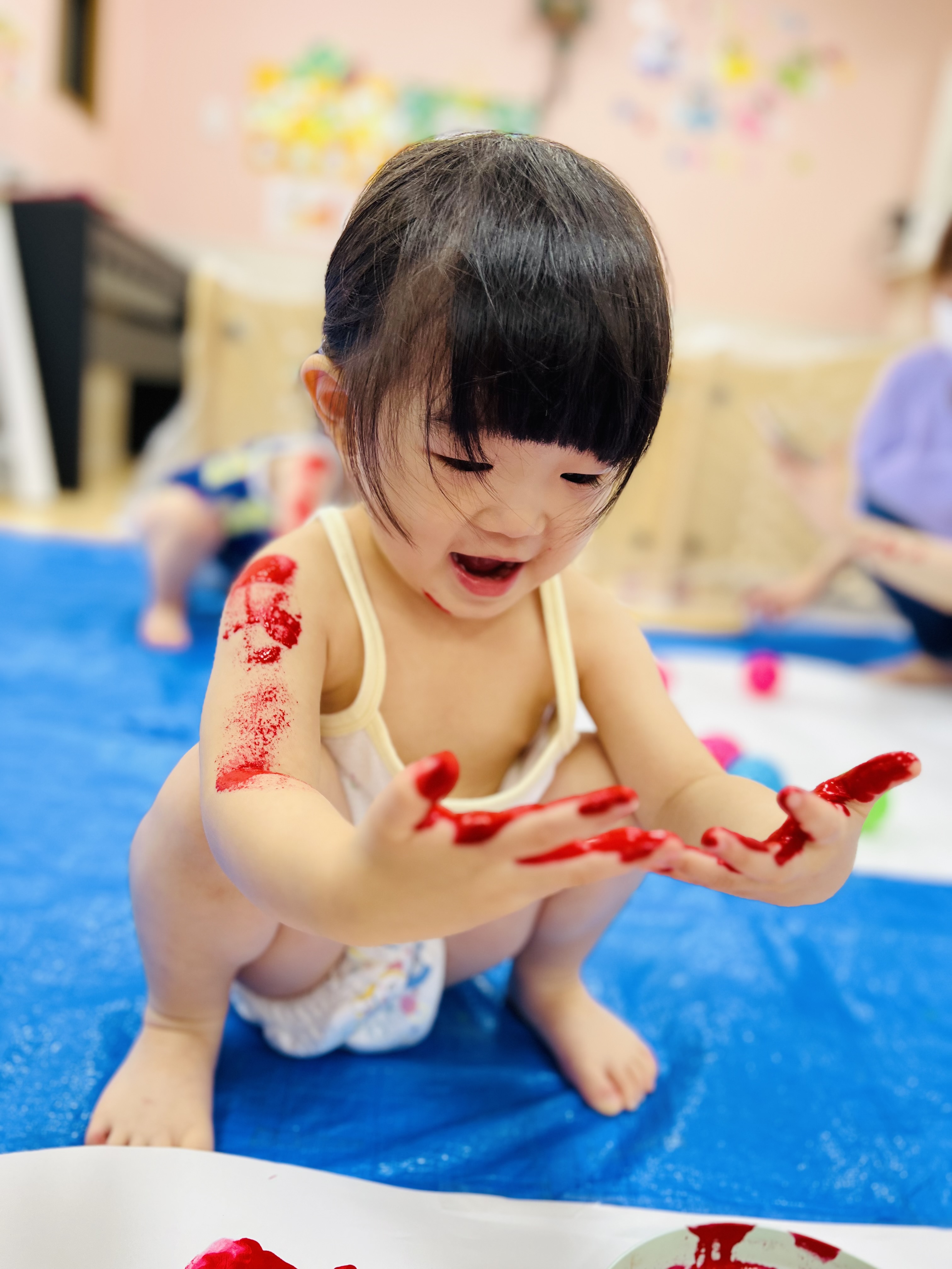 手や体についた絵の具に大喜びな子ども達😊