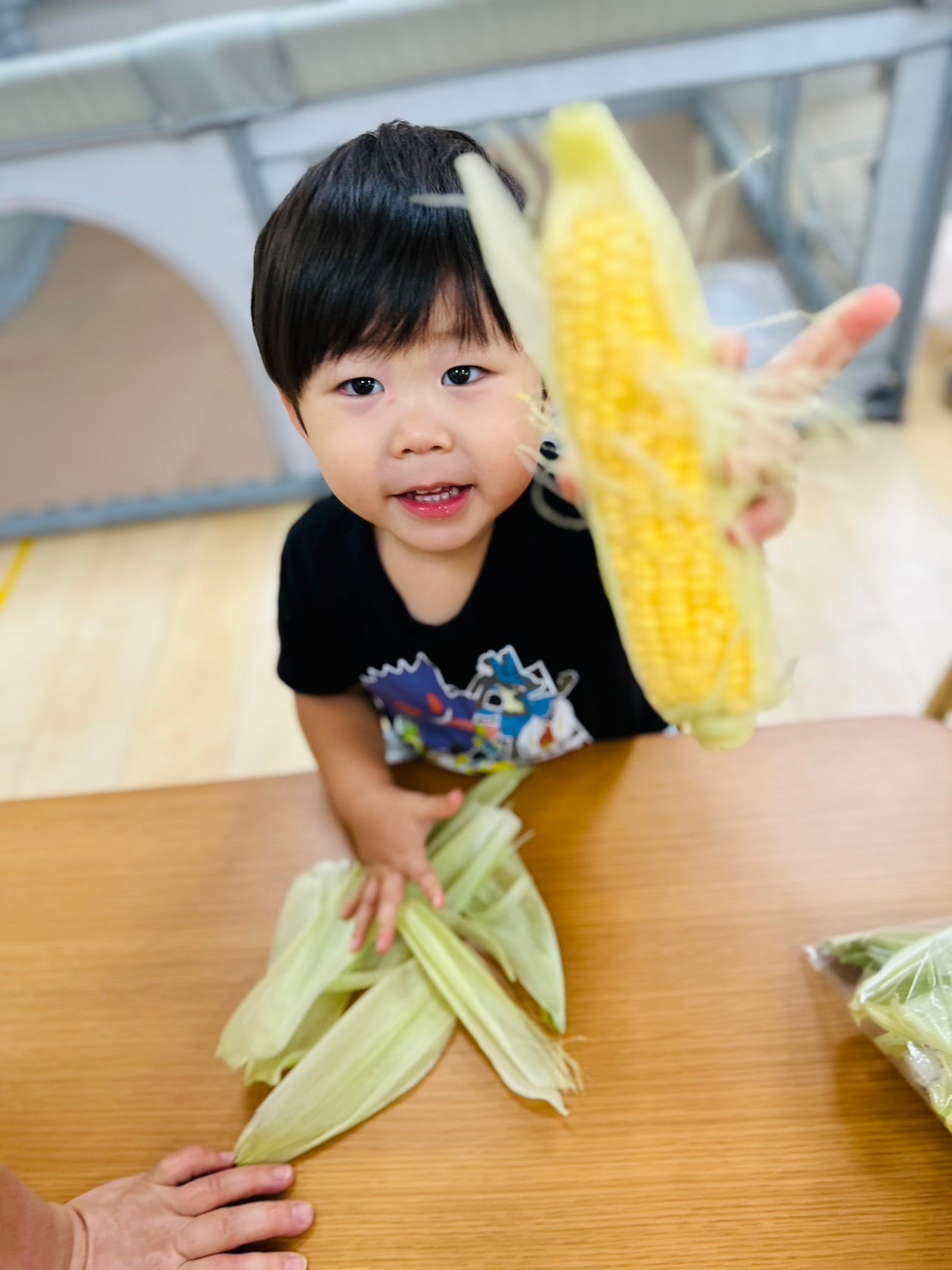 とうもろこしのヒゲにちょっとドキドキしながら、力一杯皮剥き頑張りました😊