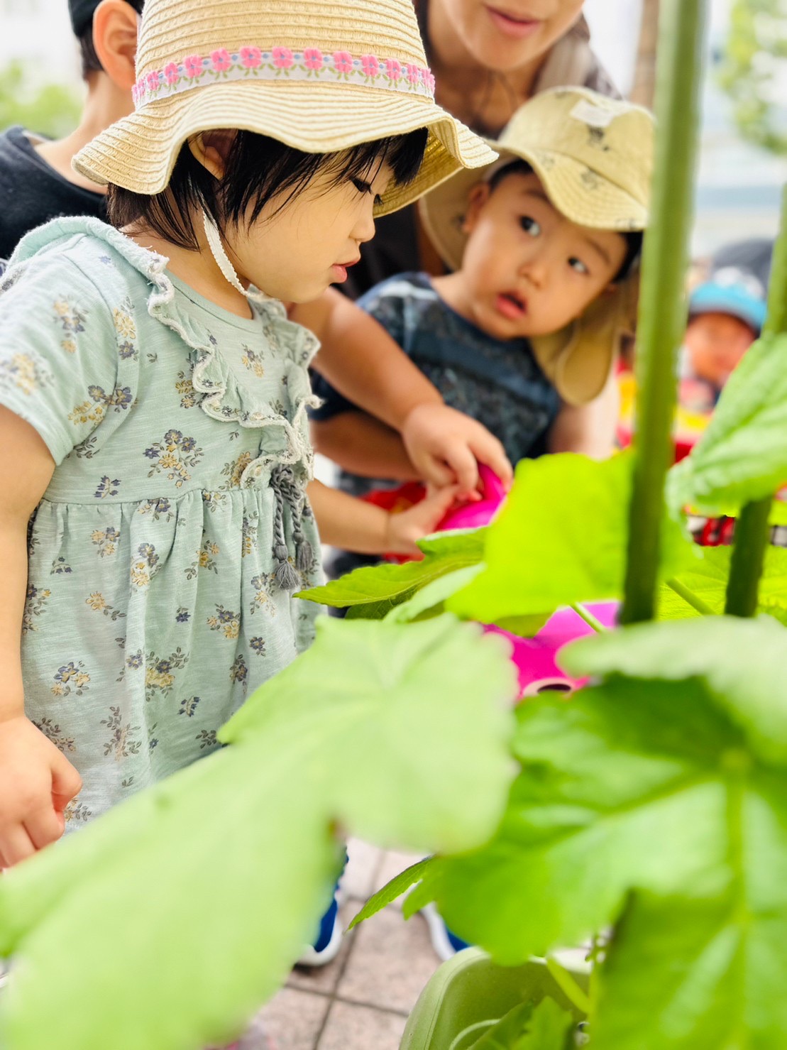 保育園の外では大きくなったら野菜の苗が😊
