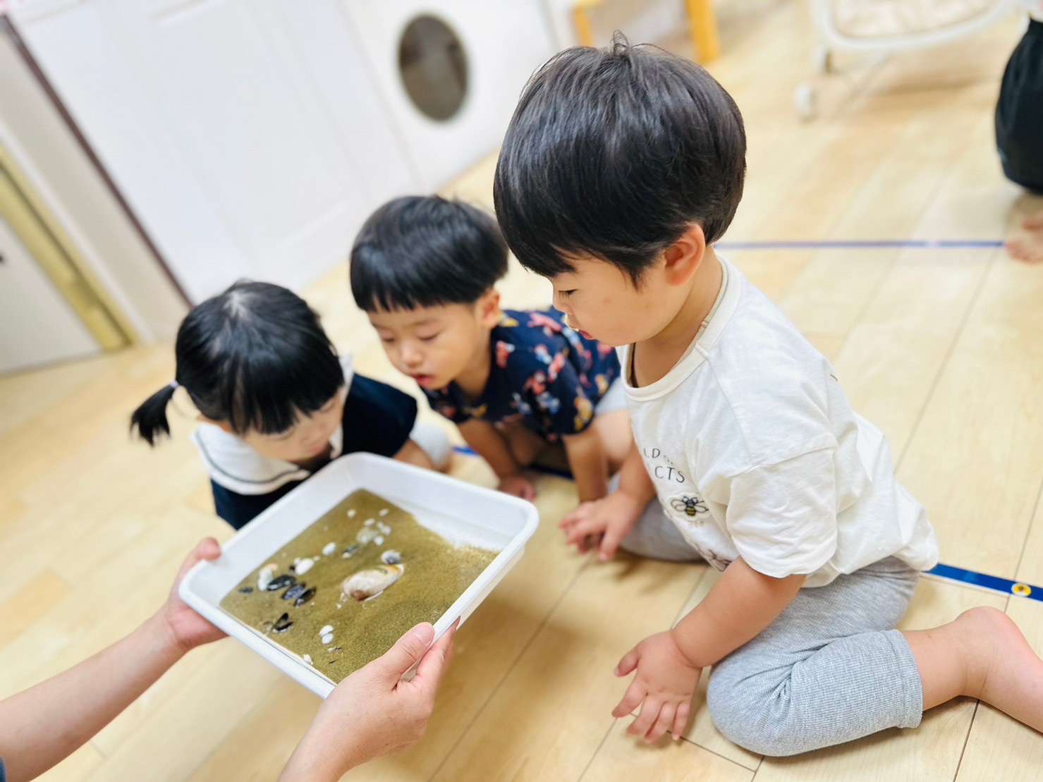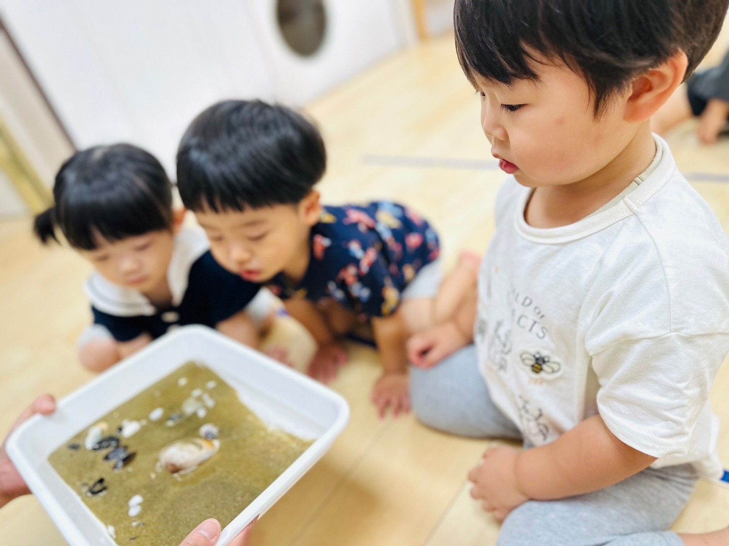 小さな砂がサラサラだったり、水が動くと貝殻が見えて喜んで声をあげてる子ども達でした😊