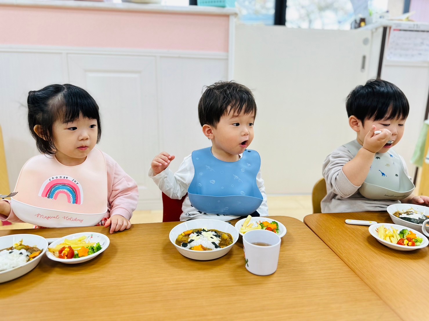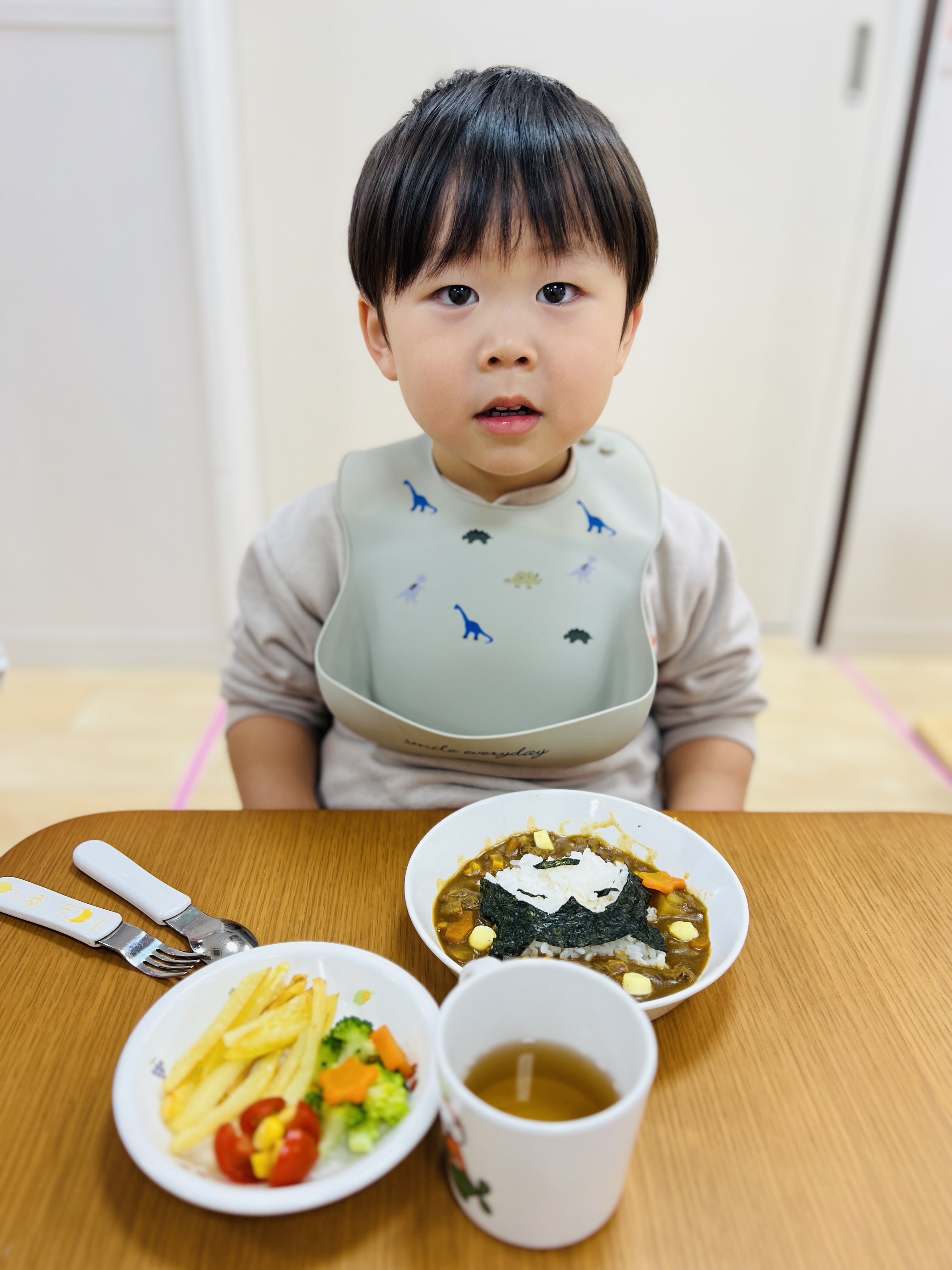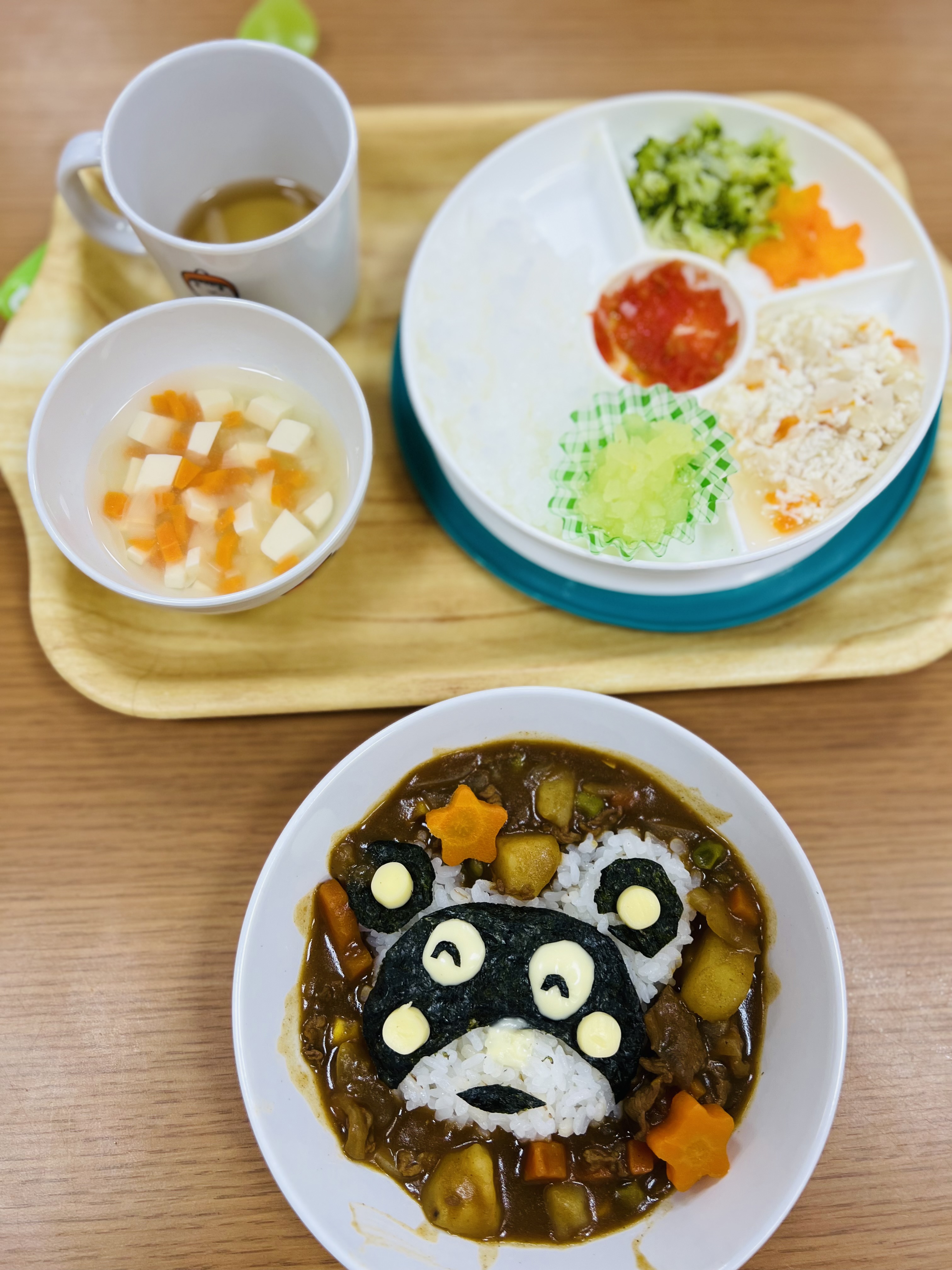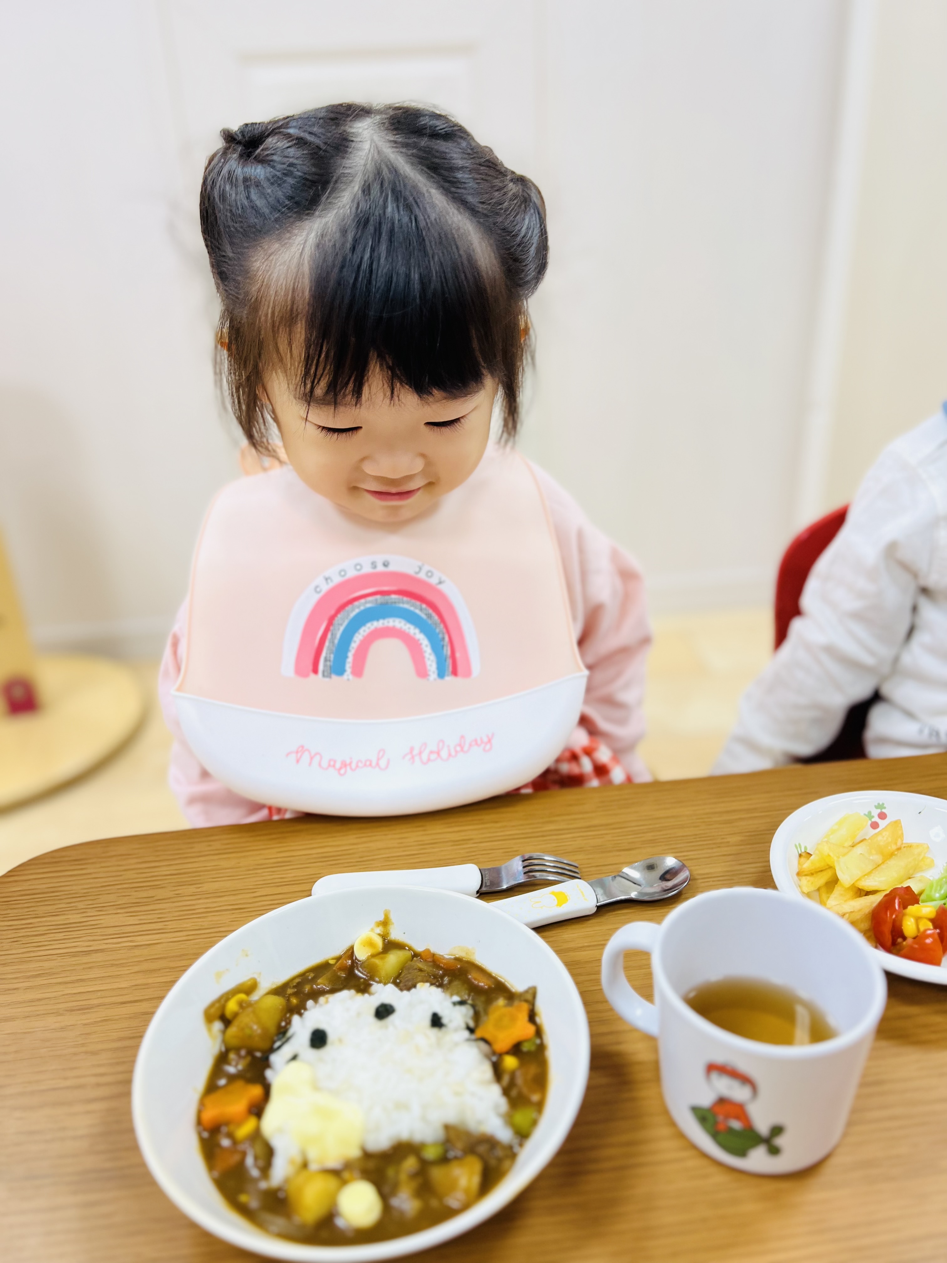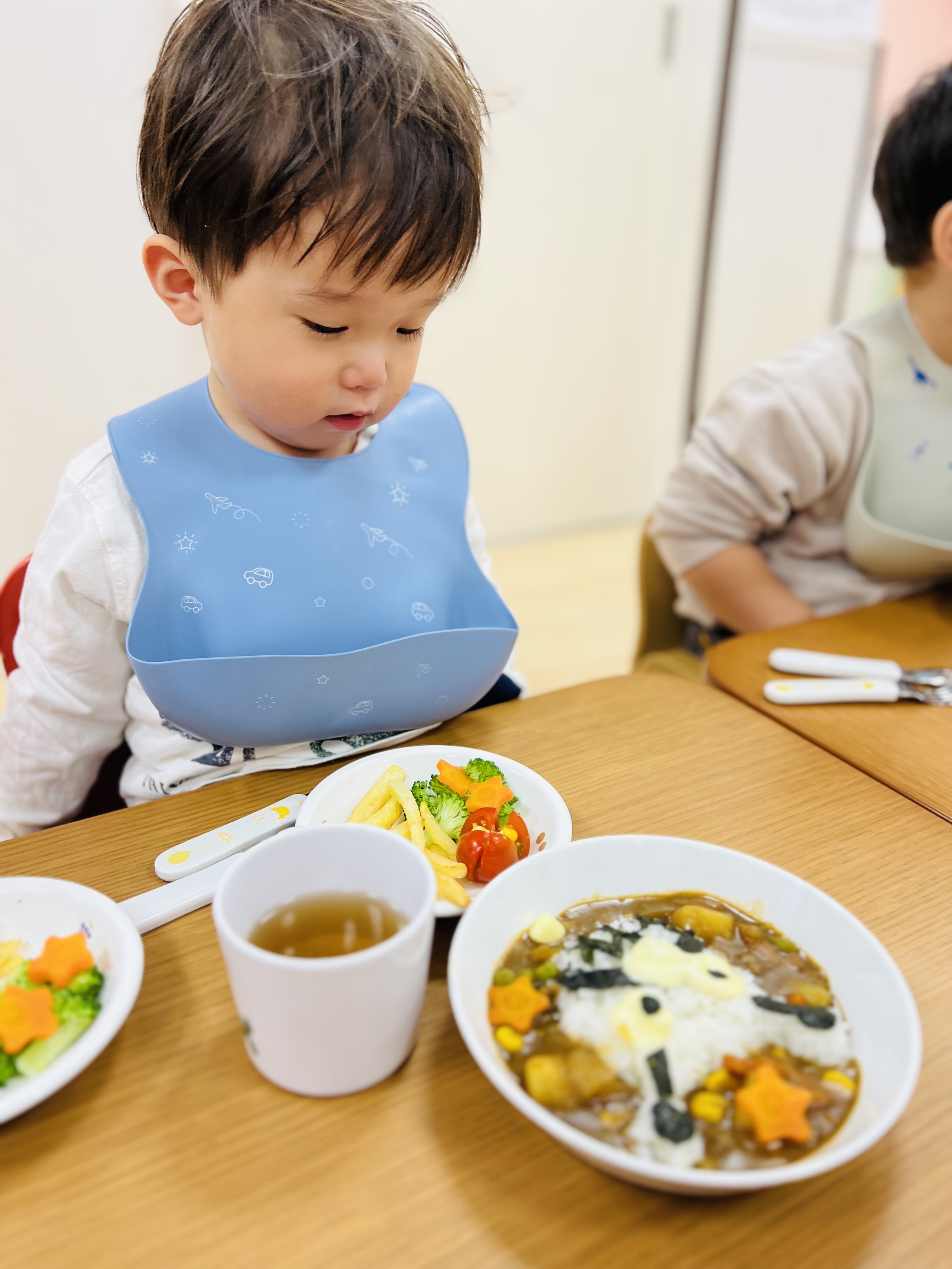 可愛いキャラクターのカレーライスになかなか食べ始めれないお友達😊